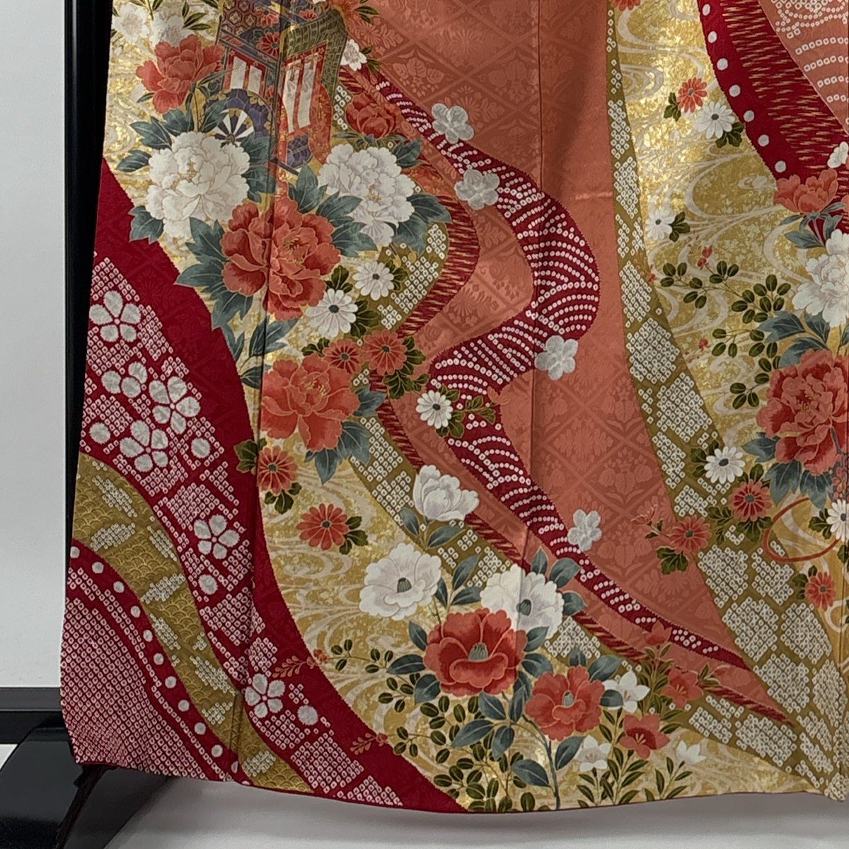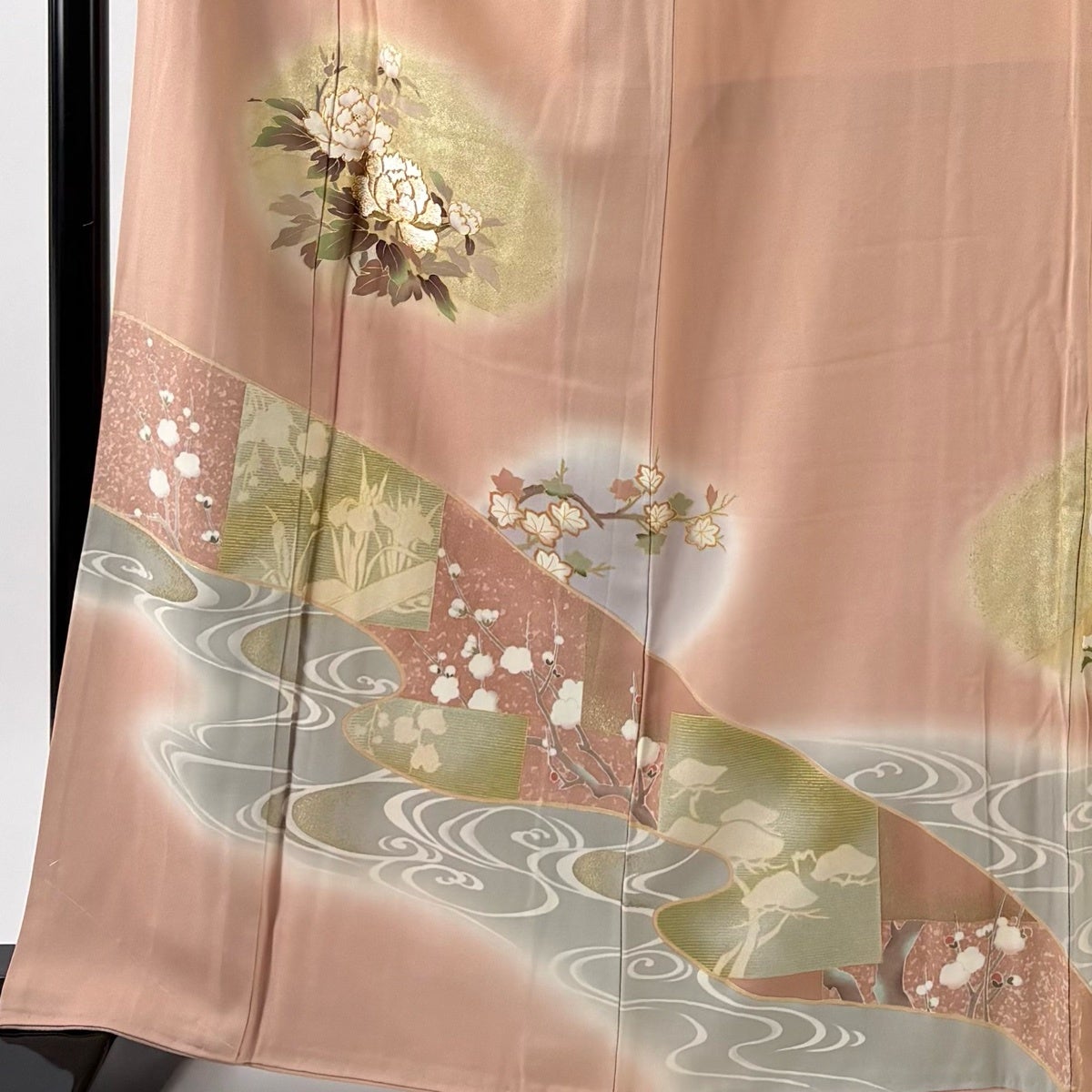 【美品】 色留袖 身丈166cm 裄丈66cm M 袷 牡丹 流水 刺繍 金糸 ピンクベージュ 正絹 秀品 一つ紋