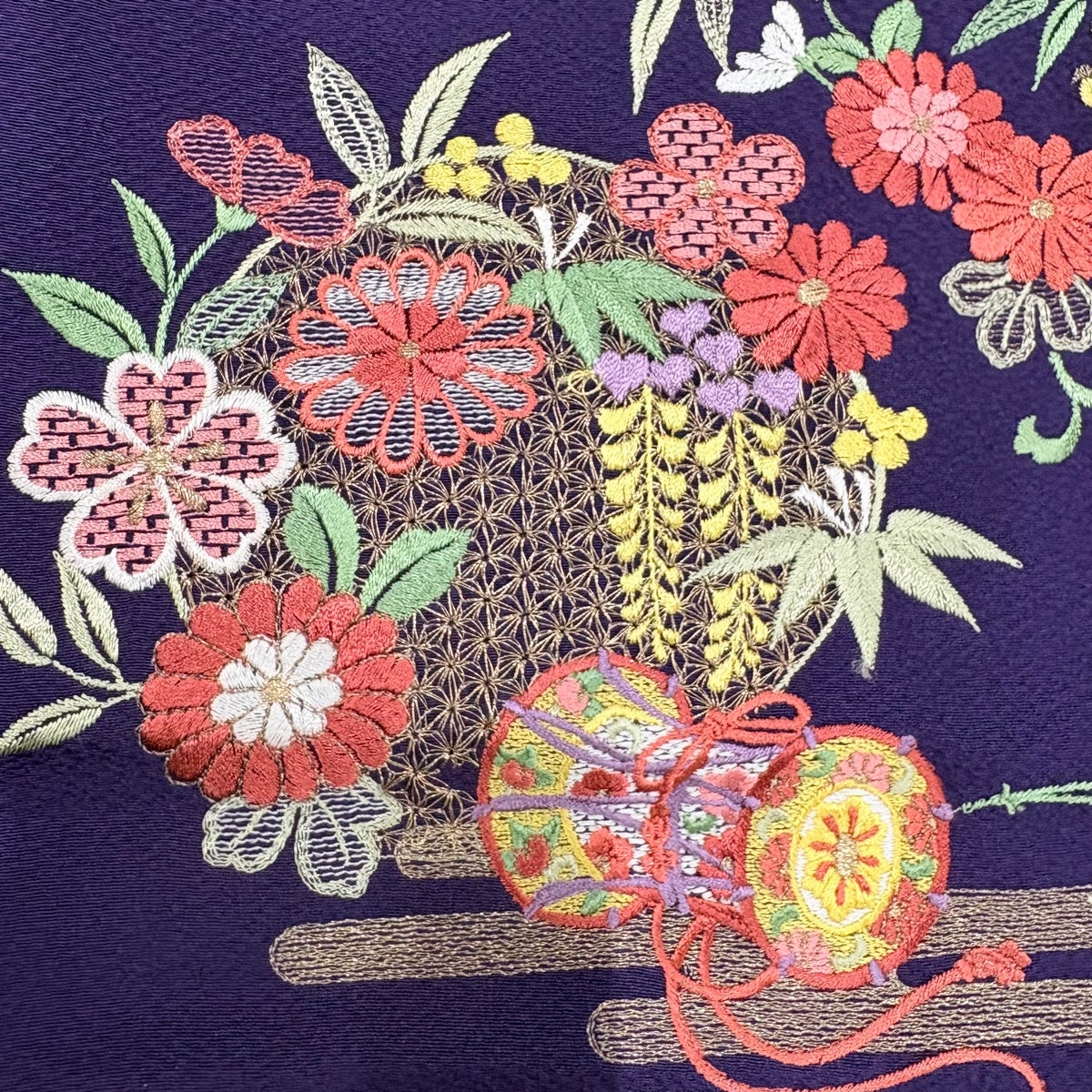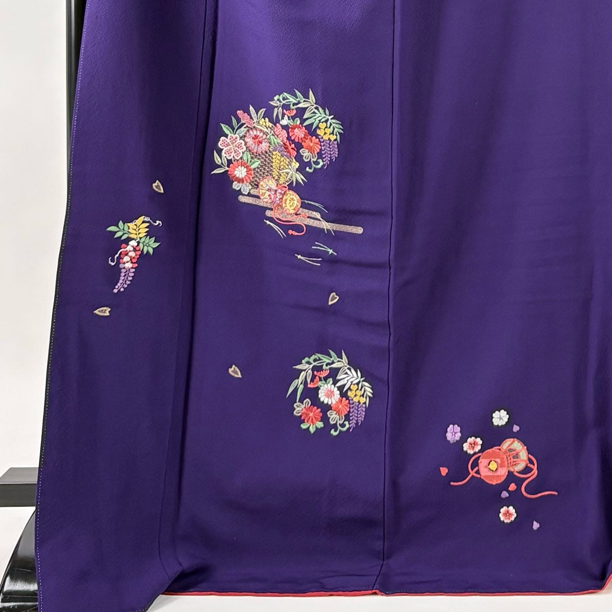 振袖 身丈173cm 裄丈70cm L 袷 花丸文 鼓 金糸 刺繍 紫 正絹 秀品