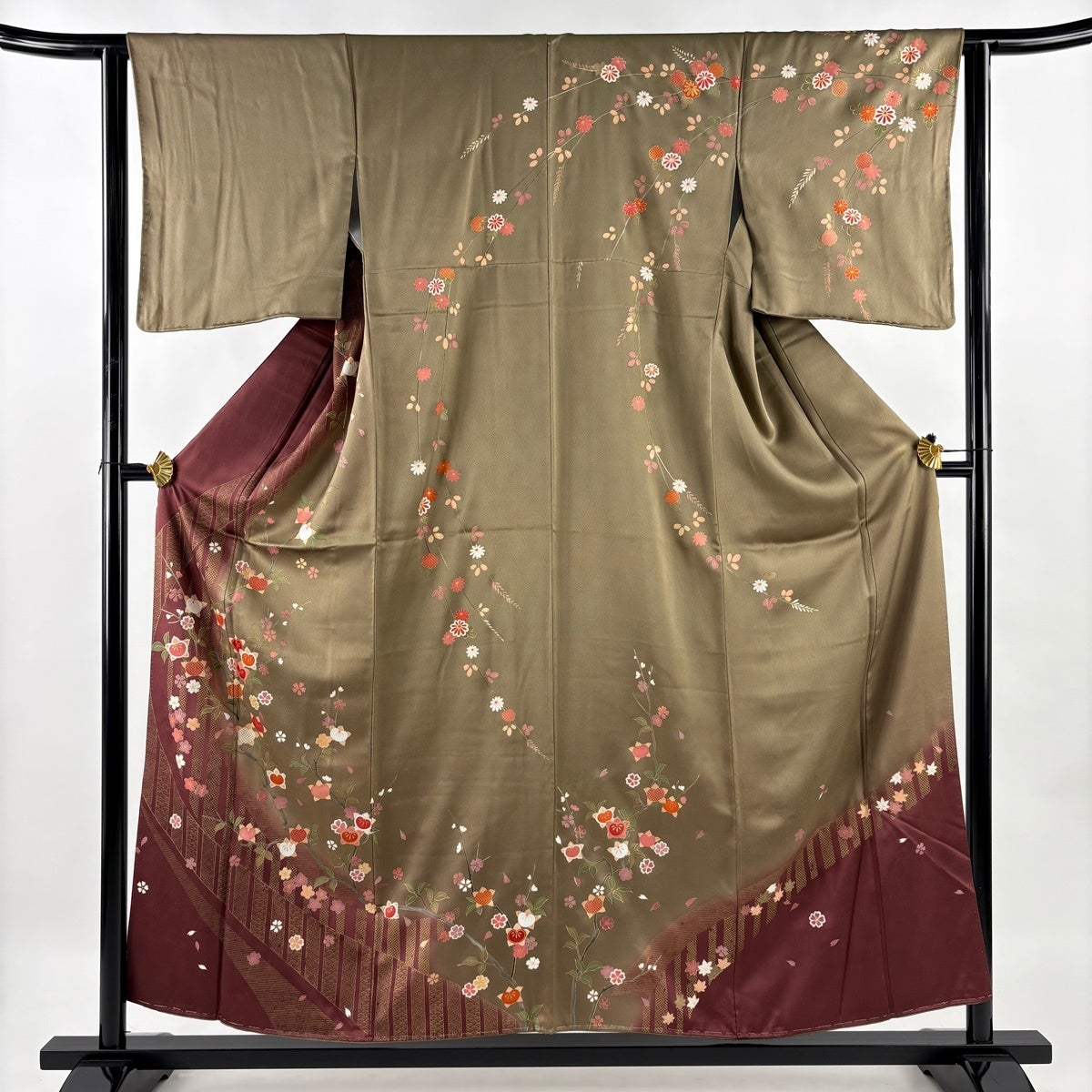 訪問着 身丈156cm 裄丈62.5cm S 袷 橘 桜 金彩 染め分け 茶緑色 正絹 秀品