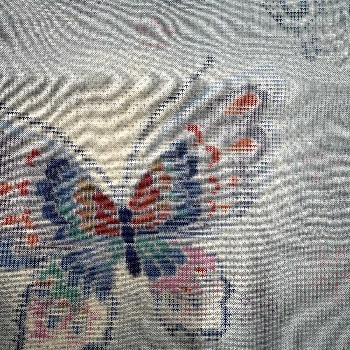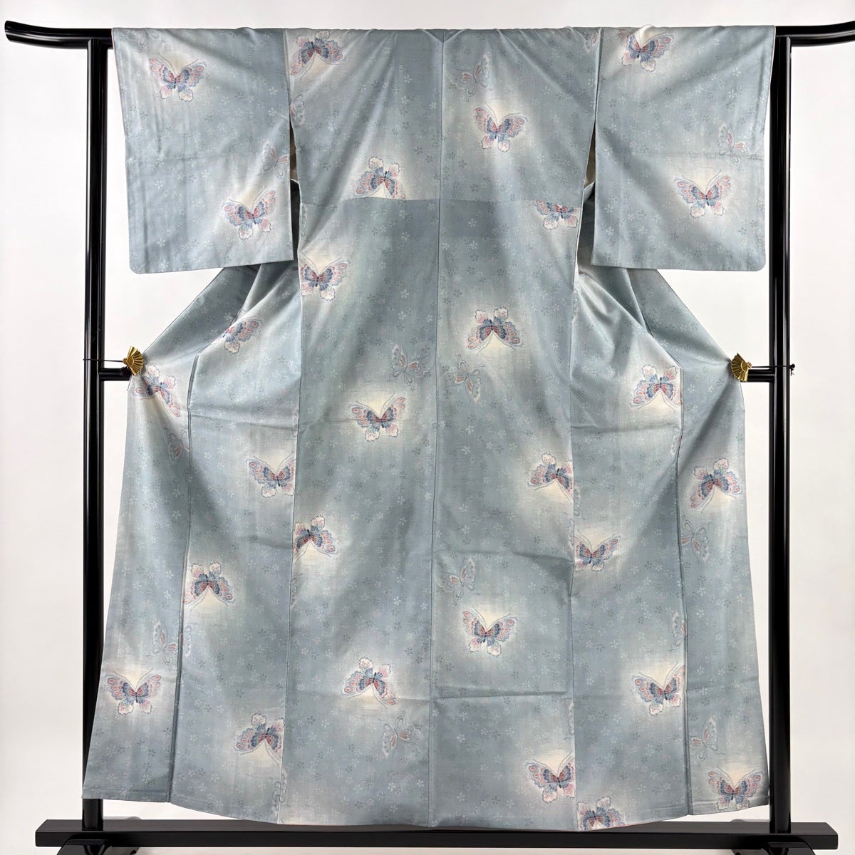 【美品】 紬 身丈158cm 裄丈63cm S 袷 蝶 花 青灰色 正絹 秀品