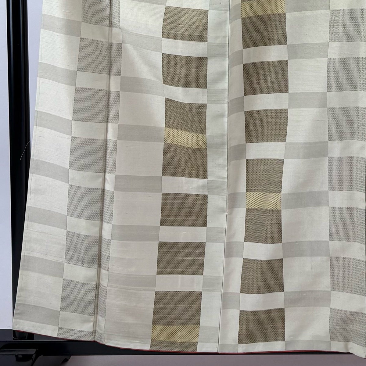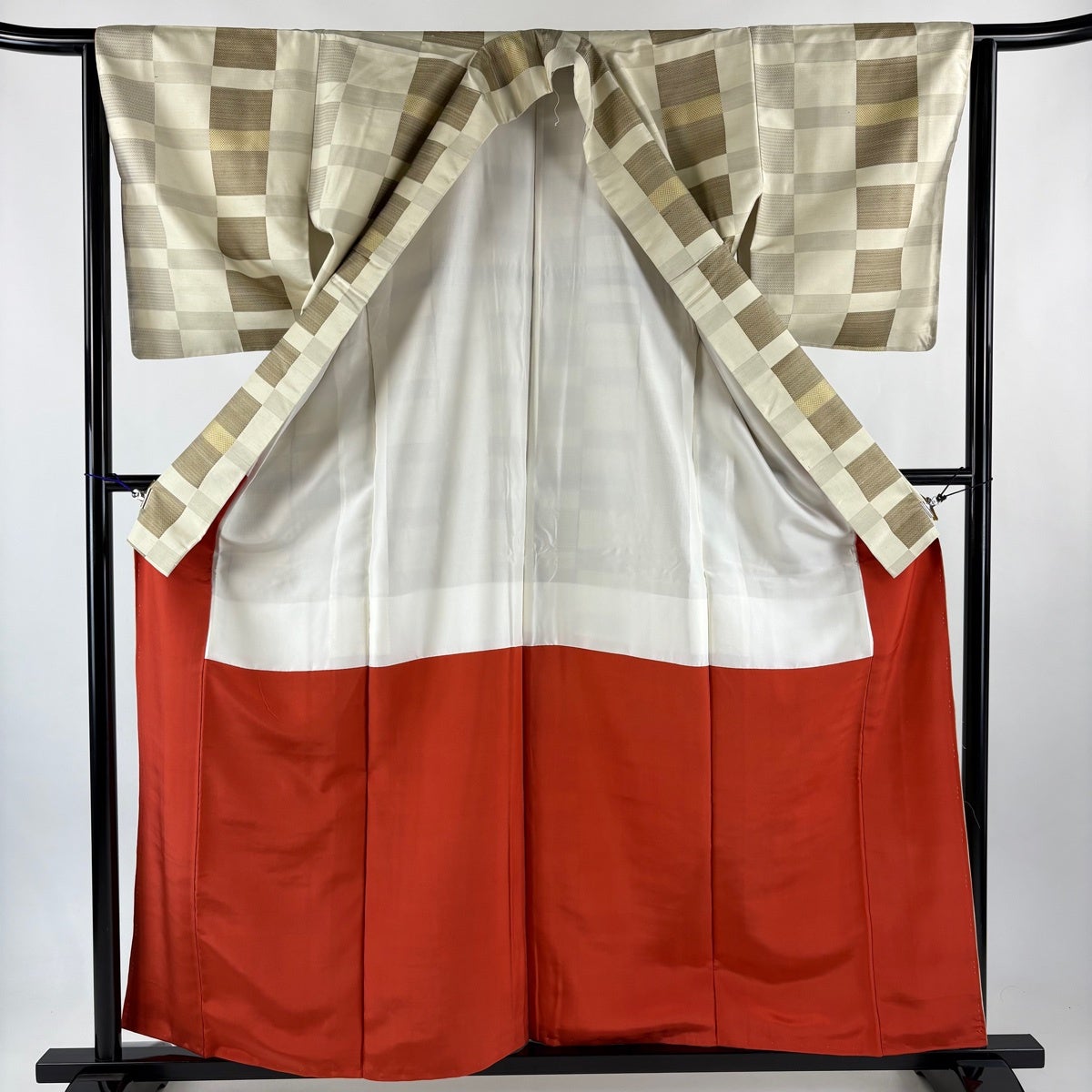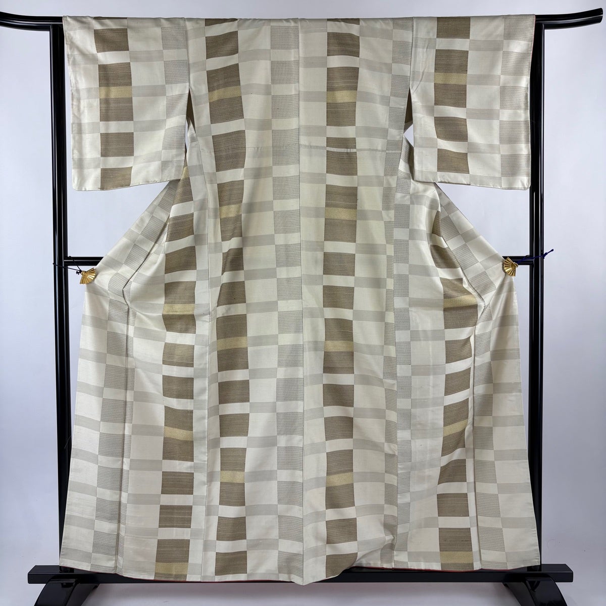 【美品】 紬 身丈159.5cm 裄丈63cm S 袷 変わり市松 ベージュ 正絹 秀品