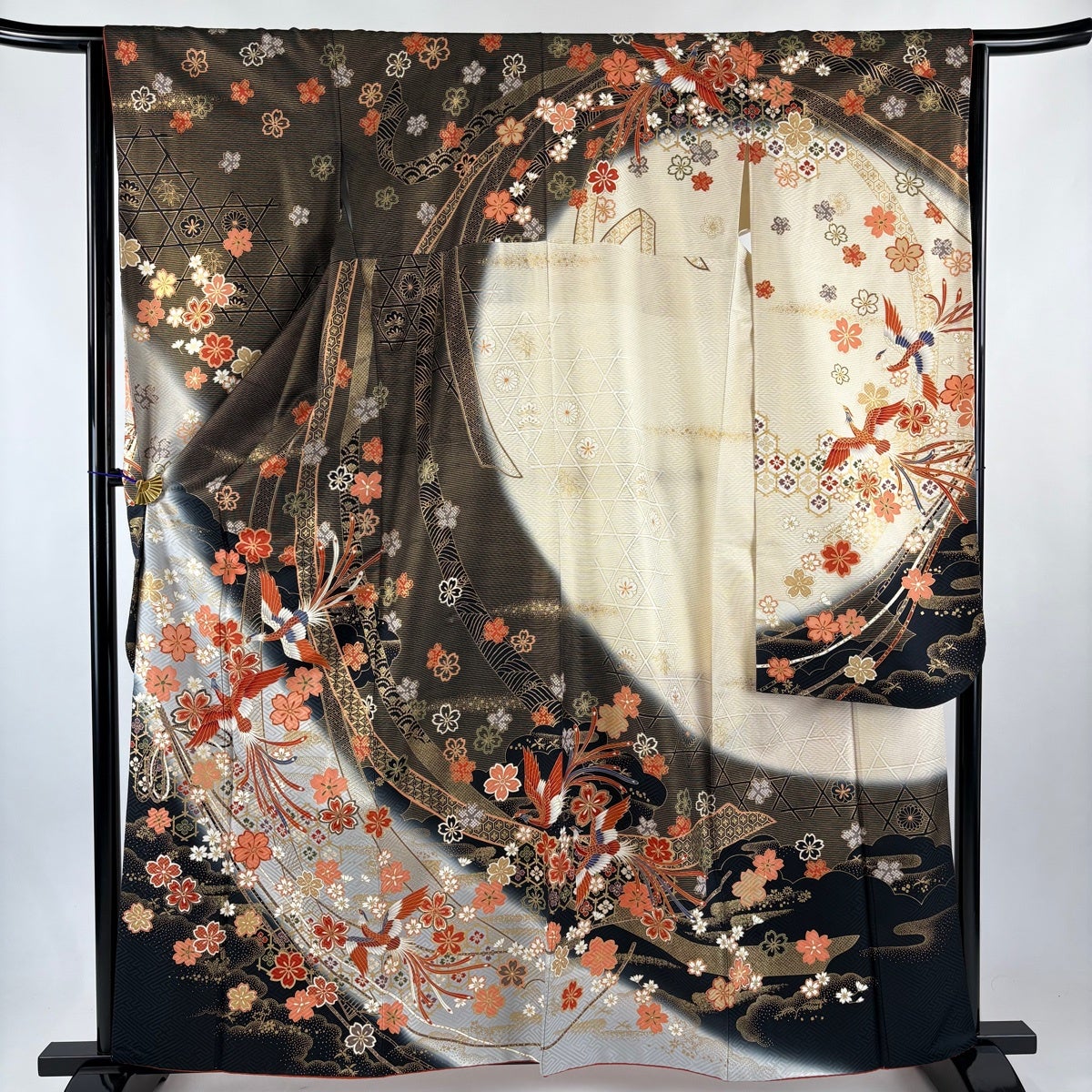 振袖 身丈160.5cm 裄丈64cm M 袷 鳳凰 桜 金彩 染め分け 黒 正絹 秀品