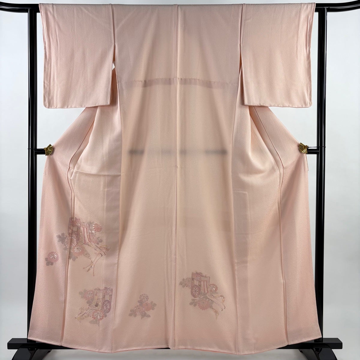 【美品】 付下げ 身丈160cm 裄丈62cm S 袷 御所車 菊 刺繍 薄ピンク 正絹 秀品