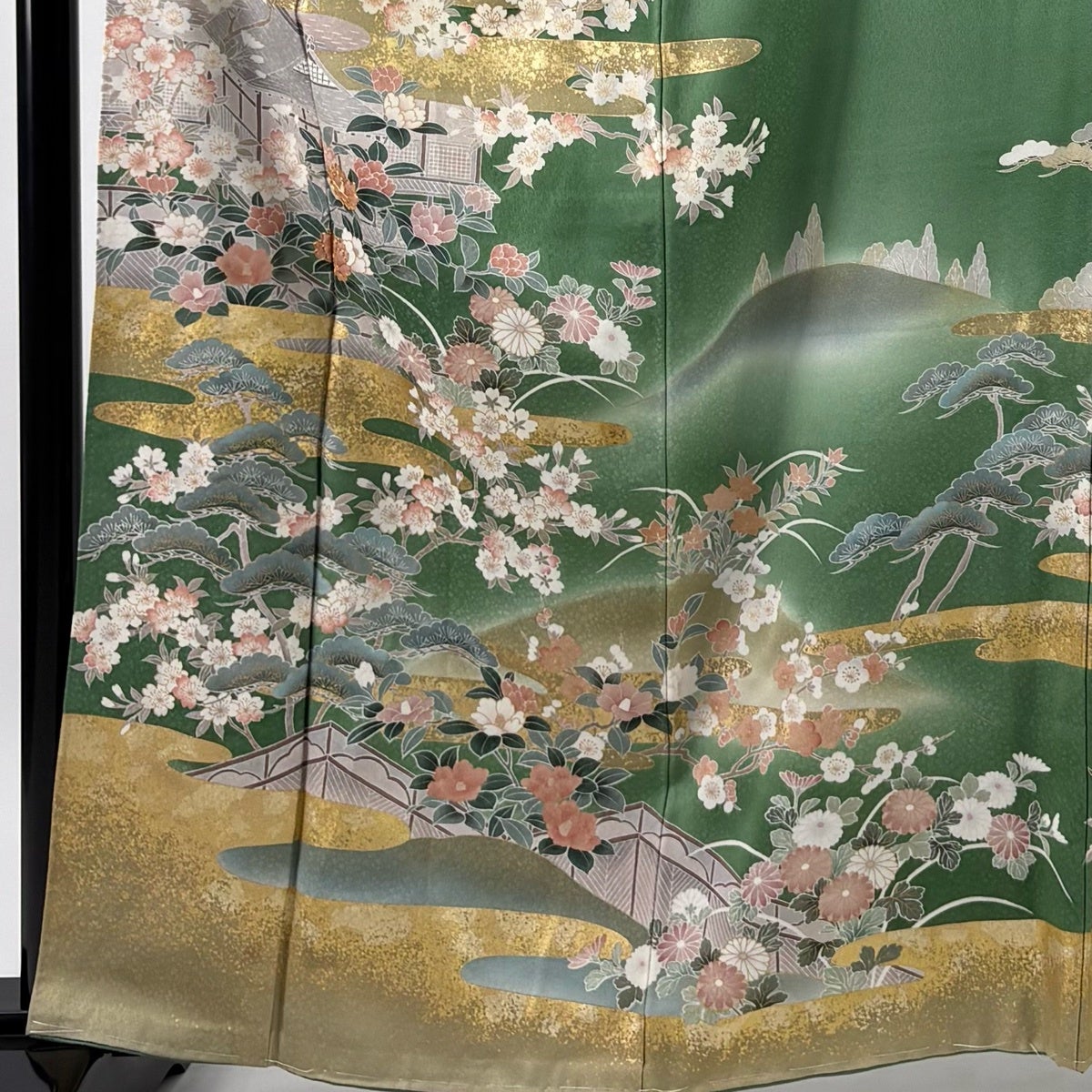 訪問着 身丈163cm 裄丈66.5cm M 袷 家屋 枝花 金糸 金彩 緑 正絹 秀品