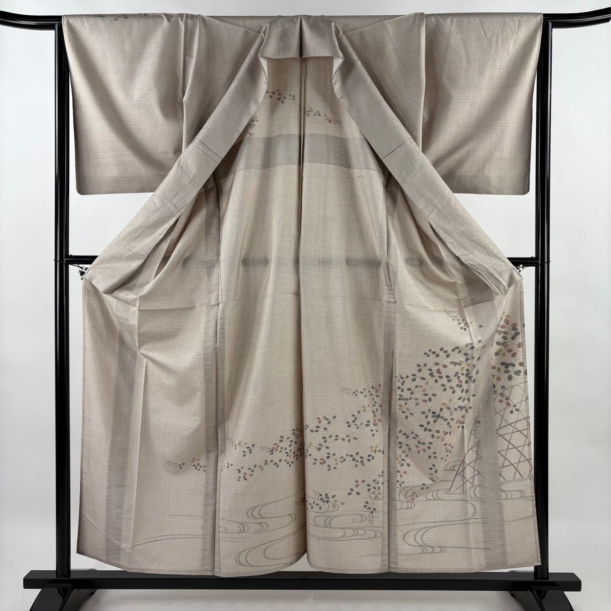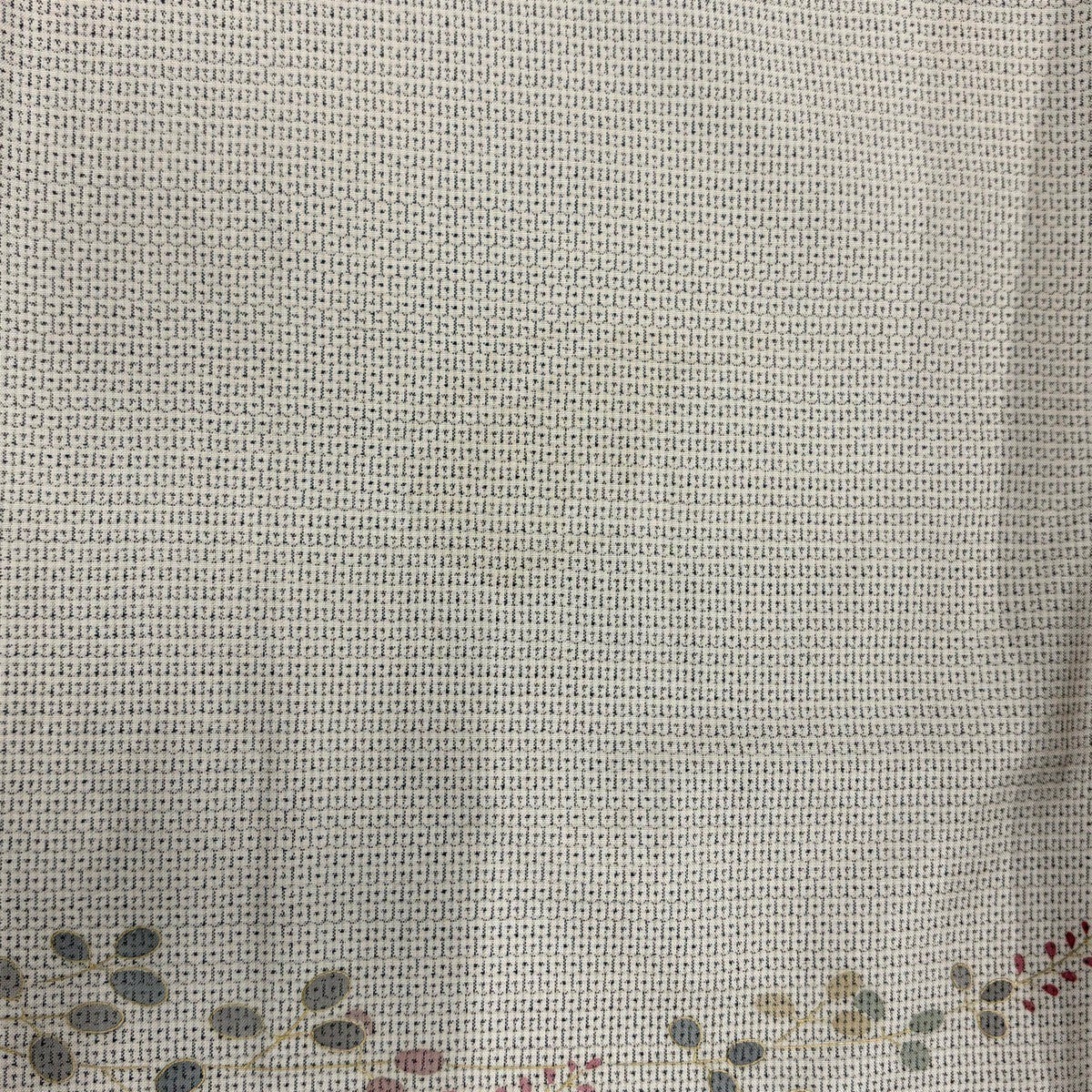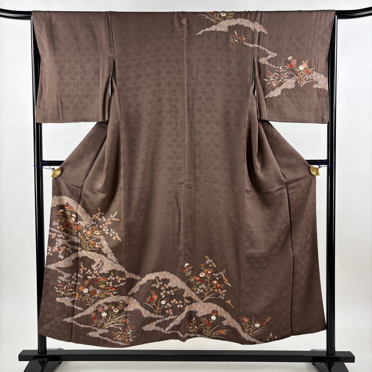 【美品】 小紋 身丈157cm 裄丈66cm M 袷 弥次郎兵衛 草花 刺繍 灰茶 正絹 秀品