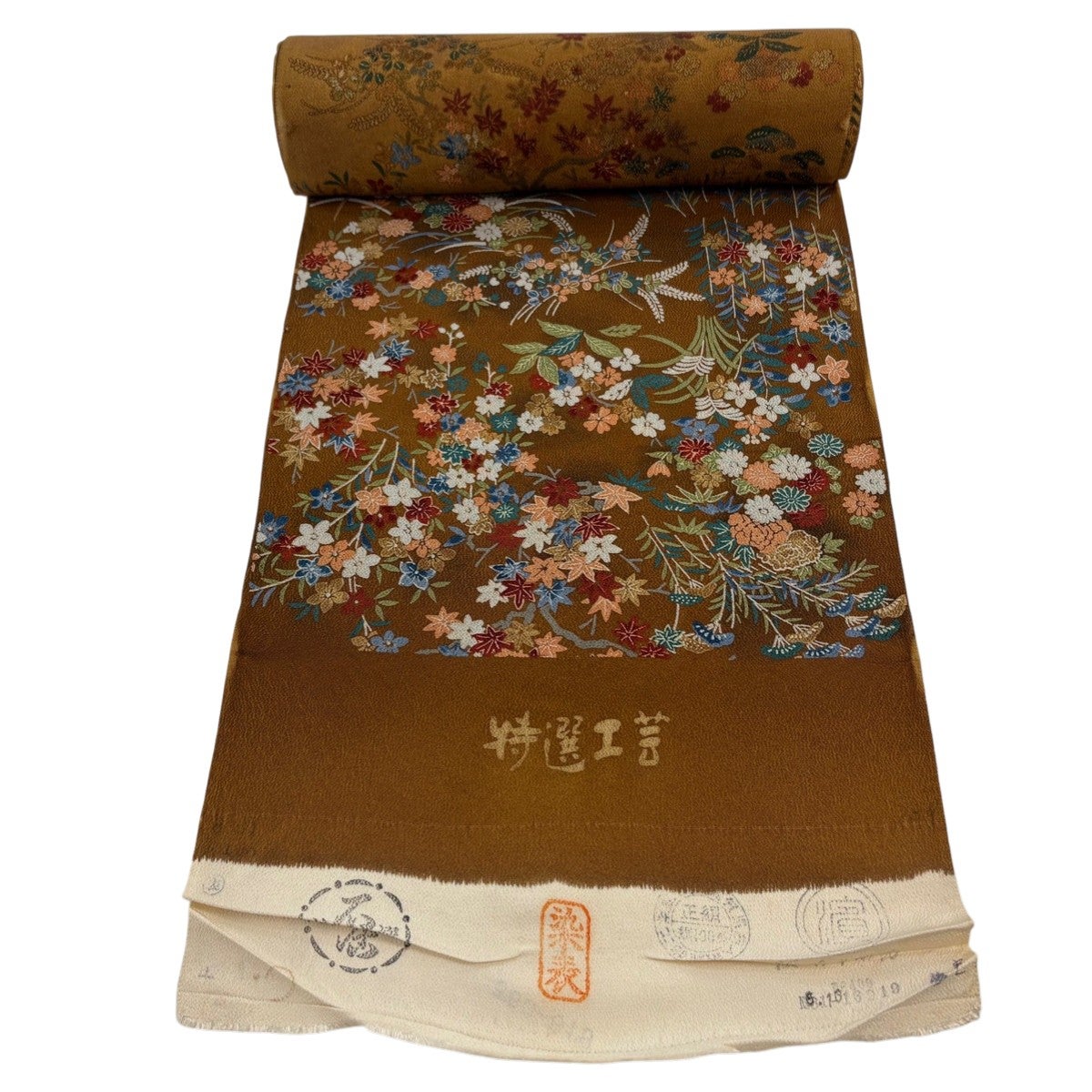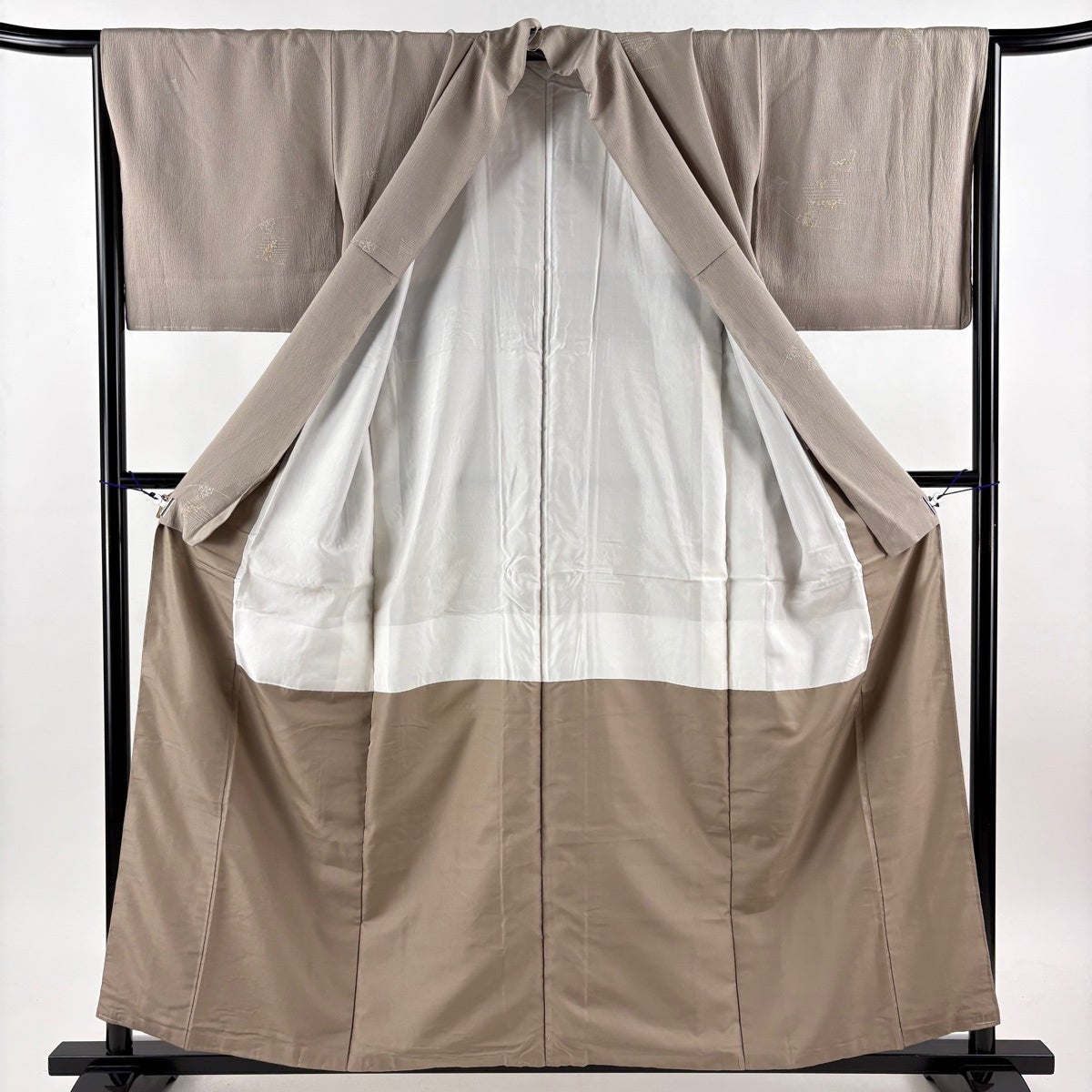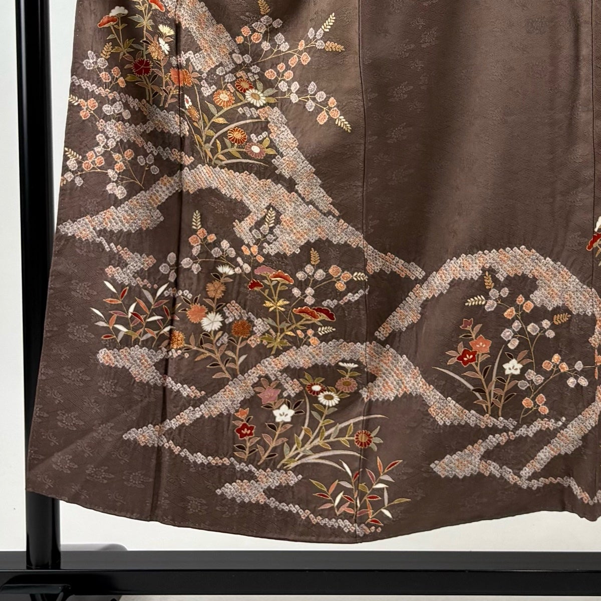 【美品】 小紋 身丈157cm 裄丈66cm M 袷 弥次郎兵衛 草花 刺繍 灰茶 正絹 秀品