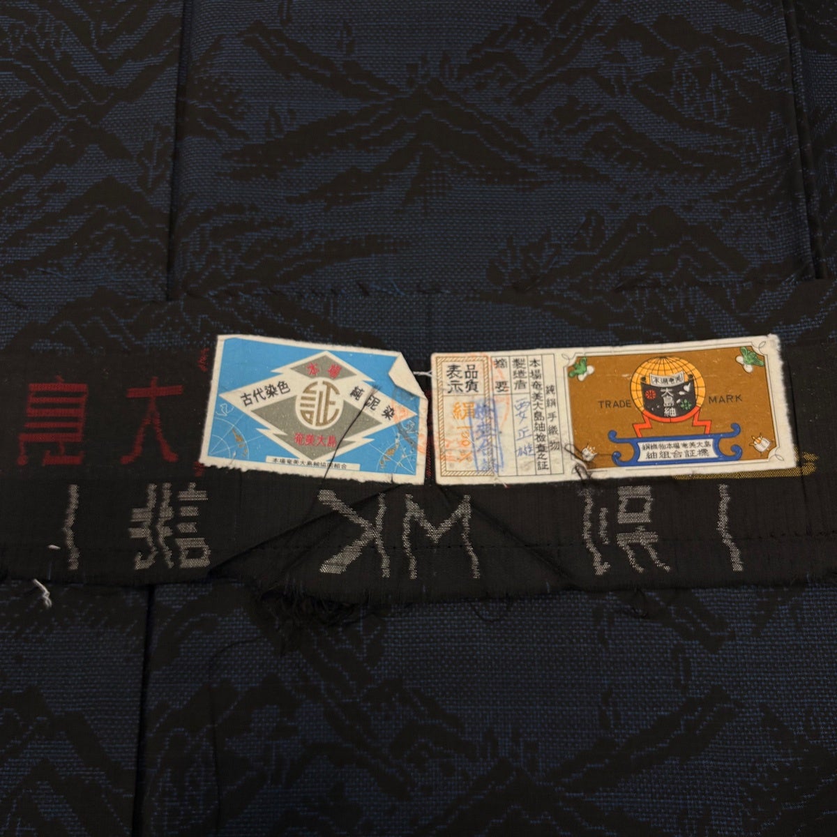 【美品】 大島紬 身丈160cm 裄丈63cm S 袷 純泥染 証紙あり 山並み 樹木 紺色 正絹 秀品