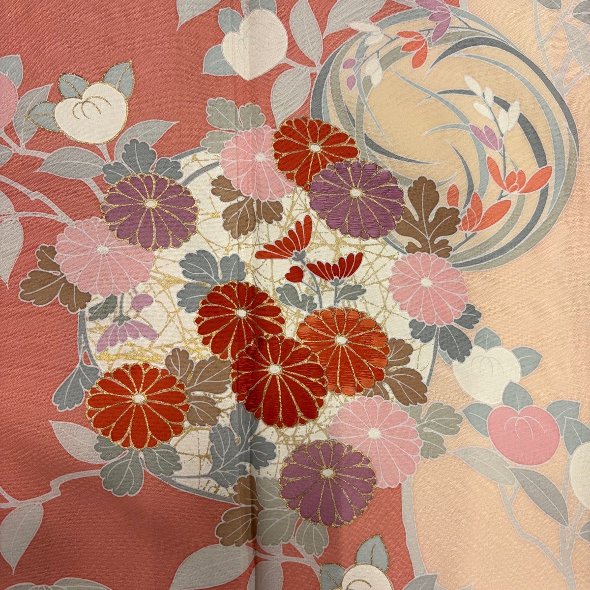 訪問着 身丈161.5cm 裄丈65cm M 袷 花丸文 橘 刺繍 金彩 ピンク 正絹 秀品