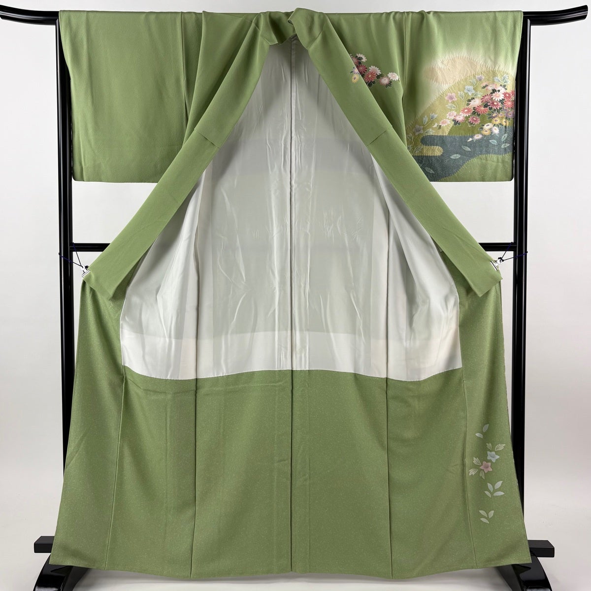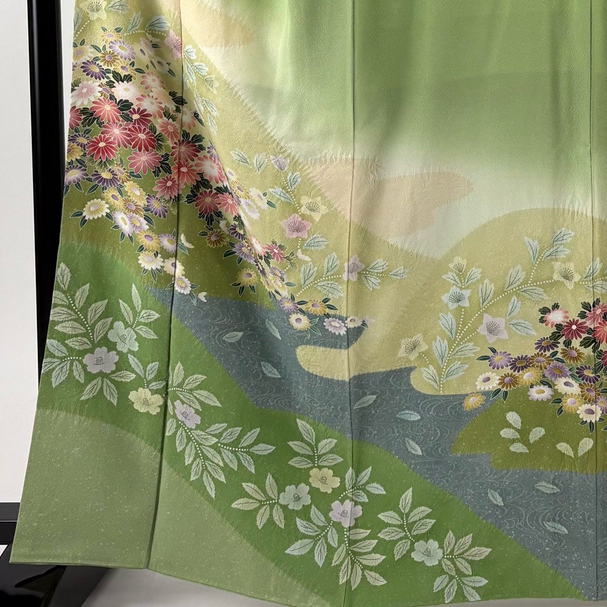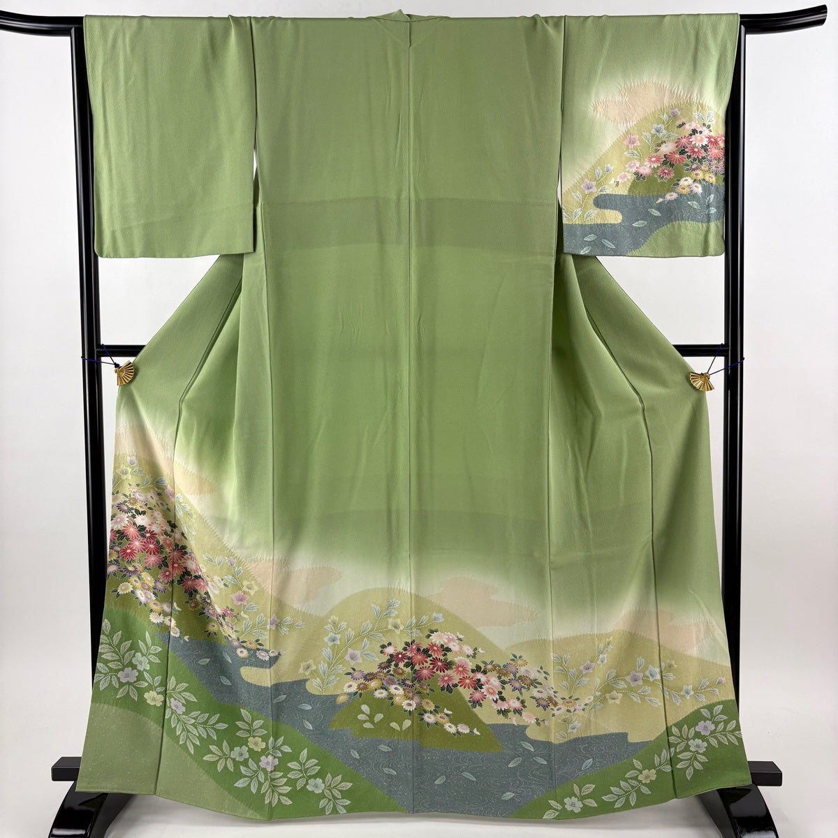 訪問着 身丈165cm 裄丈65.5cm M 袷 菊 流水 絞り ぼかし 黄緑色 正絹 秀品