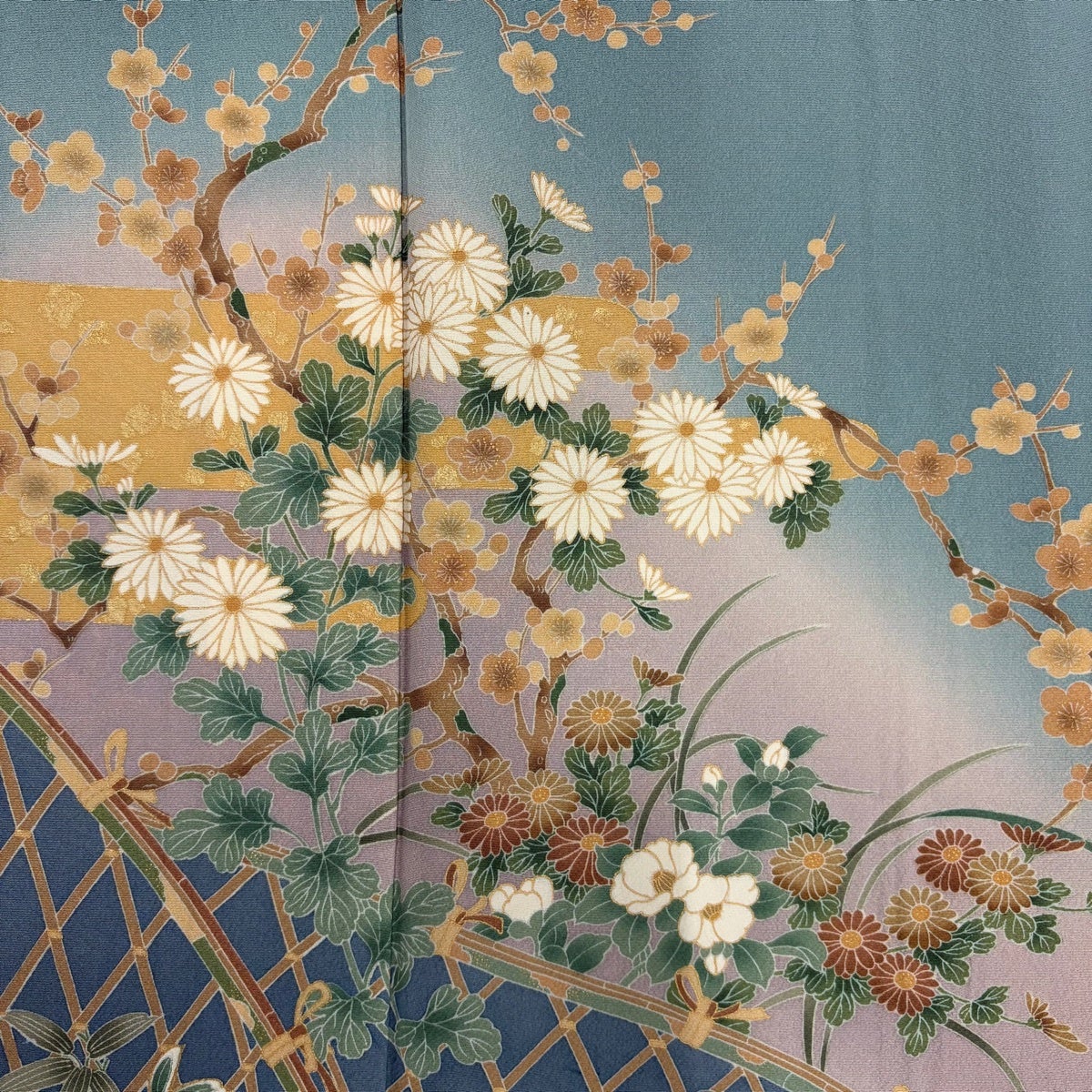 訪問着 身丈151cm 裄丈64cm M 袷 落款あり 枝梅 菊 金彩 ぼかし 青灰色 正絹 秀品 一つ紋