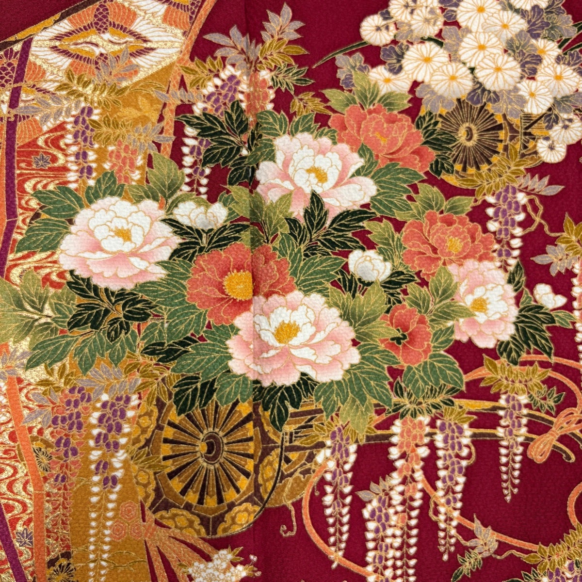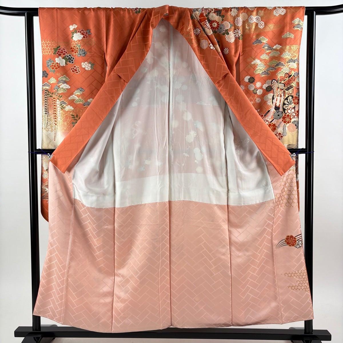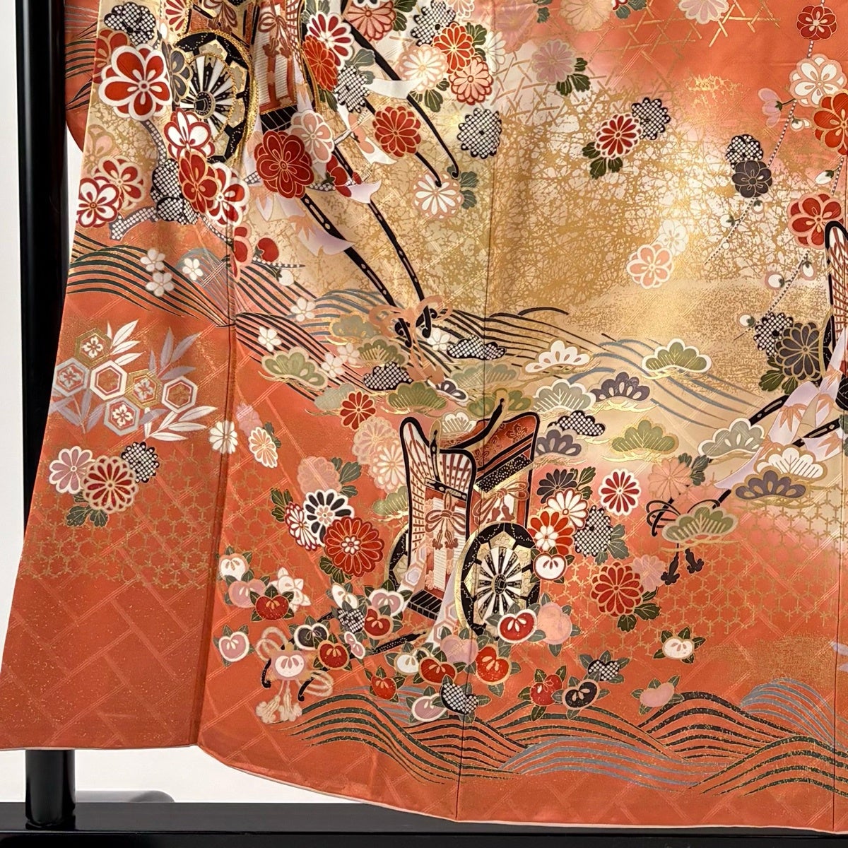 振袖 身丈155cm 裄丈62cm S 袷 御所車 松竹梅 金糸 金彩 オレンジ 正絹 秀品