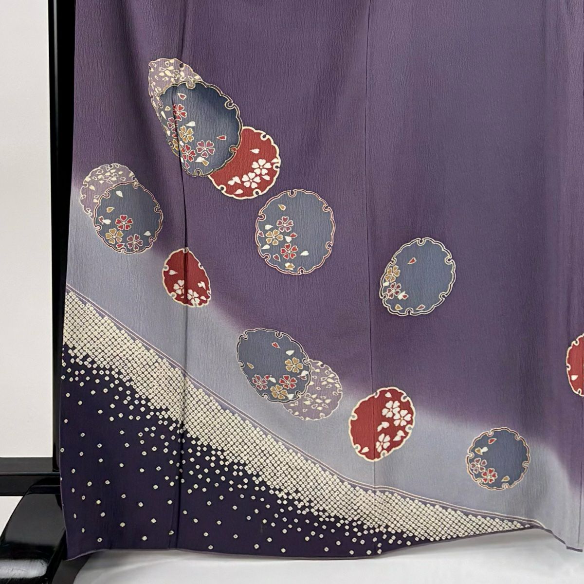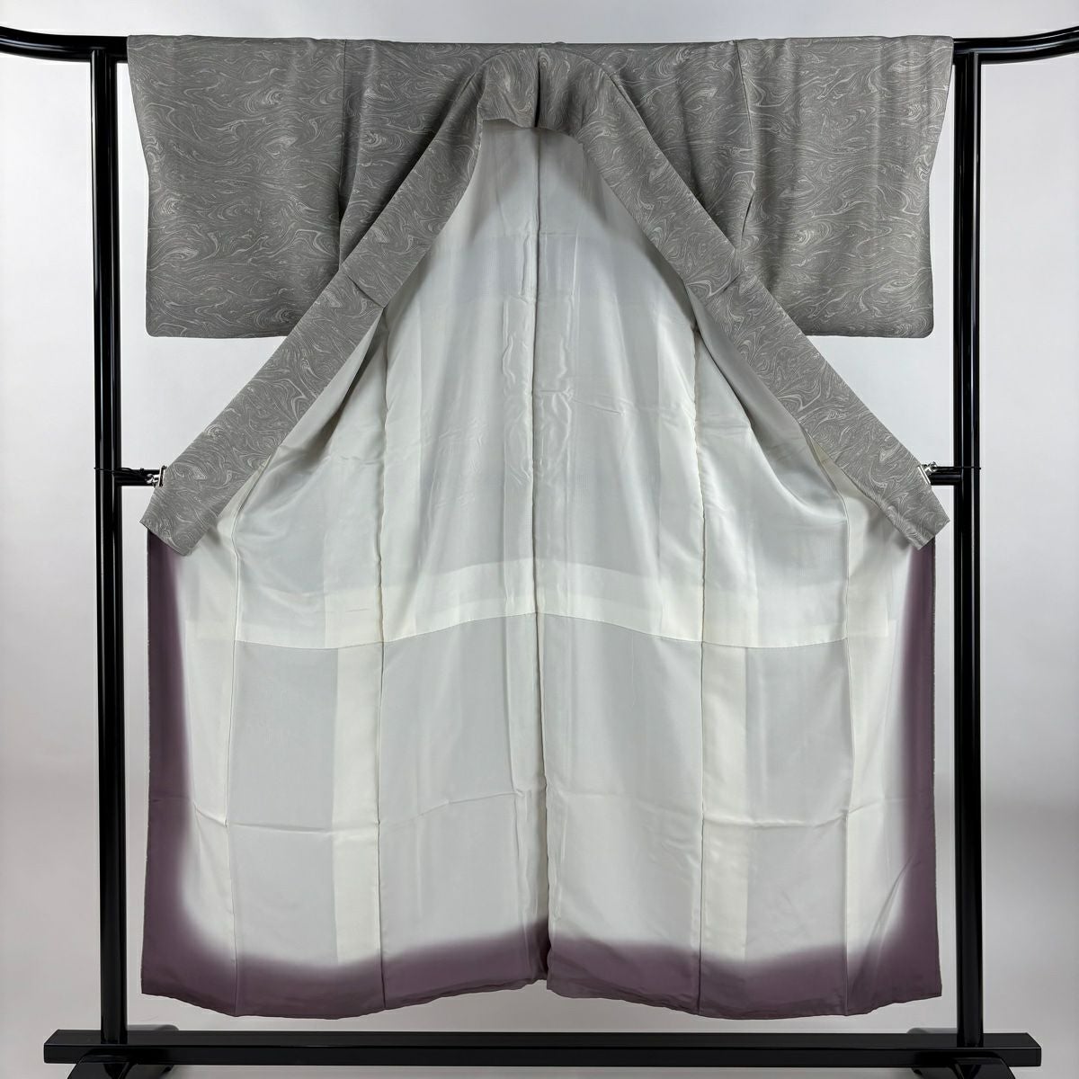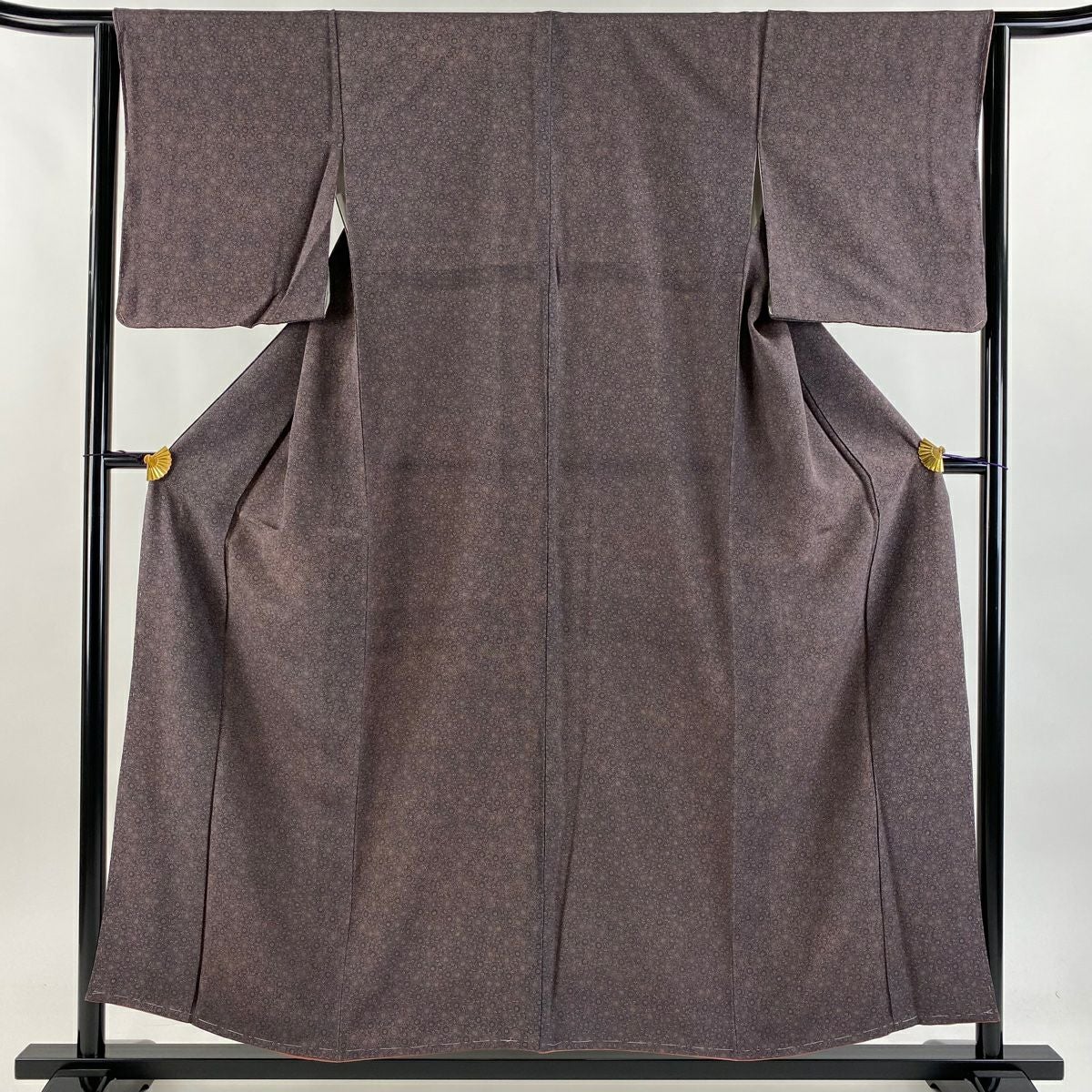 【在庫一掃】 小紋 身丈155.5cm 裄丈64cm M 袷 落款あり 菊 ちりめん 灰紫 正絹 名品