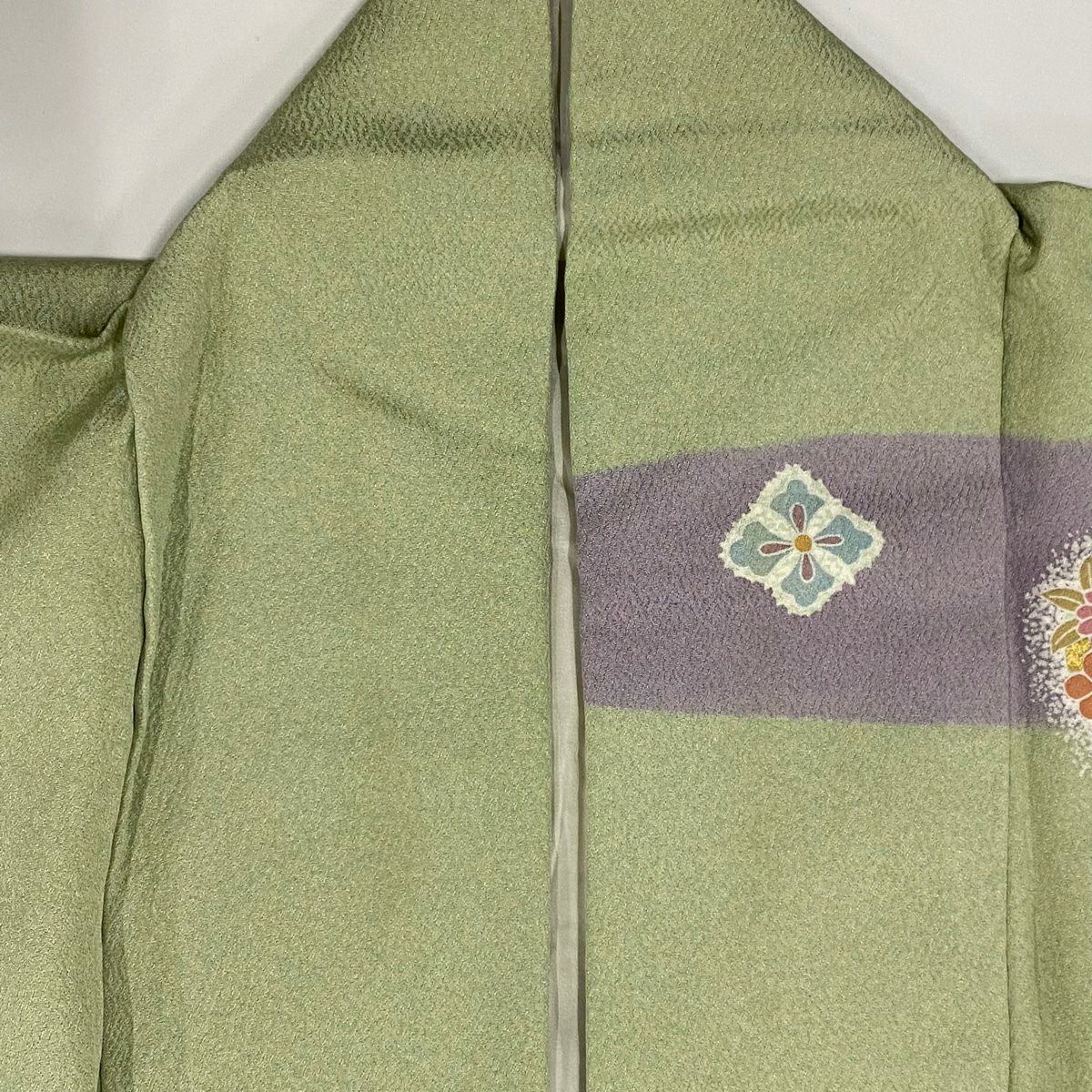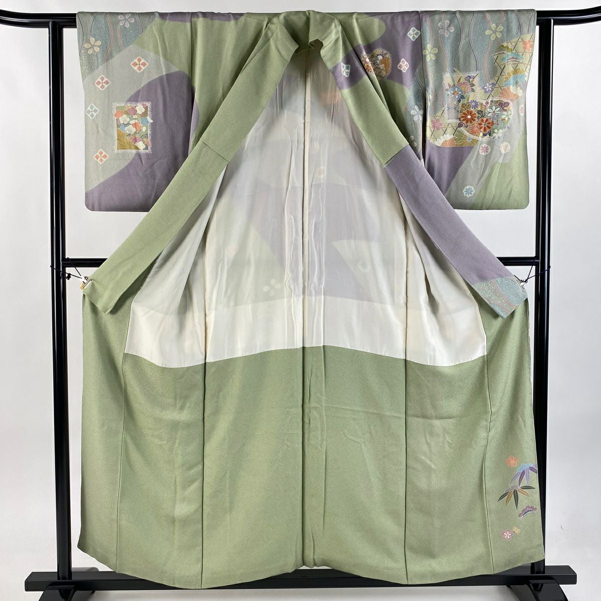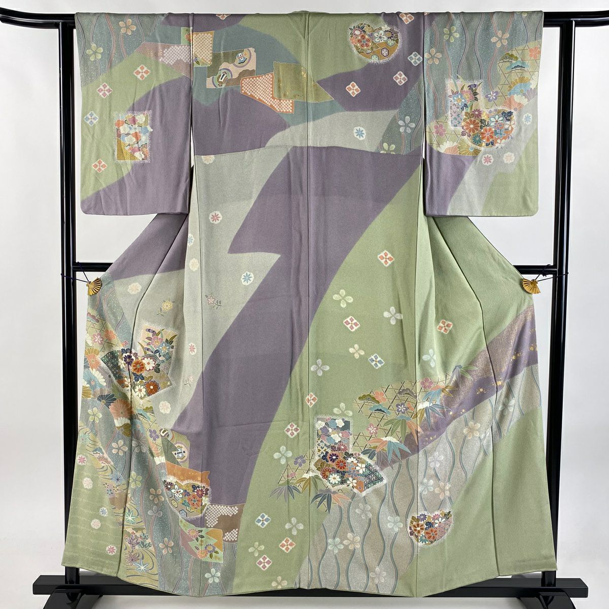 【在庫一掃】 訪問着 身丈156.5cm 裄丈61cm S 袷 草花 扇面 金糸 金彩 薄緑 正絹 名品