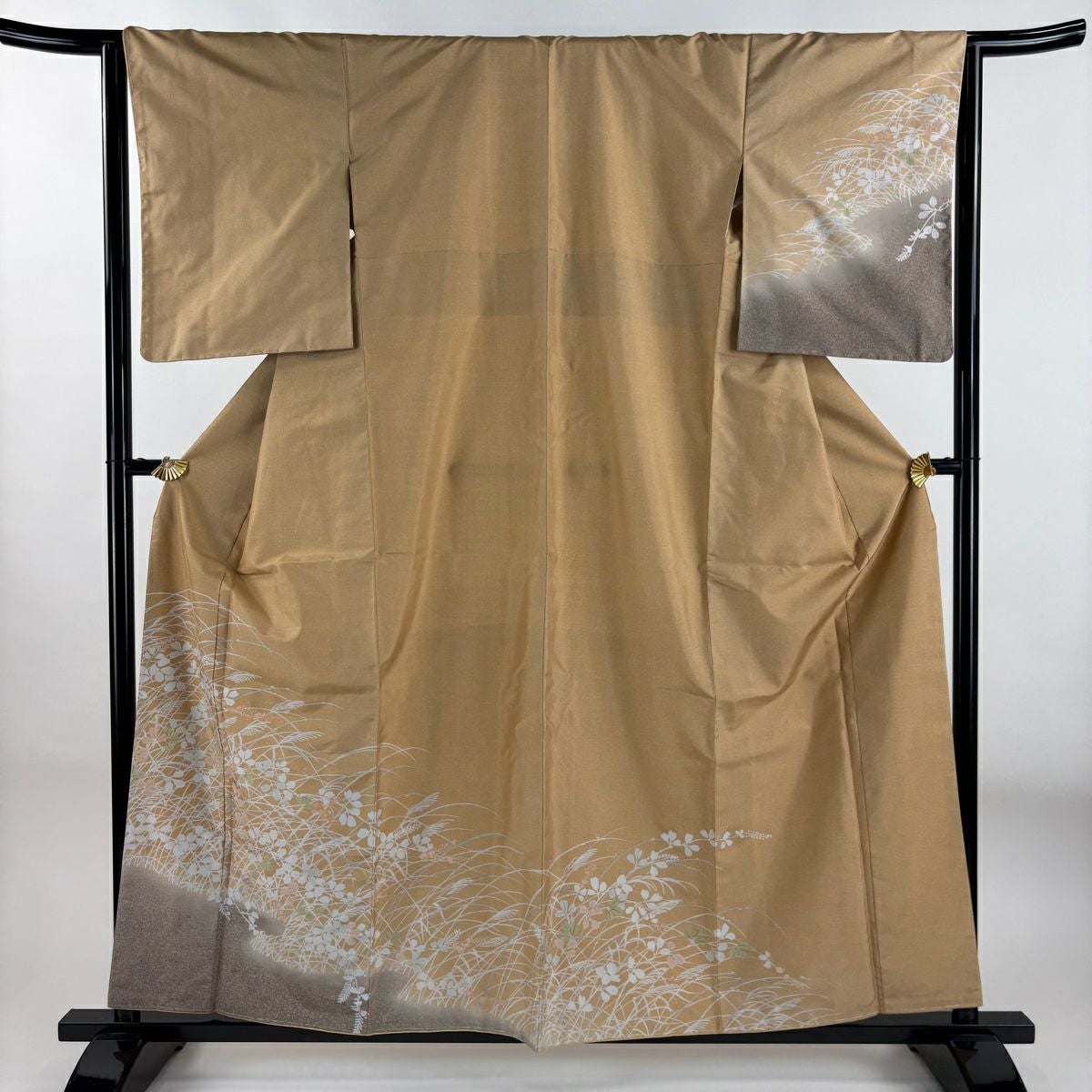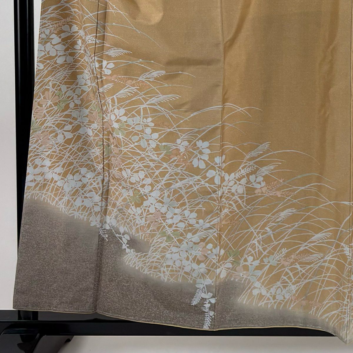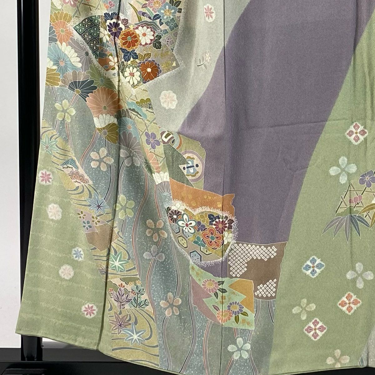 【在庫一掃】 訪問着 身丈156.5cm 裄丈61cm S 袷 草花 扇面 金糸 金彩 薄緑 正絹 名品