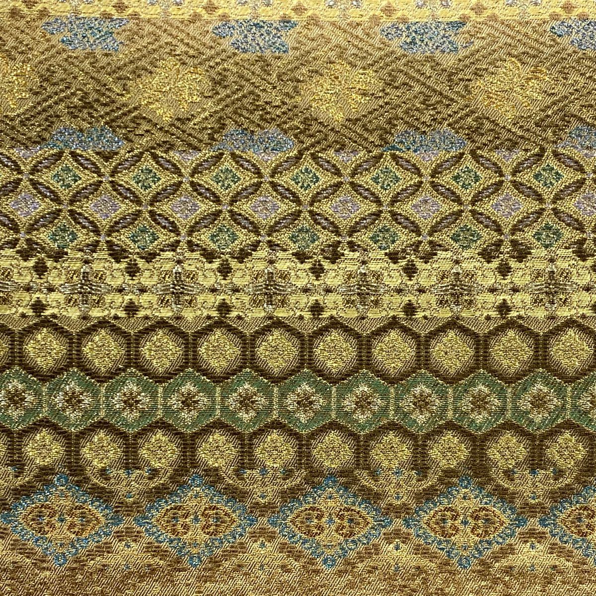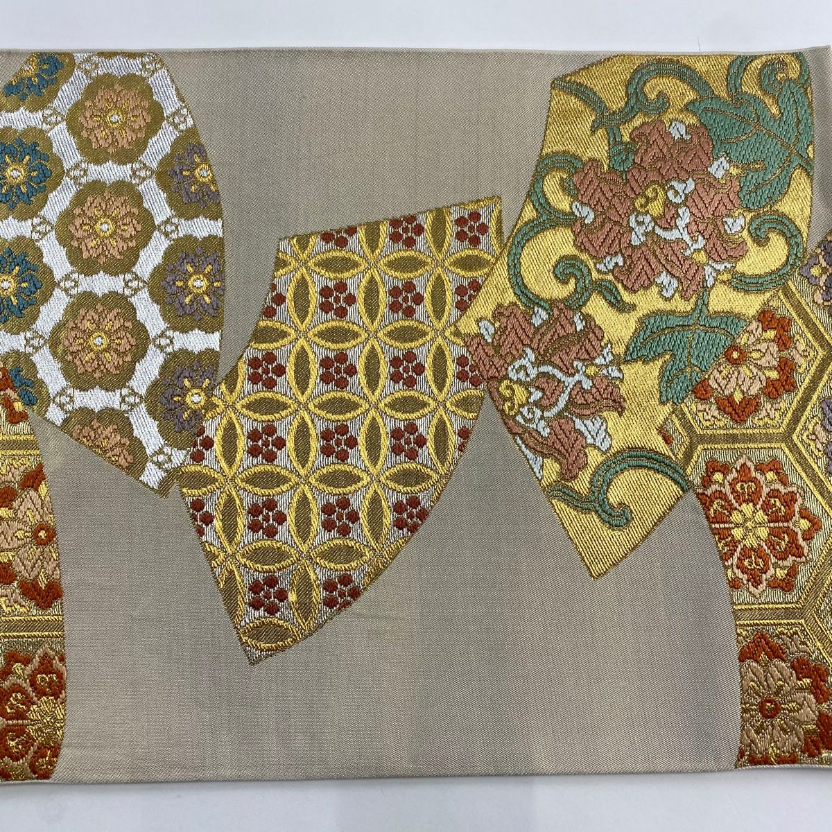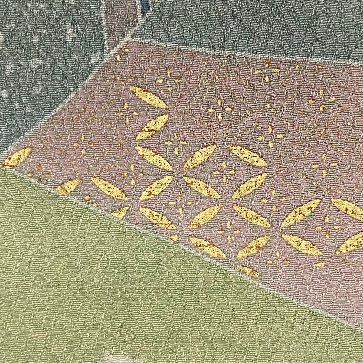 【在庫一掃】 【美品】 袋帯 秀品 芝 幾何学模様 箔 灰緑 六通 正絹