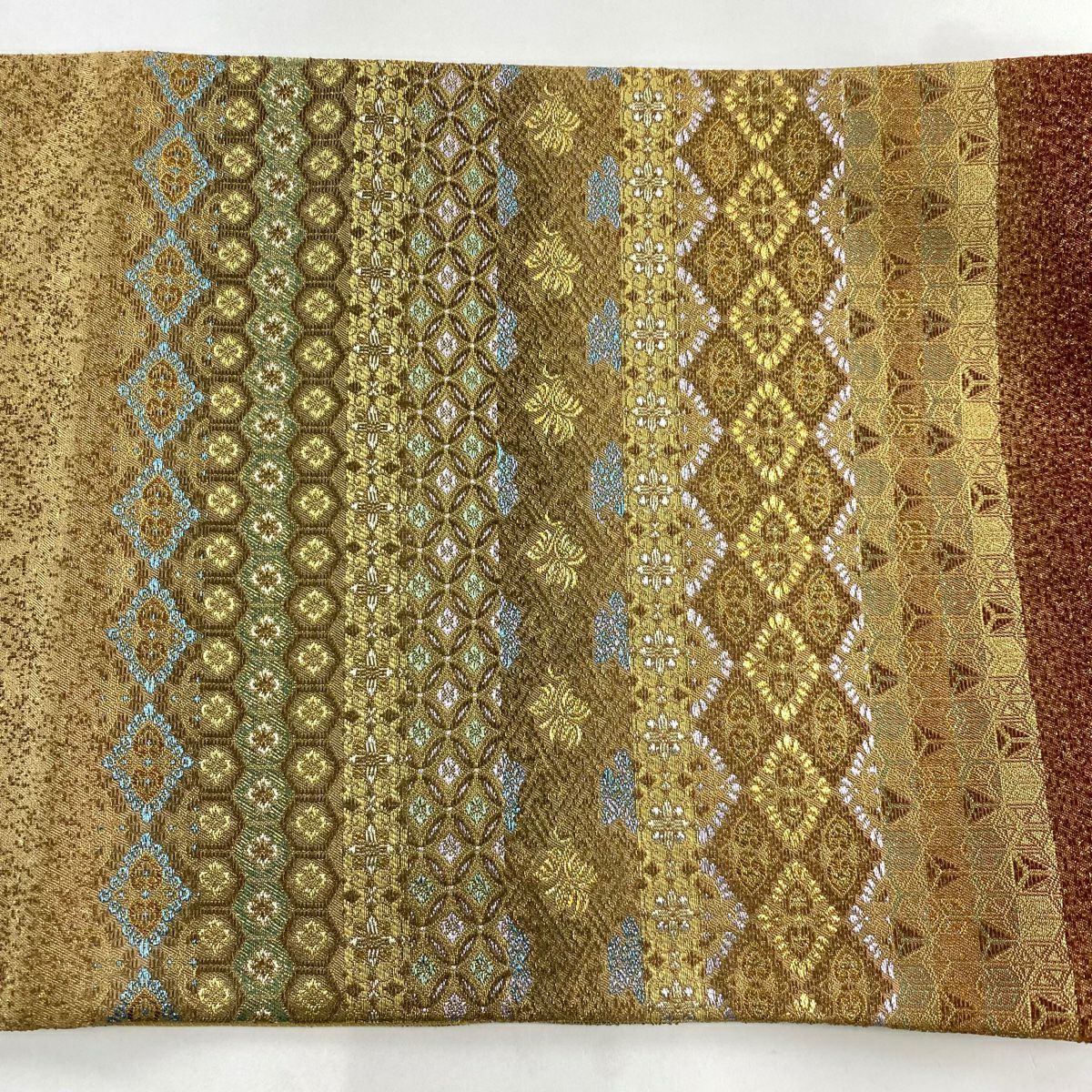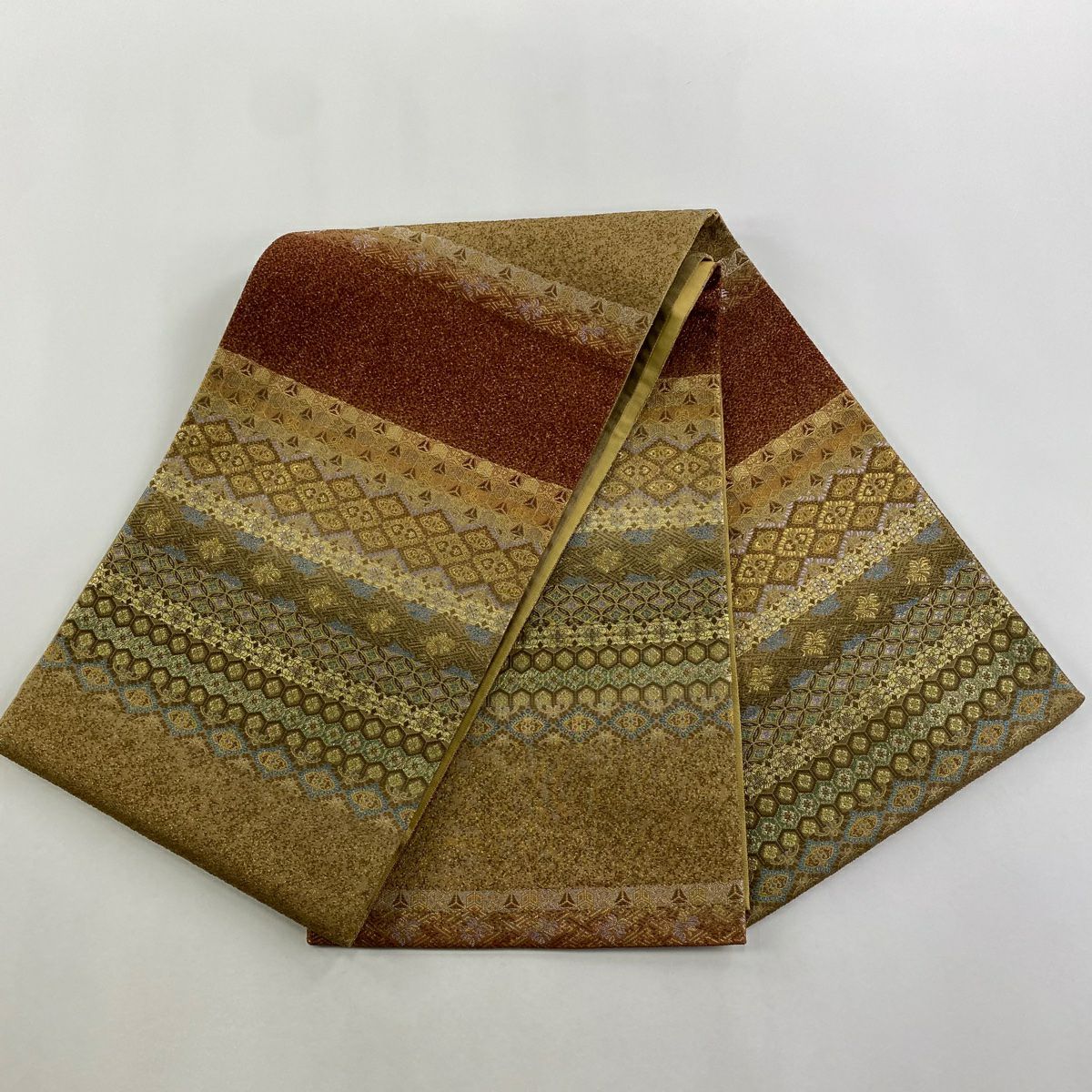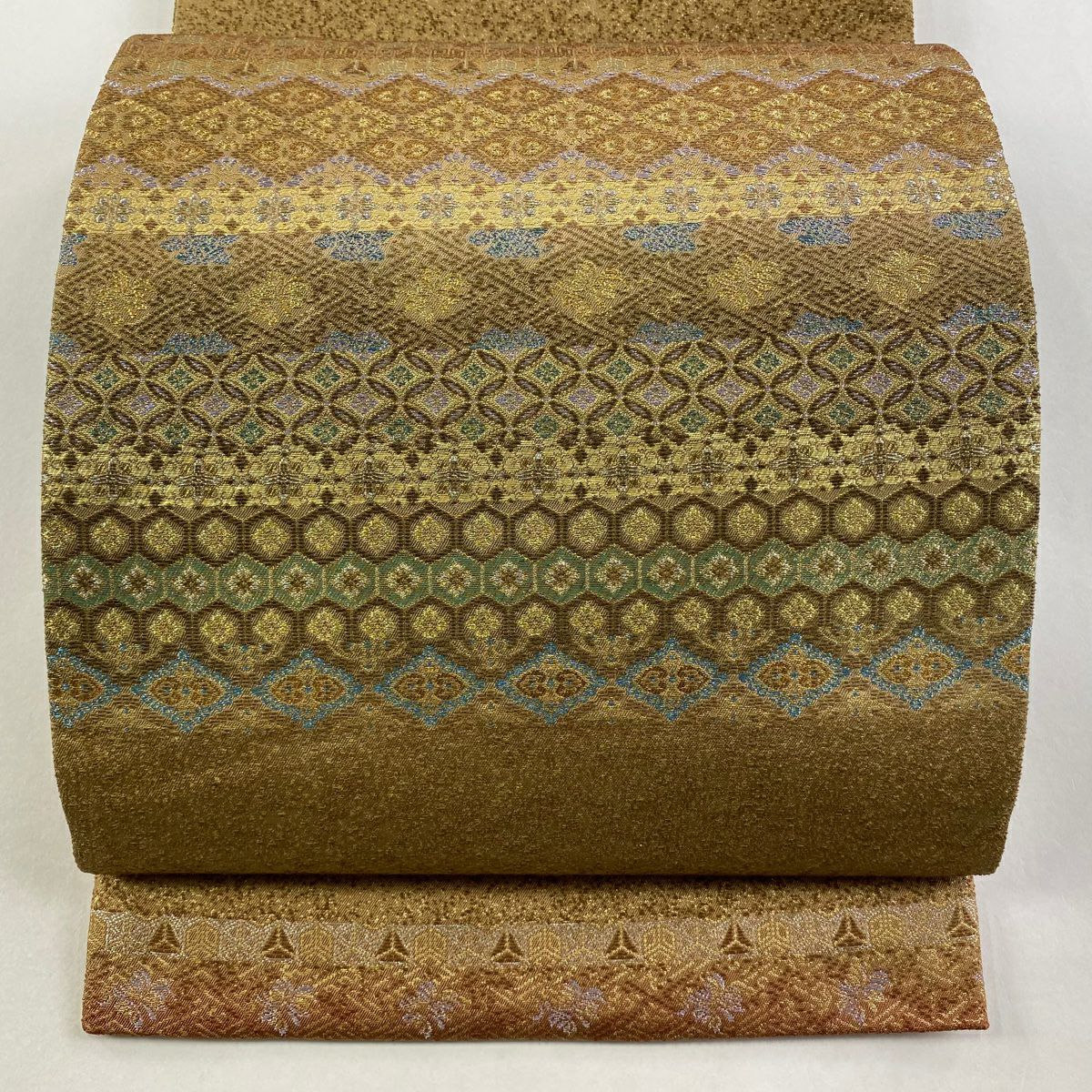 【在庫一掃】 袋帯 秀品 幾何学 金糸 箔 茶緑色 全通 正絹