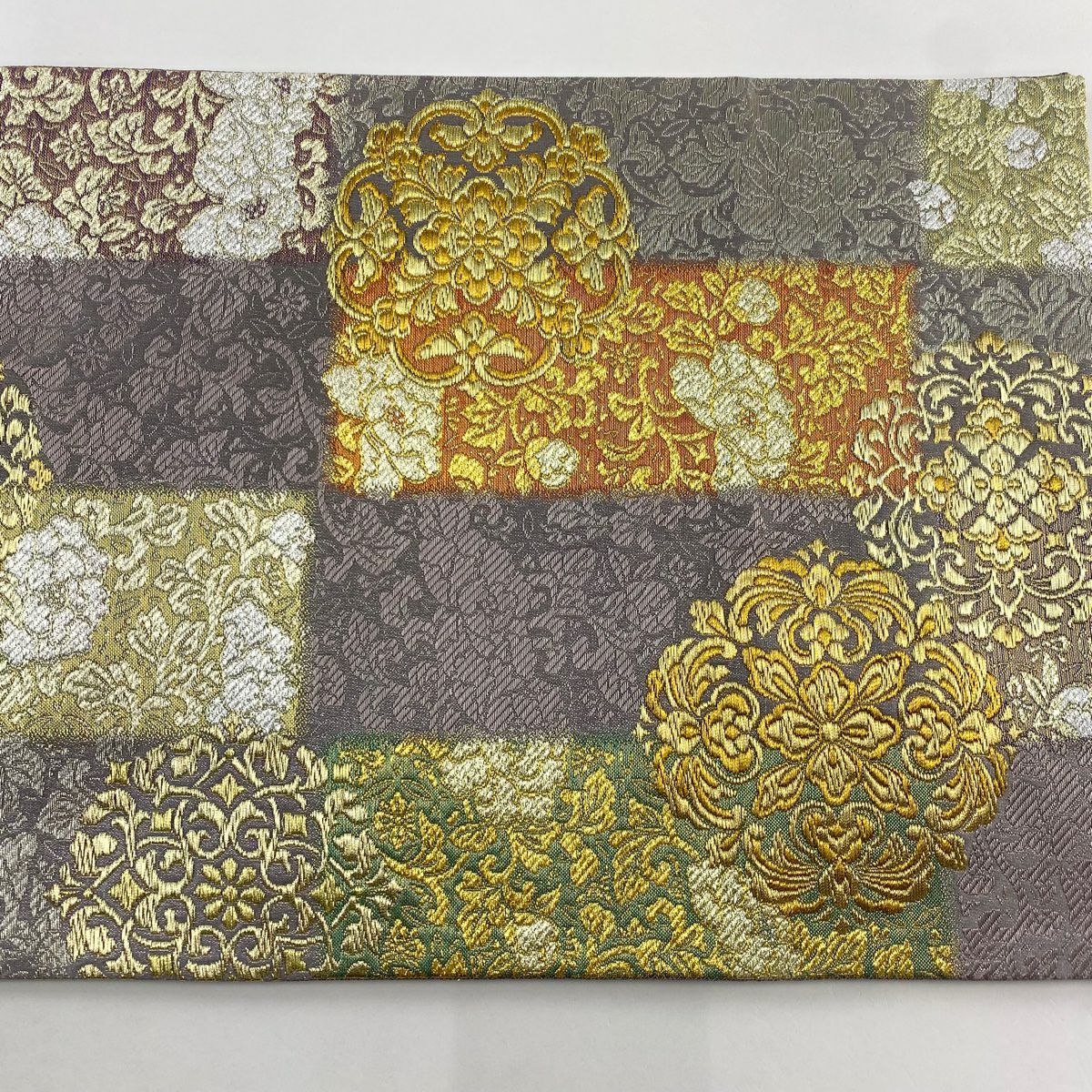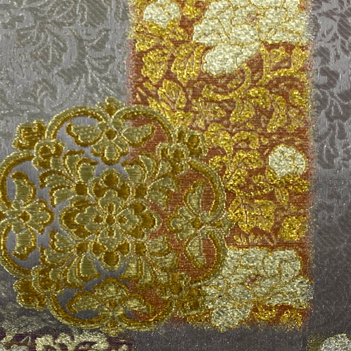 【在庫一掃】 袋帯 秀品 鎧威し 草花 金銀糸 箔 灰色 六通 正絹