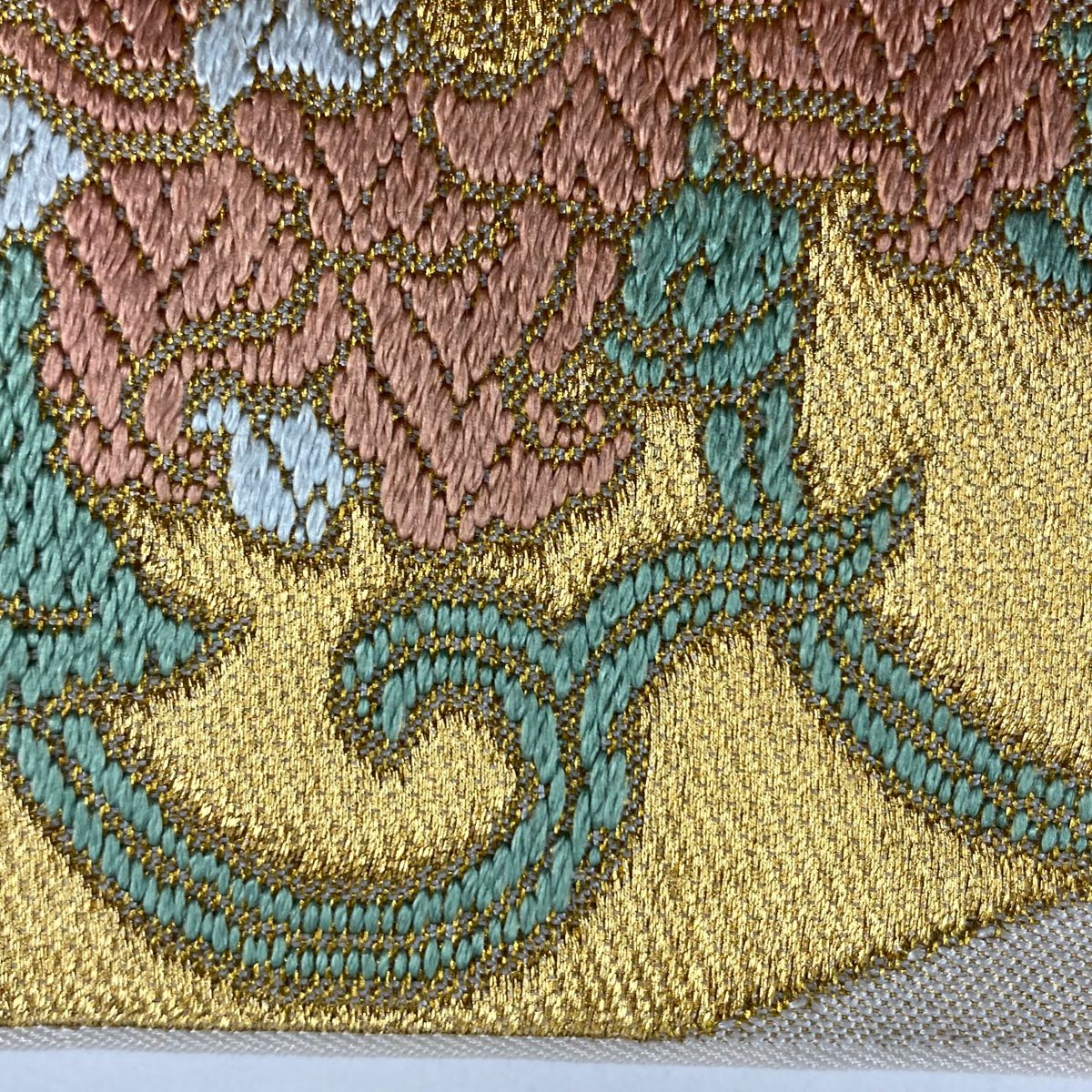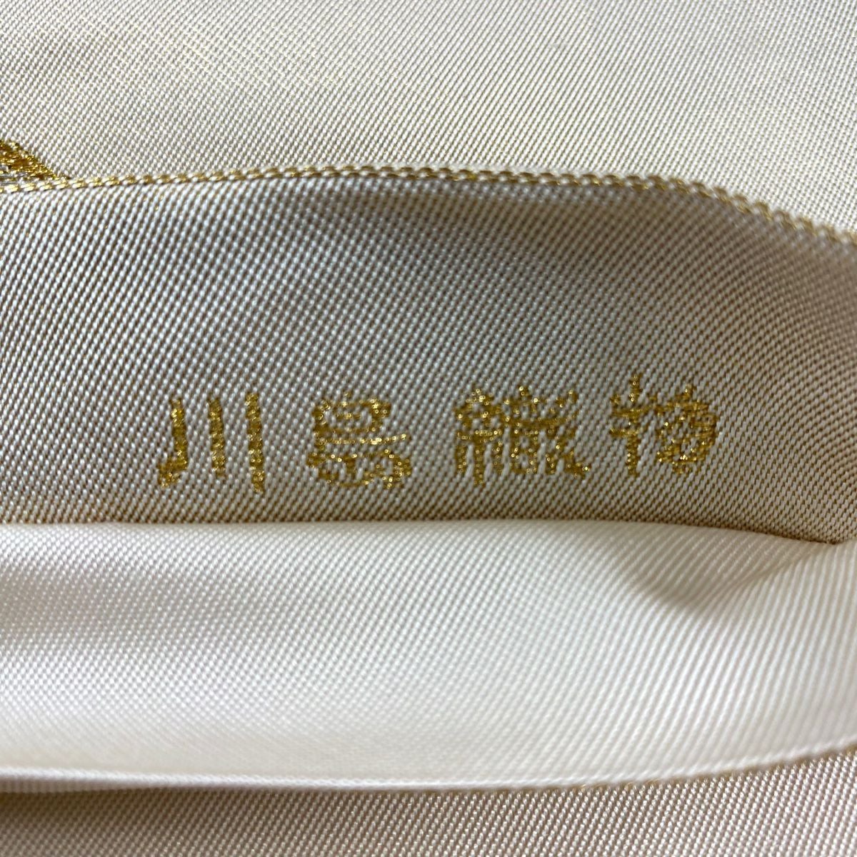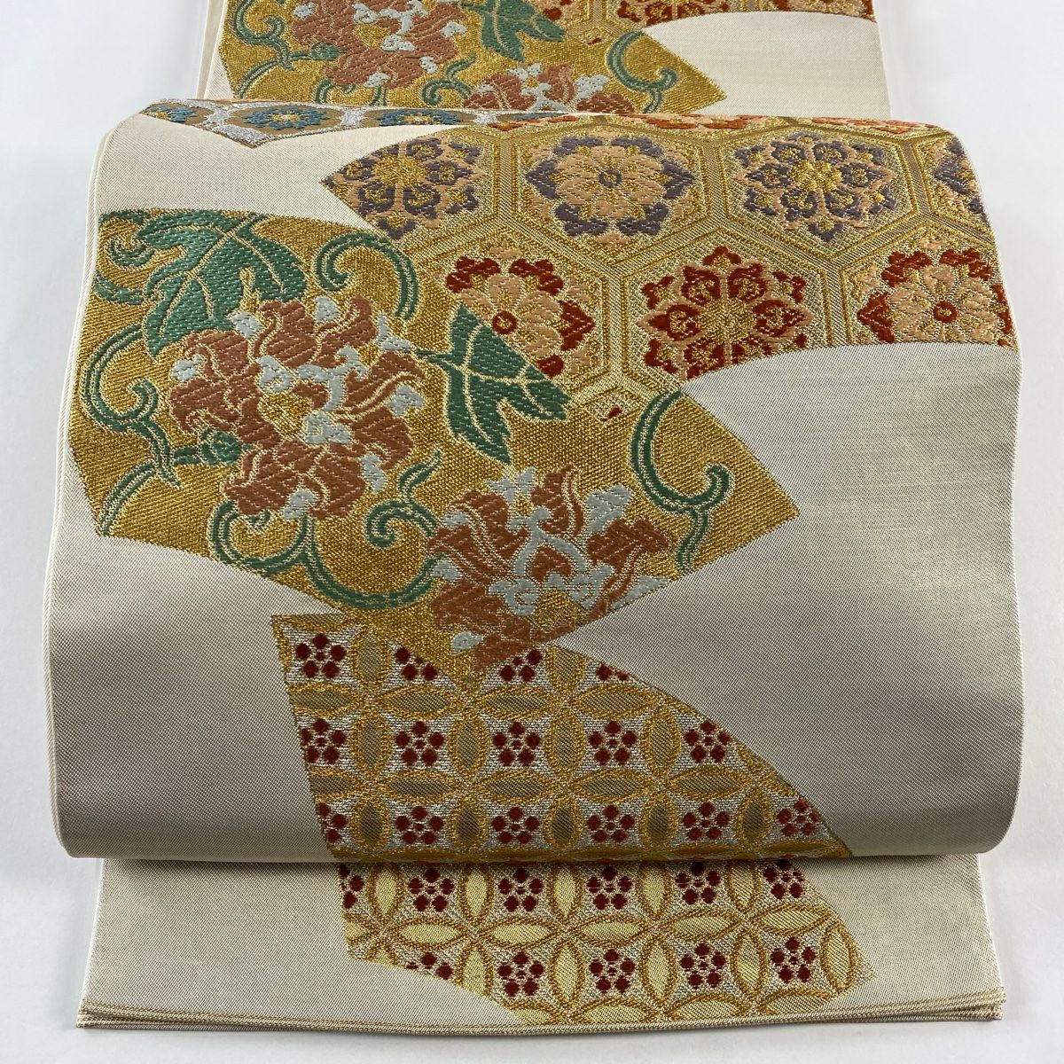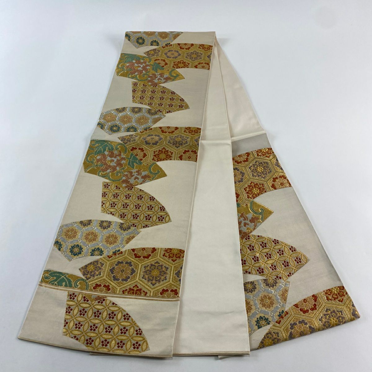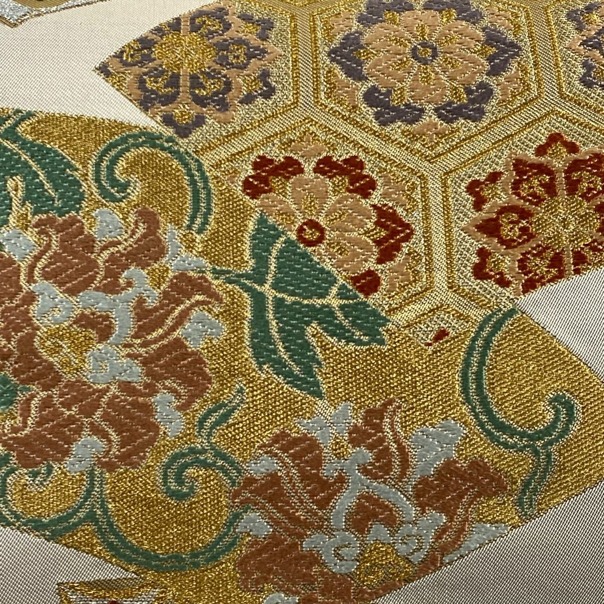 【在庫一掃】 袋帯 秀品 草花 青海波 金糸 唐織 クリーム 六通 正絹