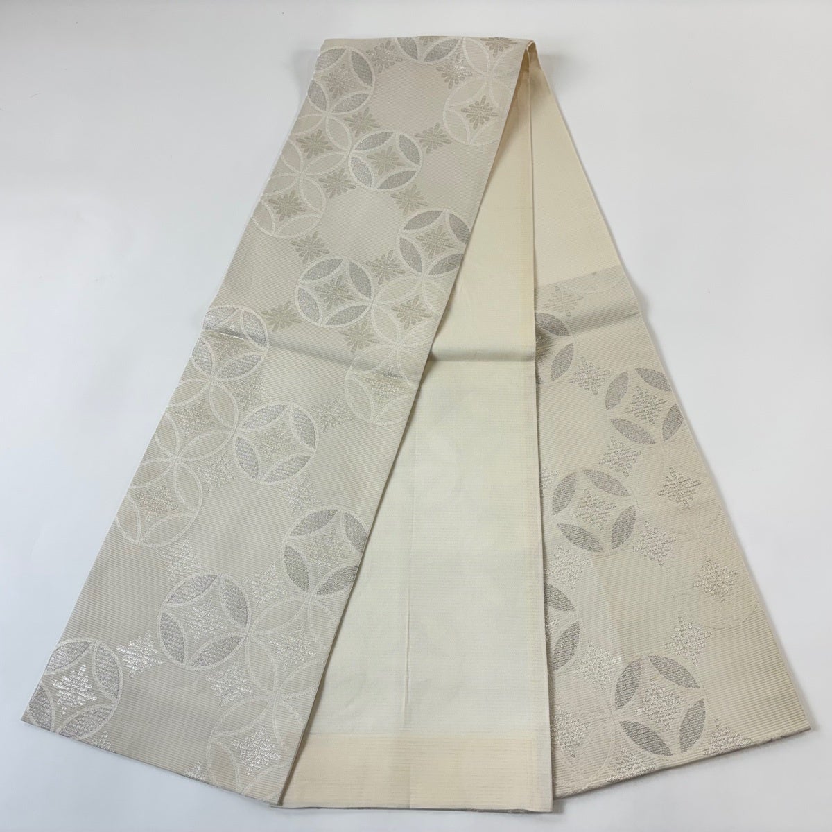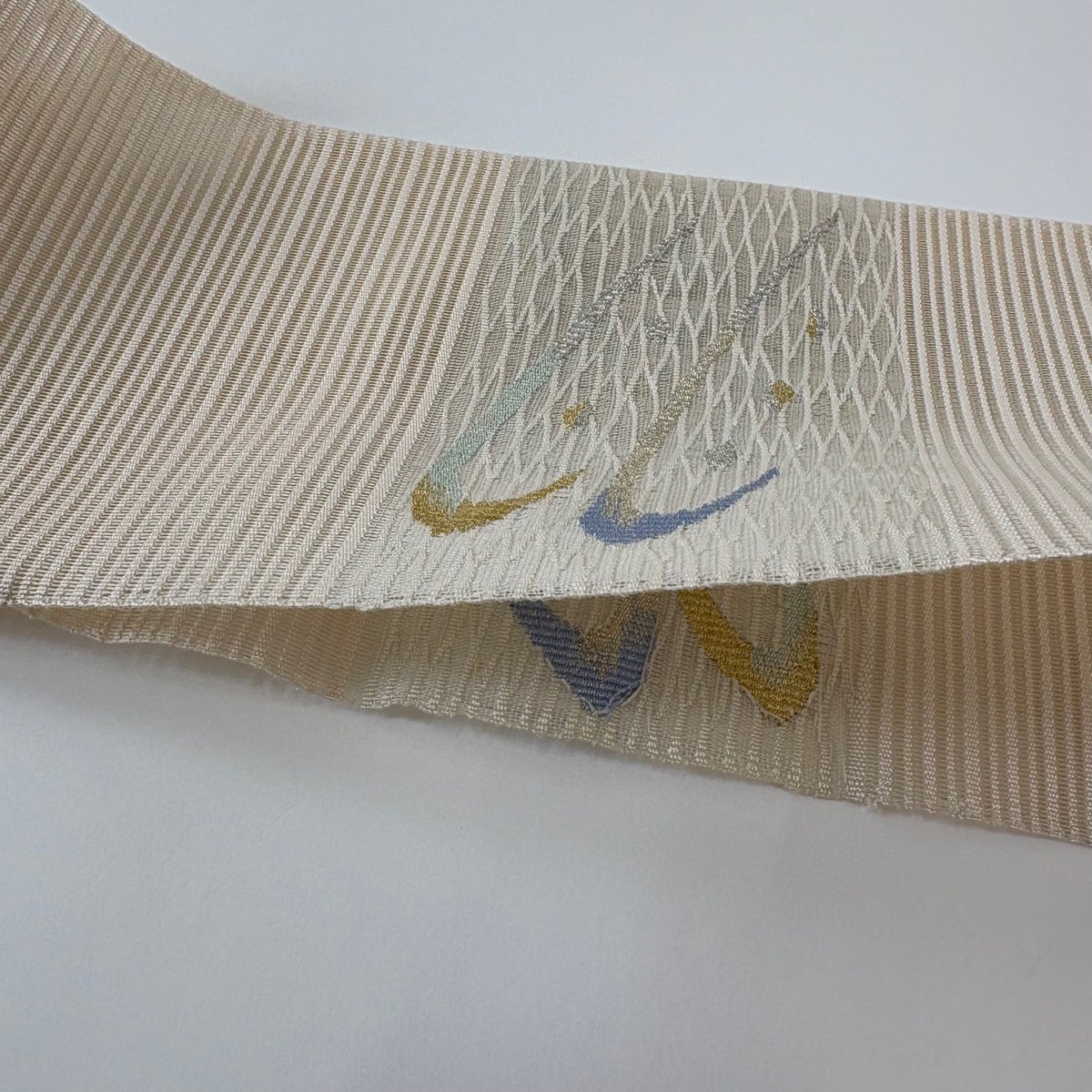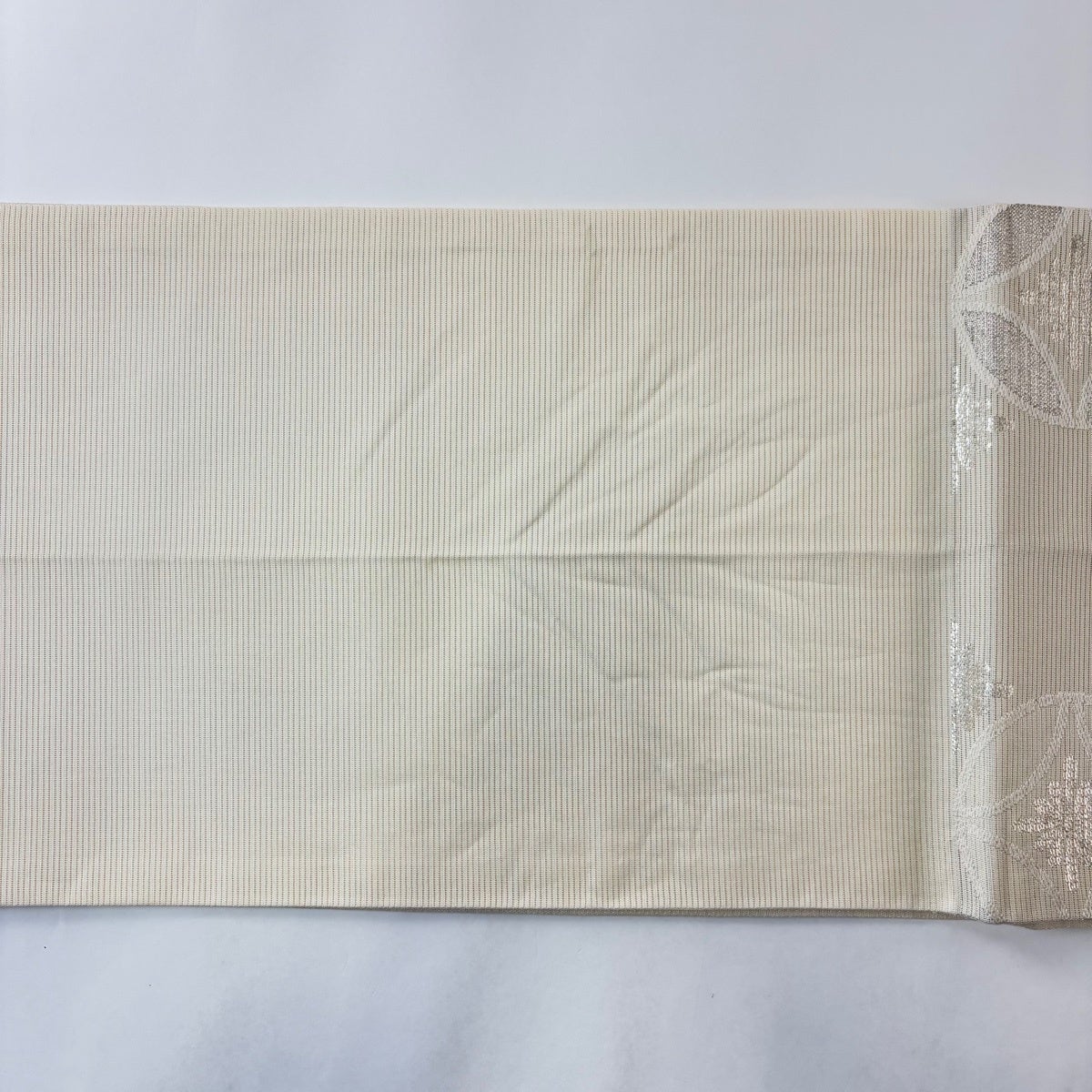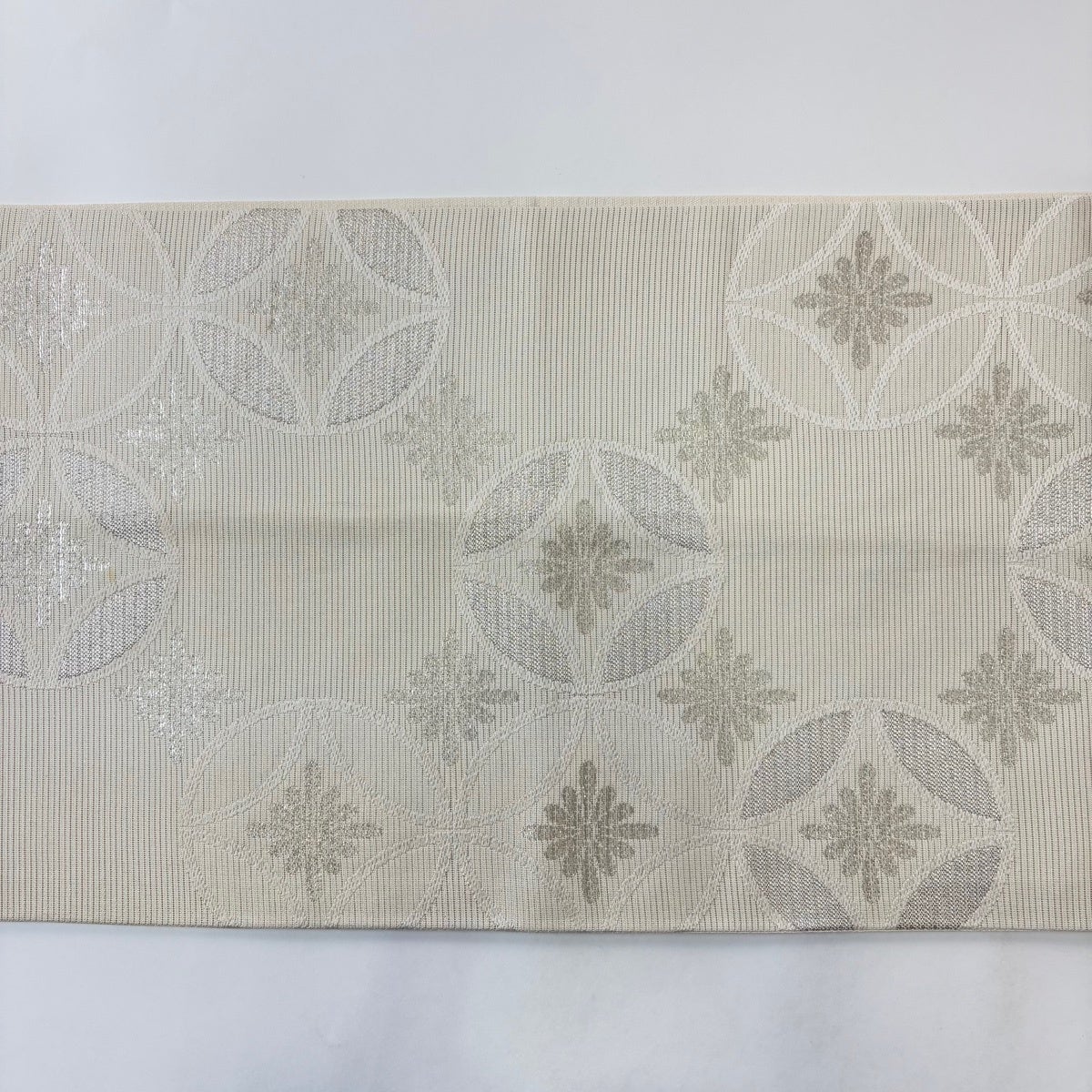 名古屋帯 秀品 段縞 幾何学模様 銀糸 クリーム 正絹