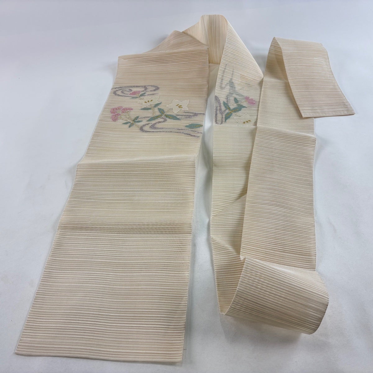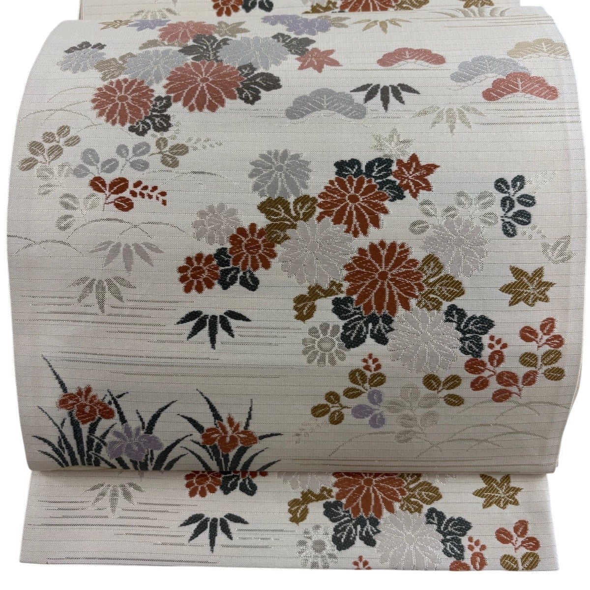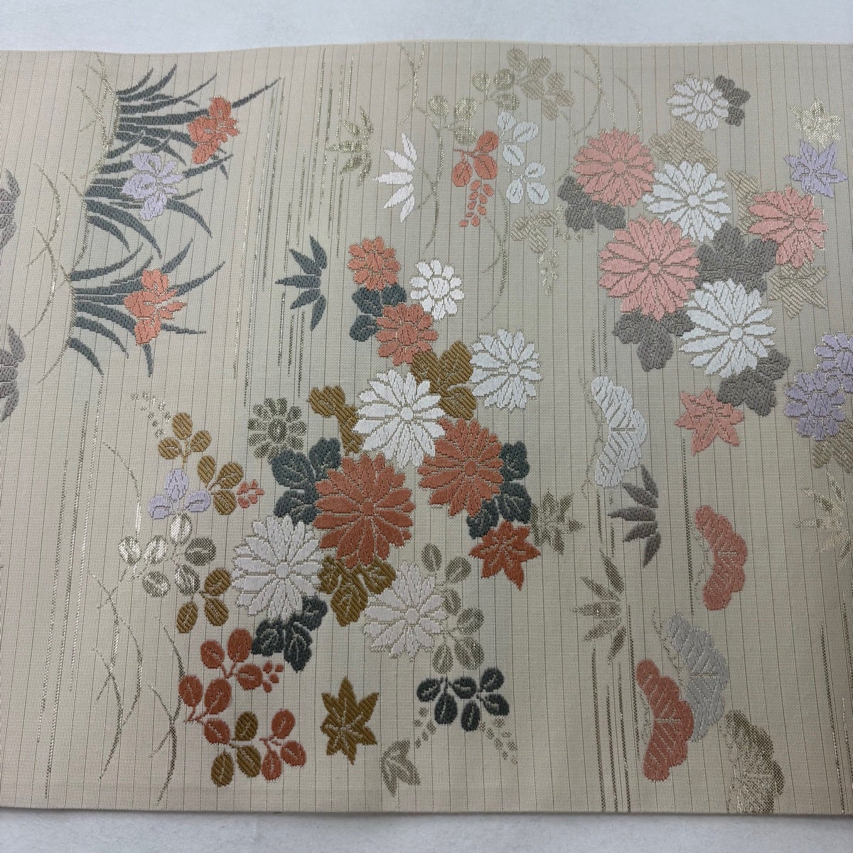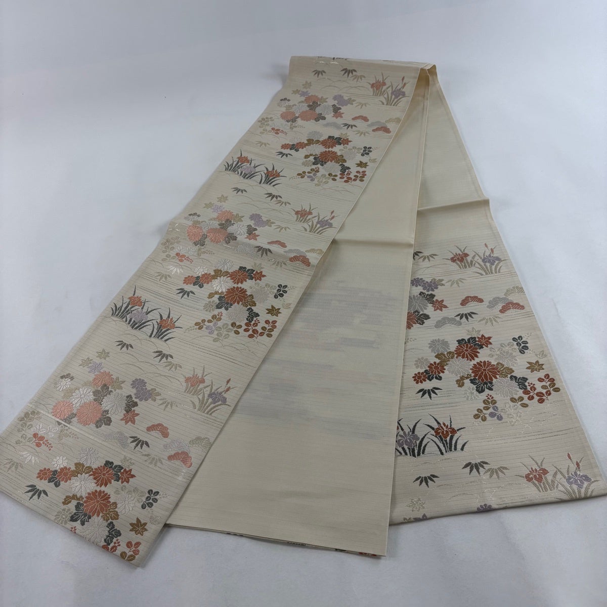 【美品】 名古屋帯 秀品 夏帯 絽 八寸名古屋帯 桔梗 流水 金銀糸 クリーム 正絹