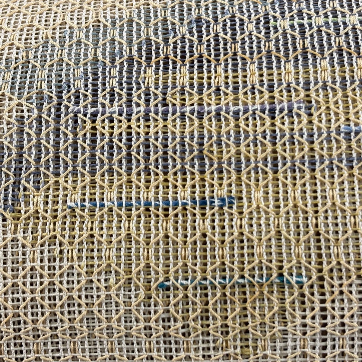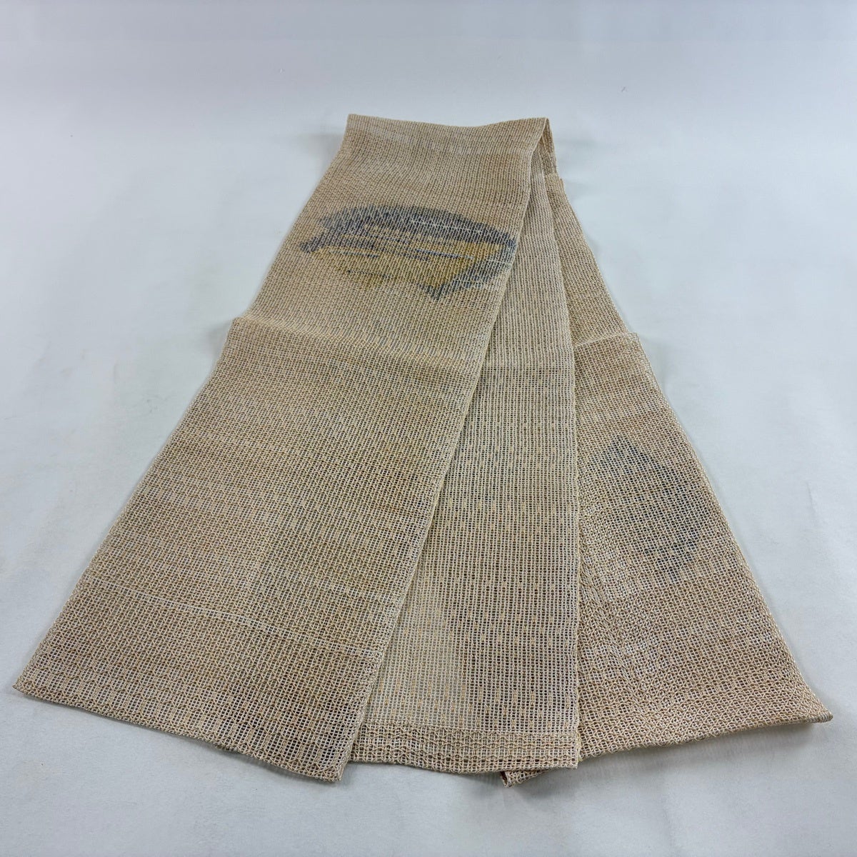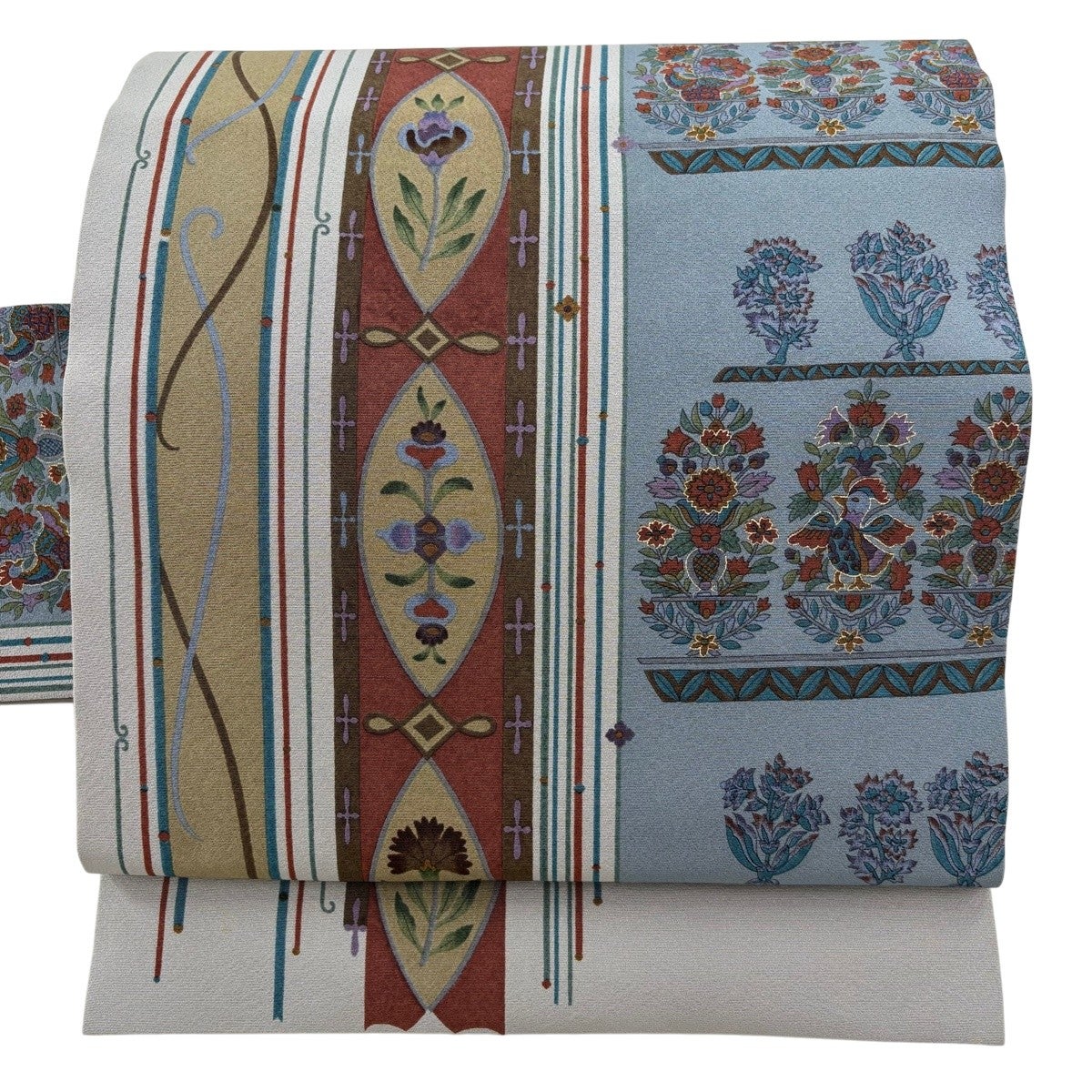 開き名古屋帯 秀品 落款あり 唐辛子 幾何学模様 縮緬 青灰色 正絹