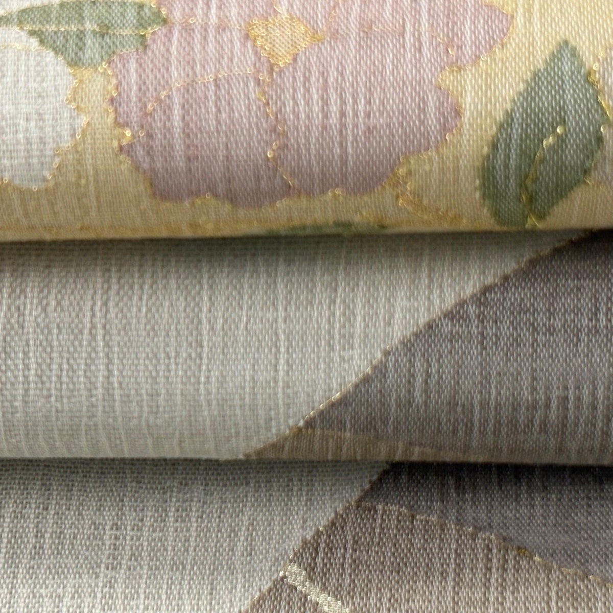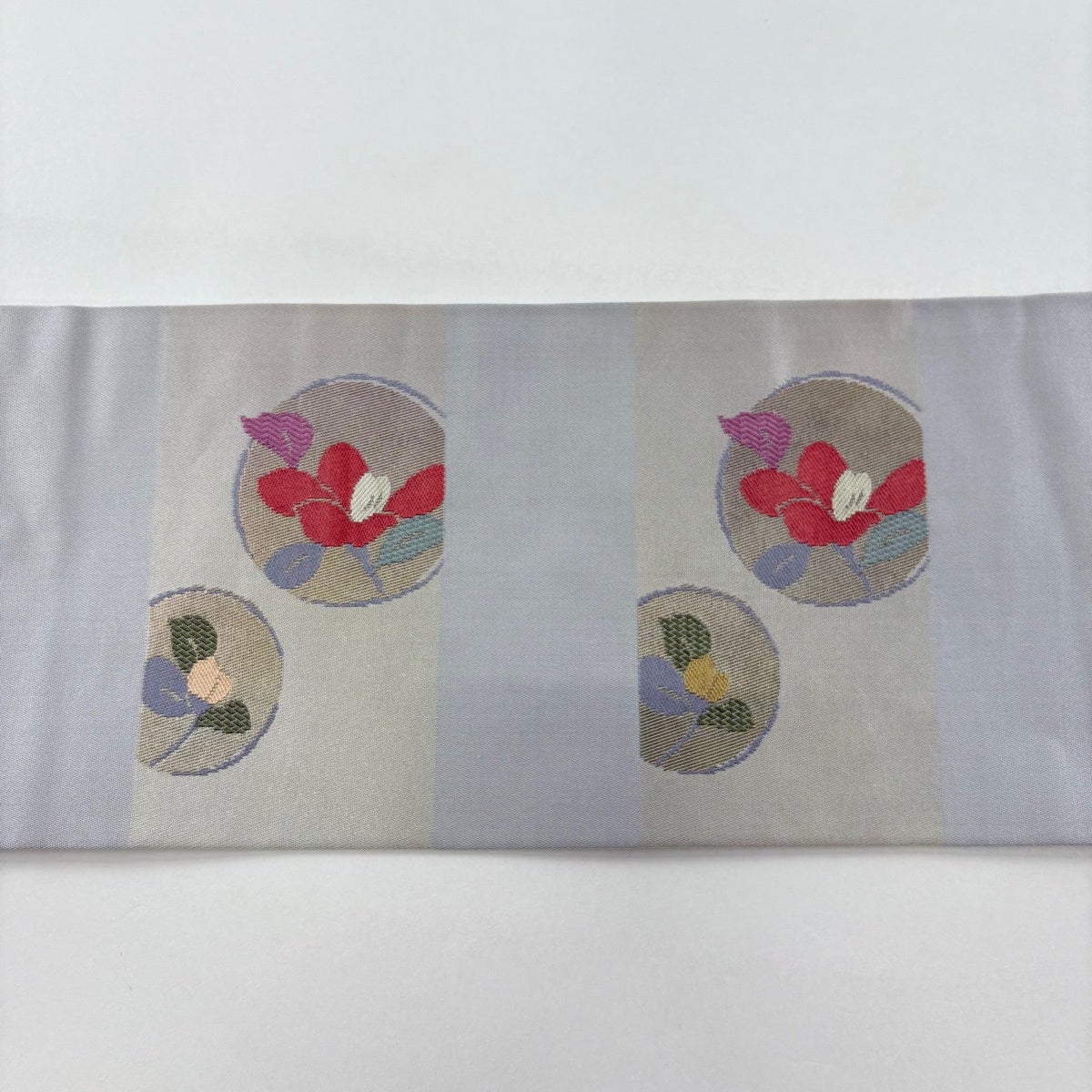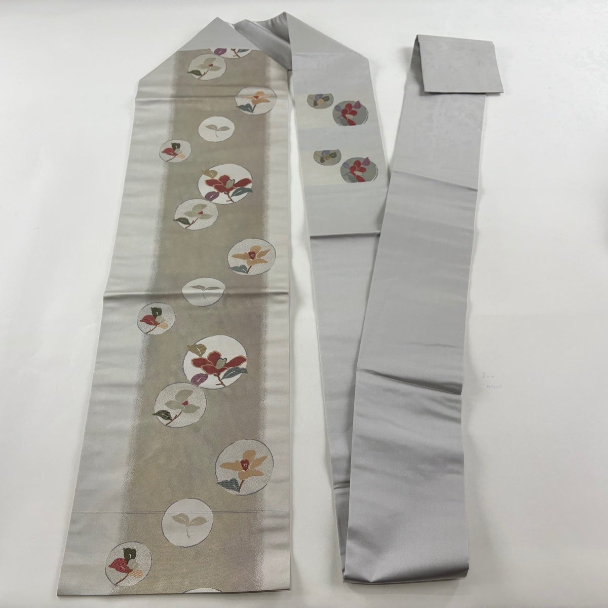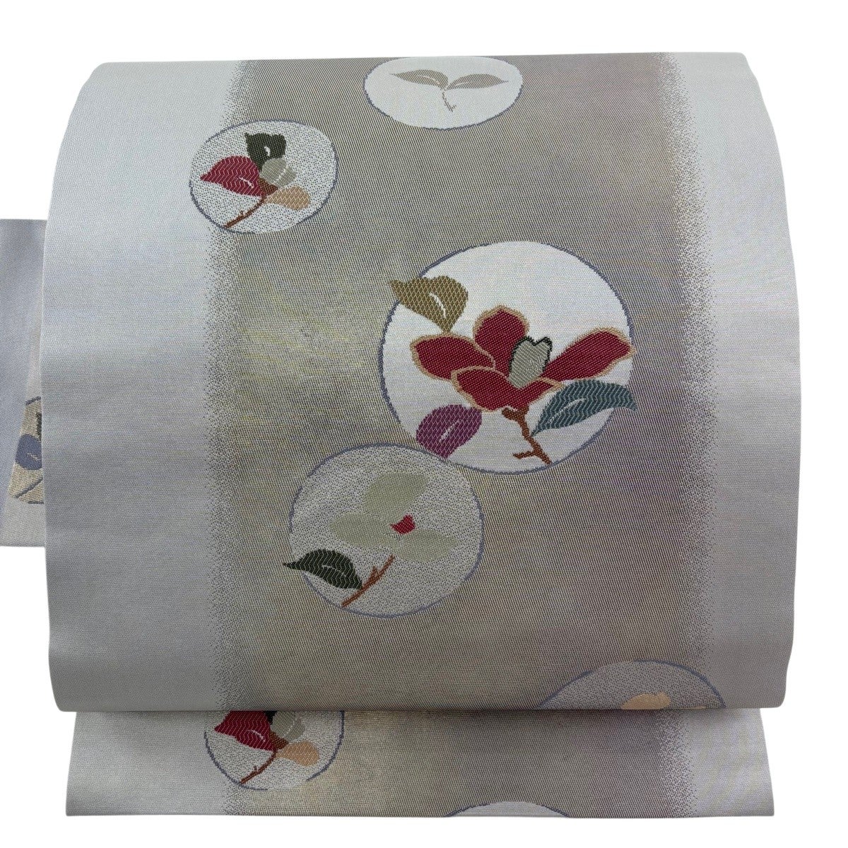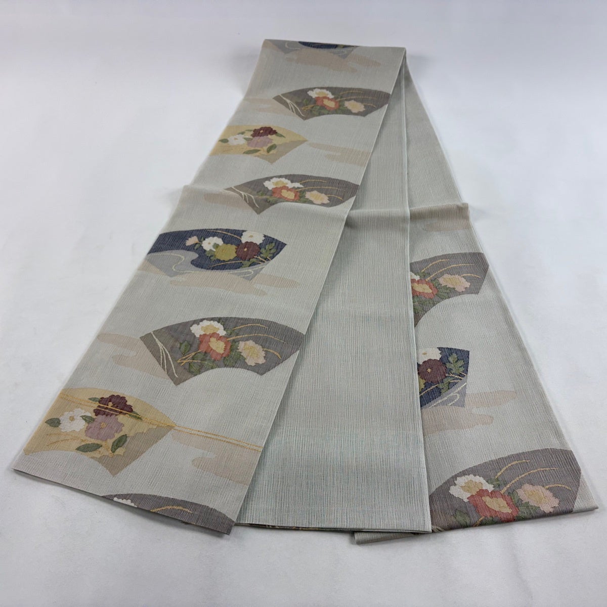 【美品】 袋帯 秀品 夏帯 扇面 枝花 金糸 灰色 六通 正絹