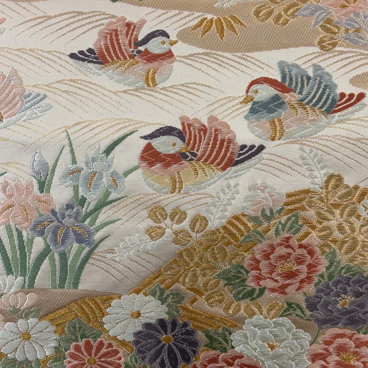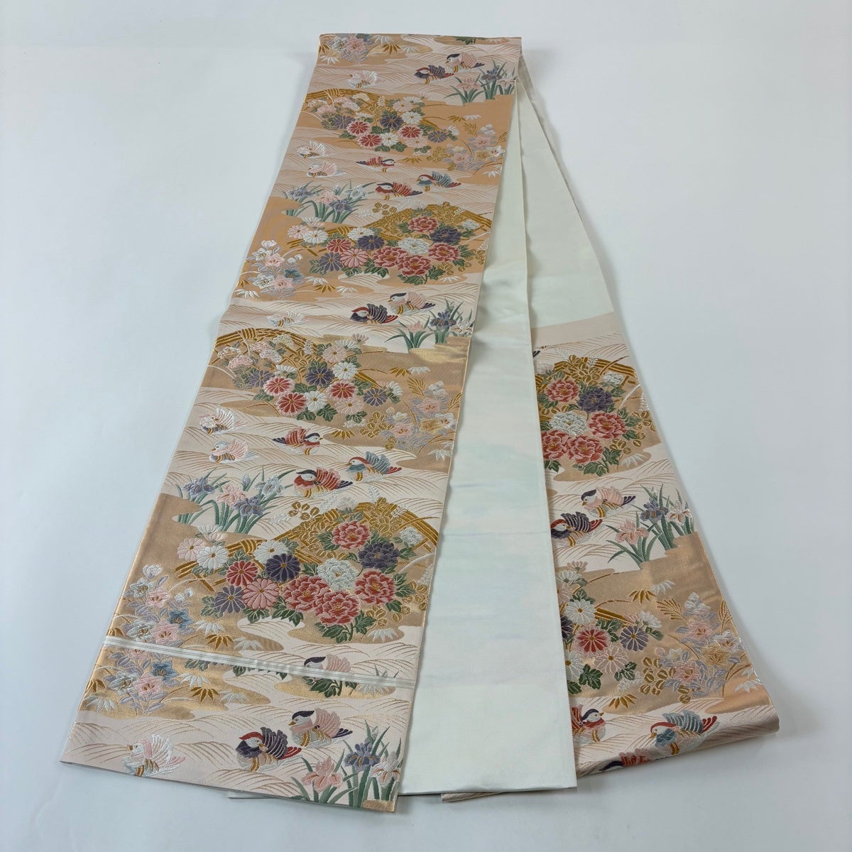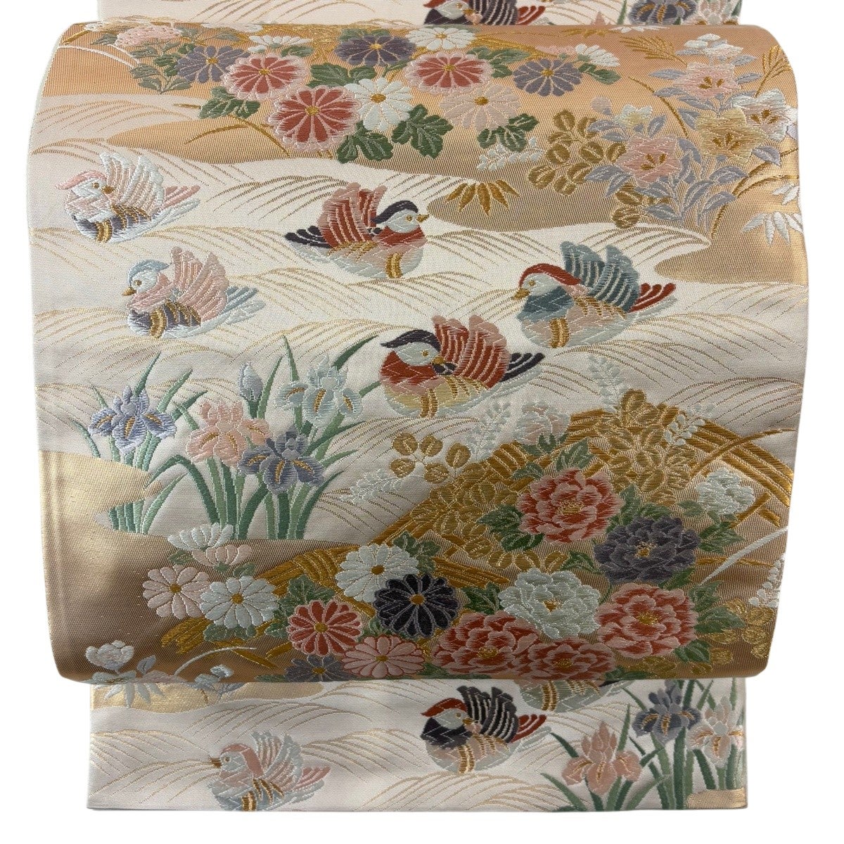 【美品】 袋帯 秀品 草花 鴛鴦 金銀糸 箔 ピンクベージュ 六通 正絹