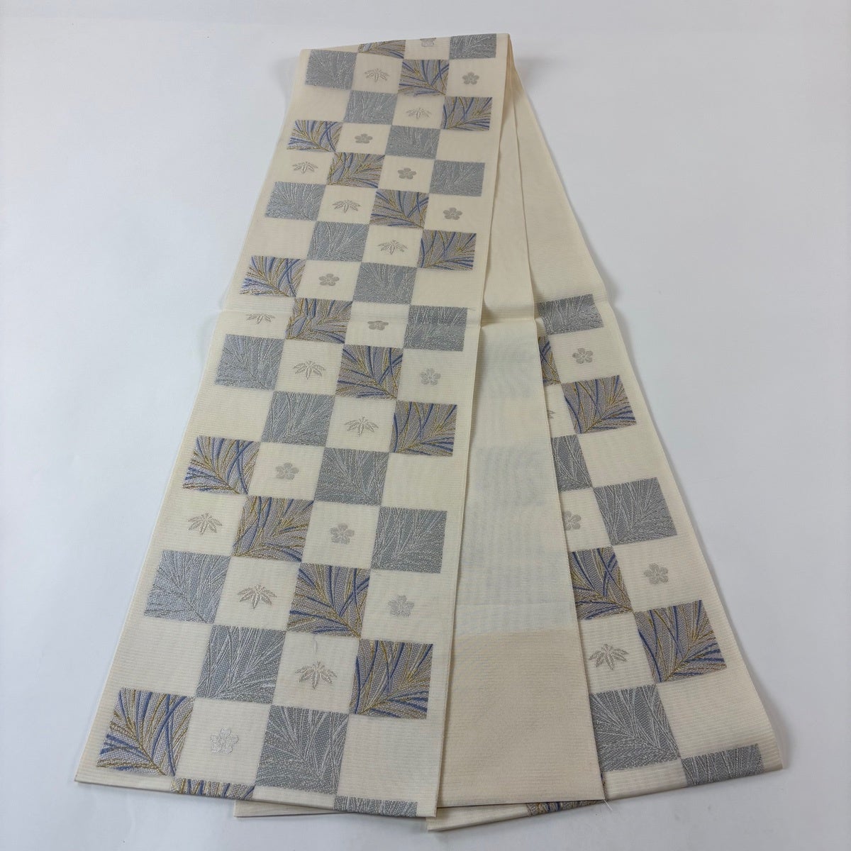 名古屋帯 秀品 夏帯 絽 八寸名古屋帯 市松 流水 銀糸 灰白 正絹
