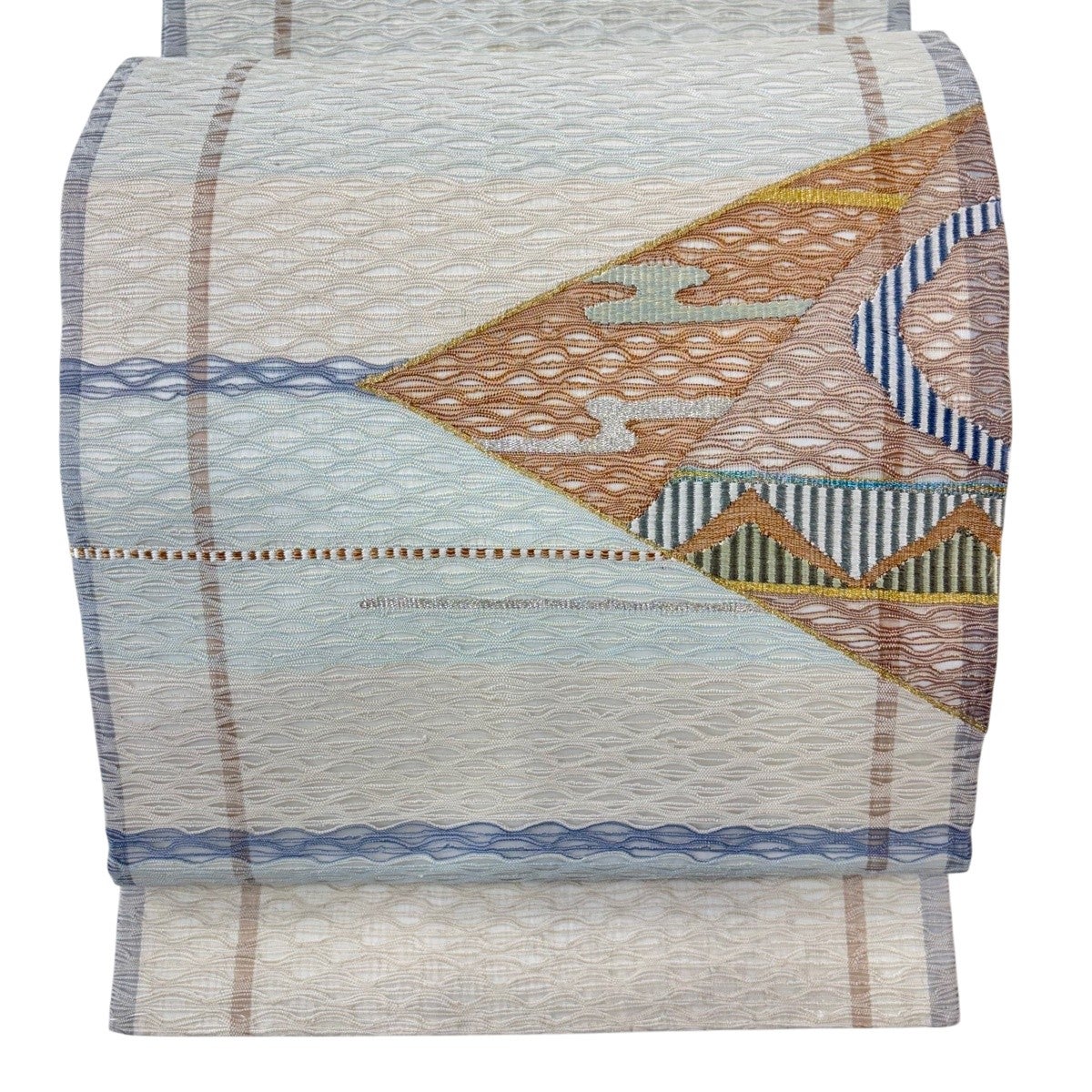 袋帯 秀品 夏帯 幾何学模様 金彩 灰茶 お太鼓柄 正絹