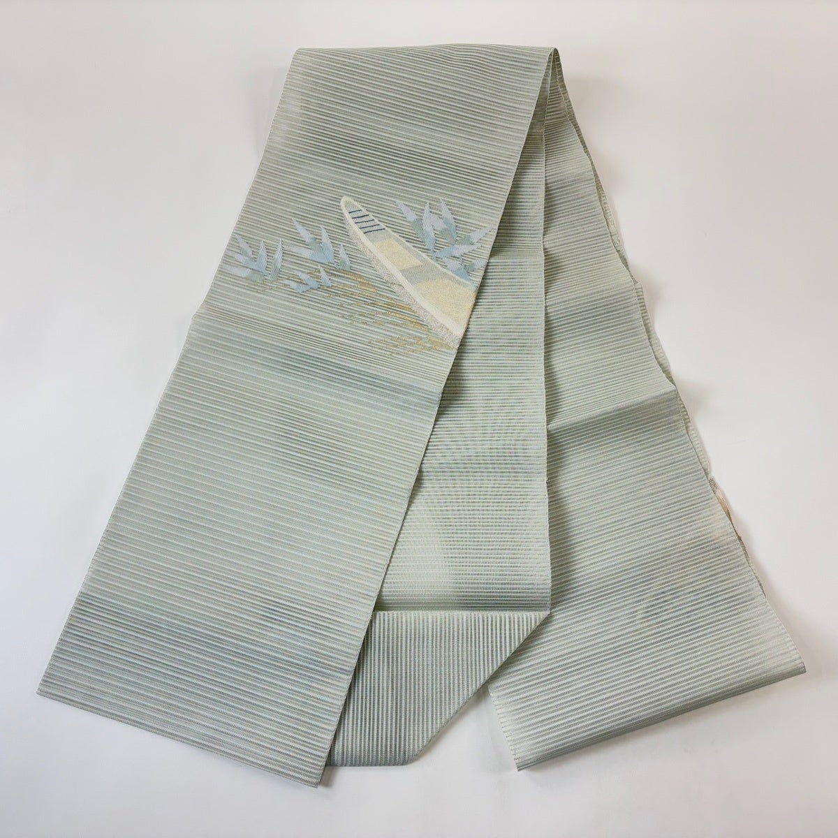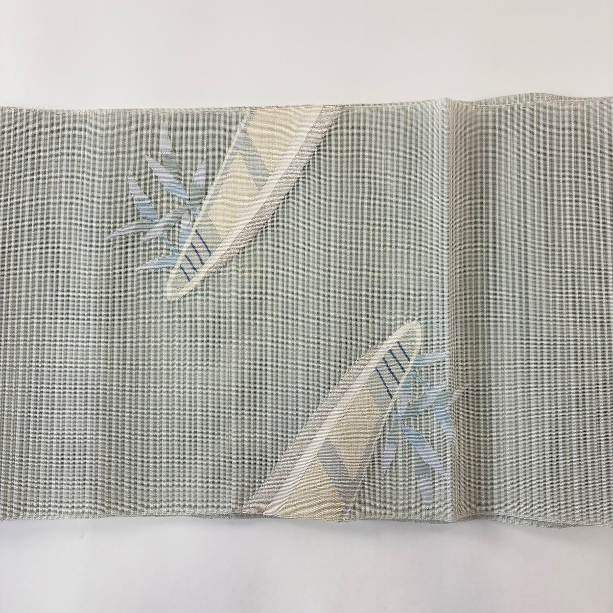 袋帯 秀品 夏帯 紗 笹 金糸 ぼかし 灰色 お太鼓柄 正絹
