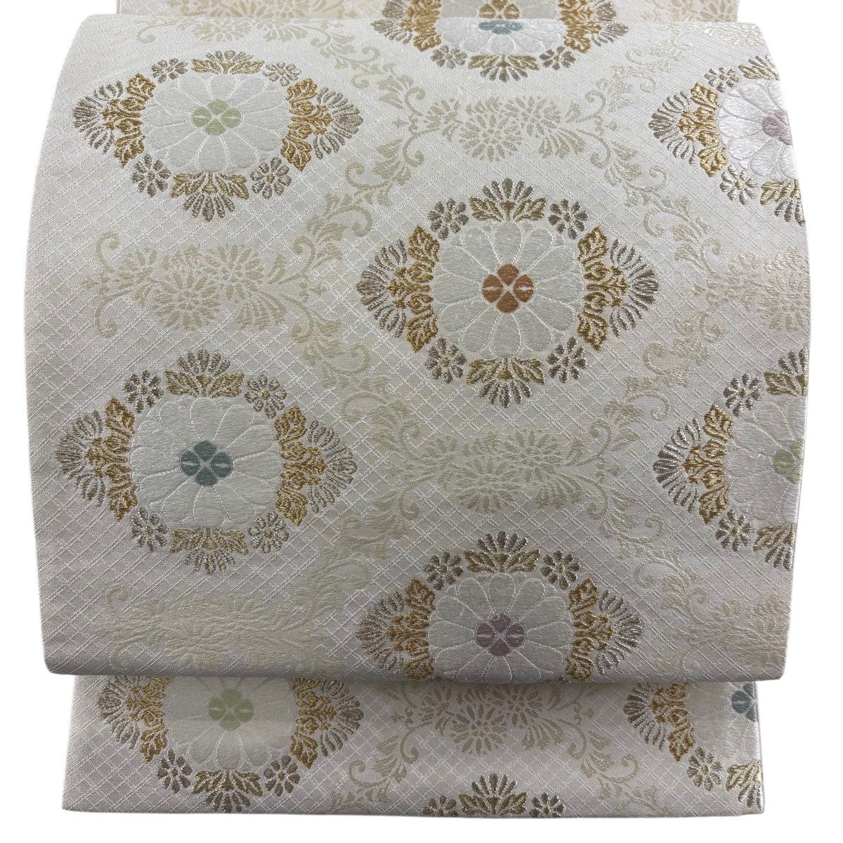 【美品】 袋帯 名品 都喜ヱ門 落款あり 関西仕立て 雪輪 草花 螺鈿箔 金彩 クリーム お太鼓柄 正絹