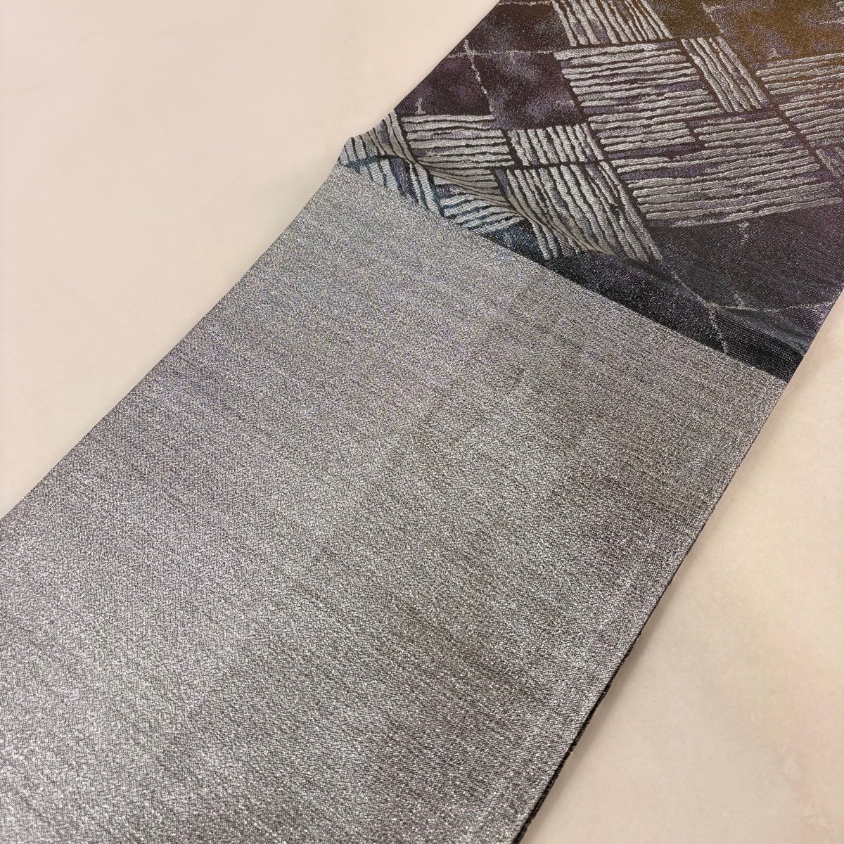 名古屋帯 秀品 夏帯 八寸名古屋帯 松葉仕立て トンネル仕立て 幾何学模様 縞 箔 灰白 正絹
