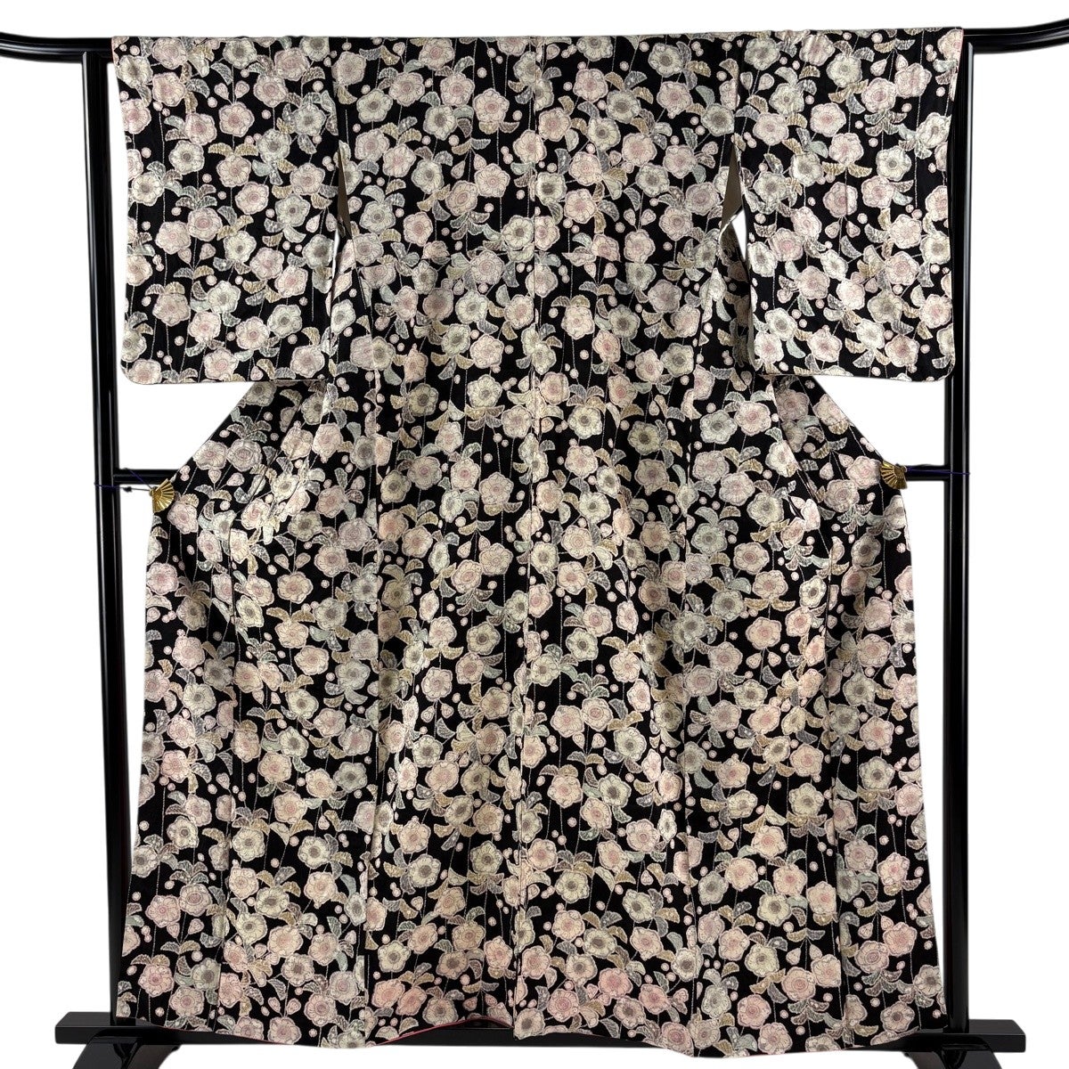 小紋 身丈156cm 裄丈63cm S 袷 縦縞 枝花 金彩 薄ピンク 正絹 秀品