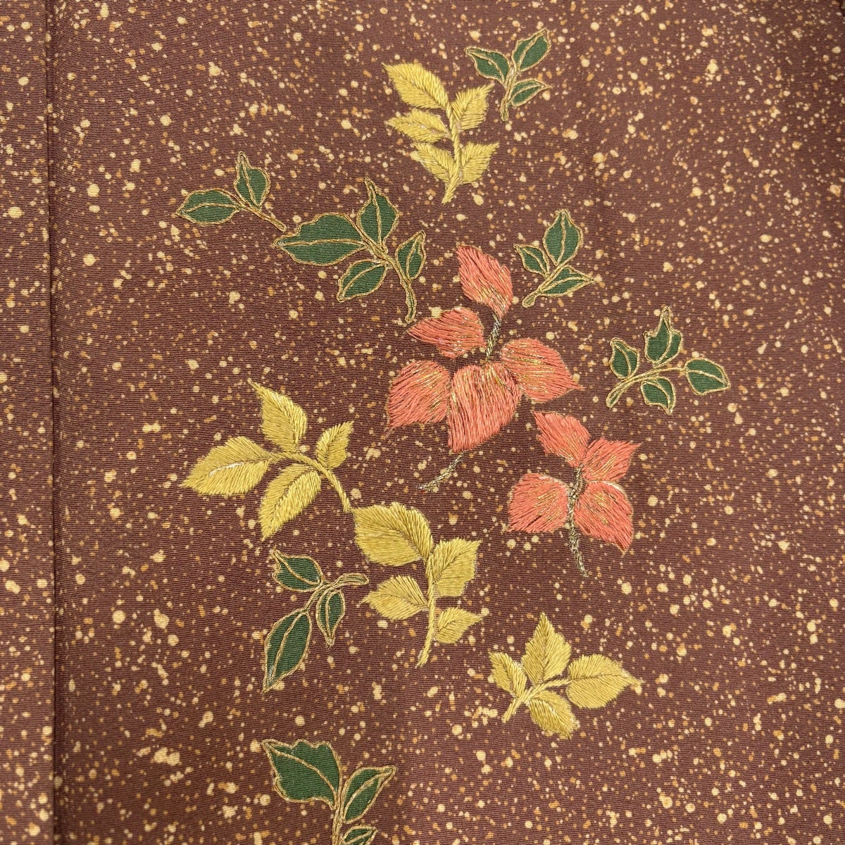 付下げ 身丈155cm 裄丈62.5cm S 袷 葉柄 幾何学模様 金糸 刺繍 茶色 正絹 秀品 一つ紋