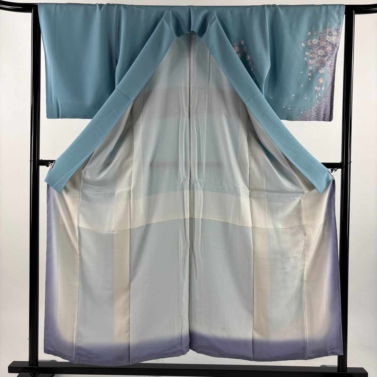 付下げ 身丈159cm 裄丈63cm S 単衣 紬地 落款あり 童 家屋 ぼかし 薄緑 正絹 秀品 一つ紋