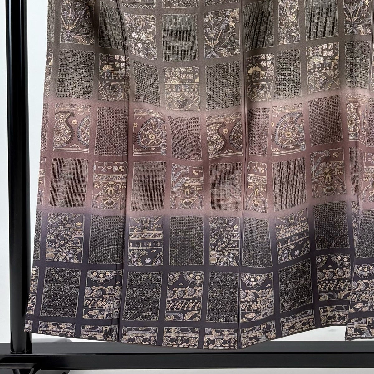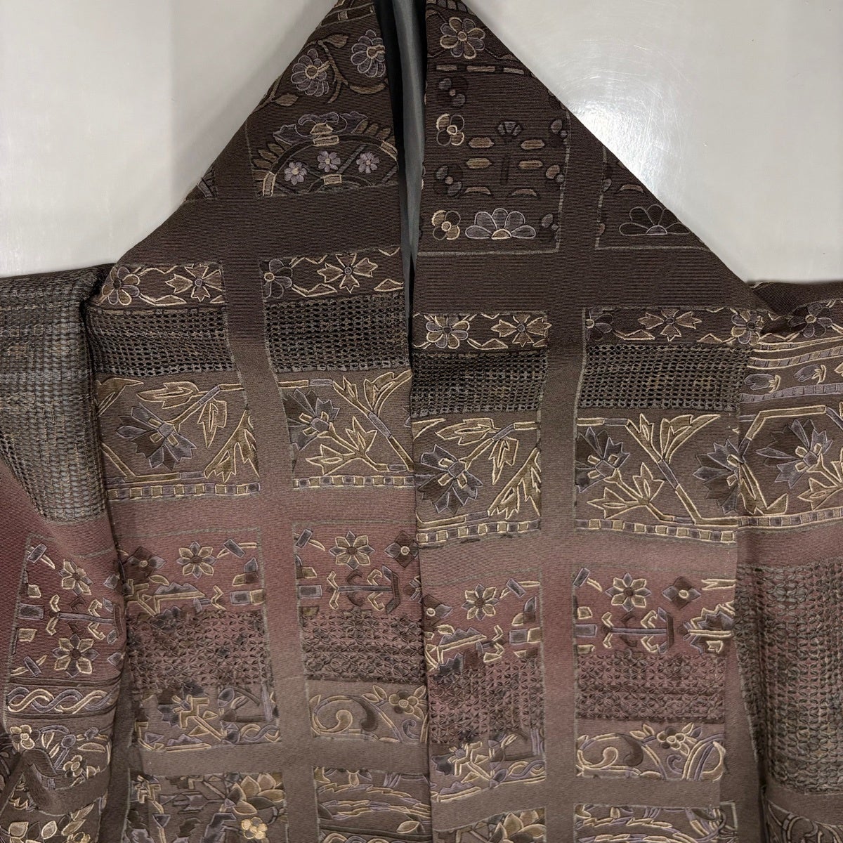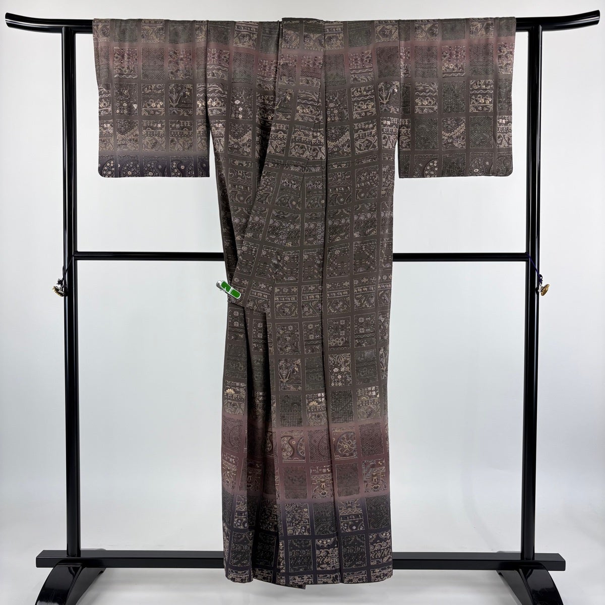 【美品】 訪問着 身丈160.5cm 裄丈63cm S 袷 紬地 幾何学模様 染め分け ぼかし 茶色 正絹 秀品