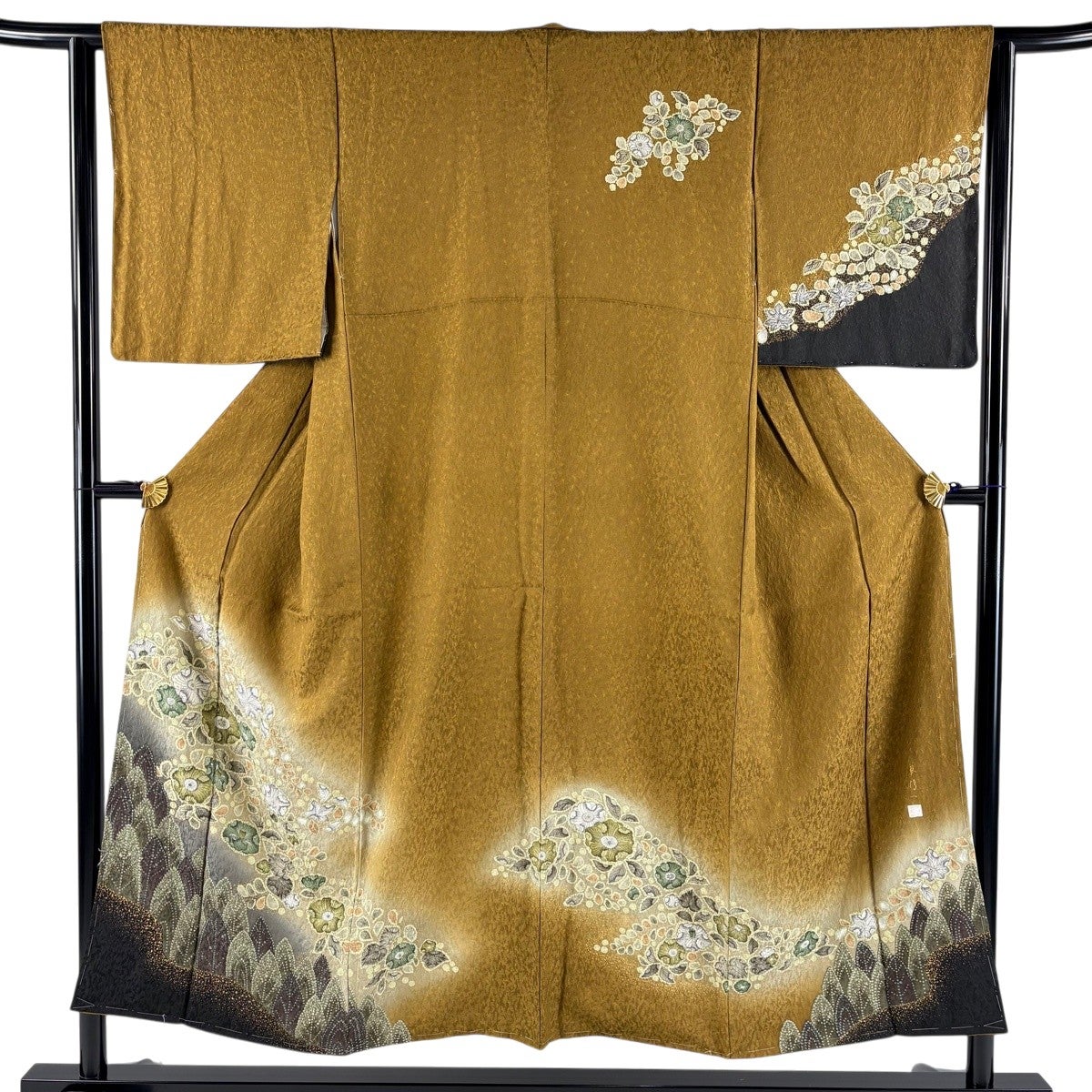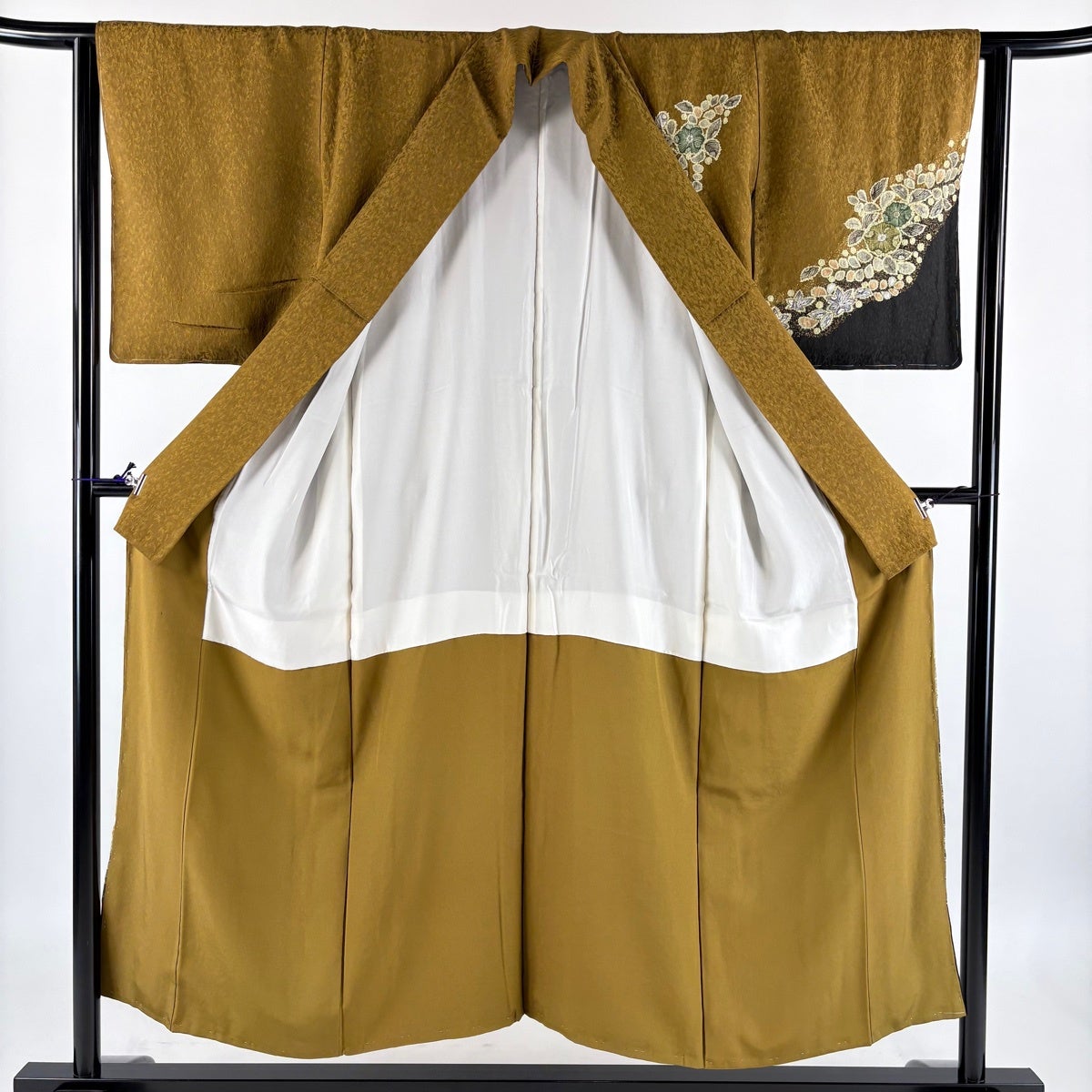 【美品】 訪問着 身丈159cm 裄丈62cm S 袷 扇面 草花 金銀彩 ぼかし 山吹茶色 正絹 秀品 一つ紋