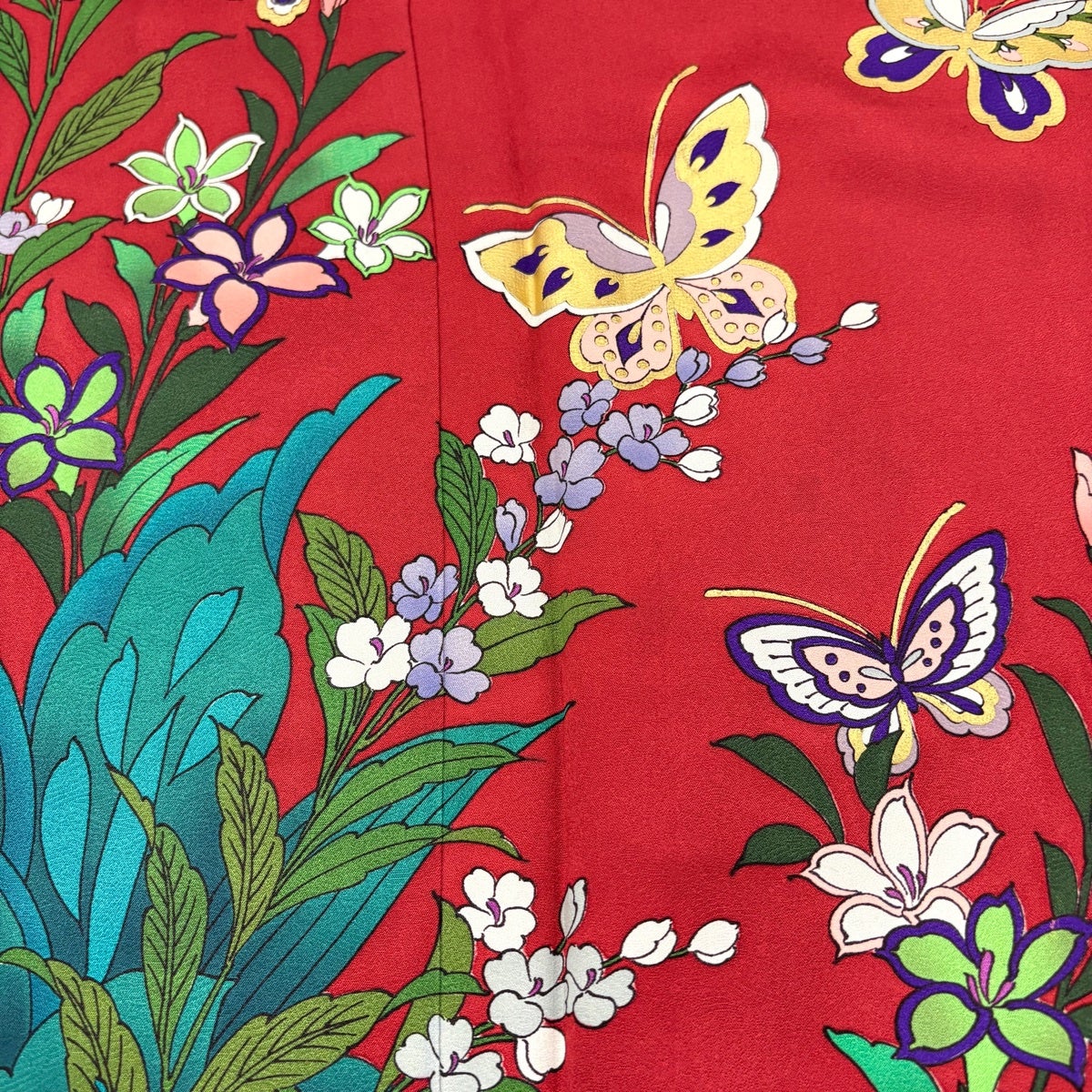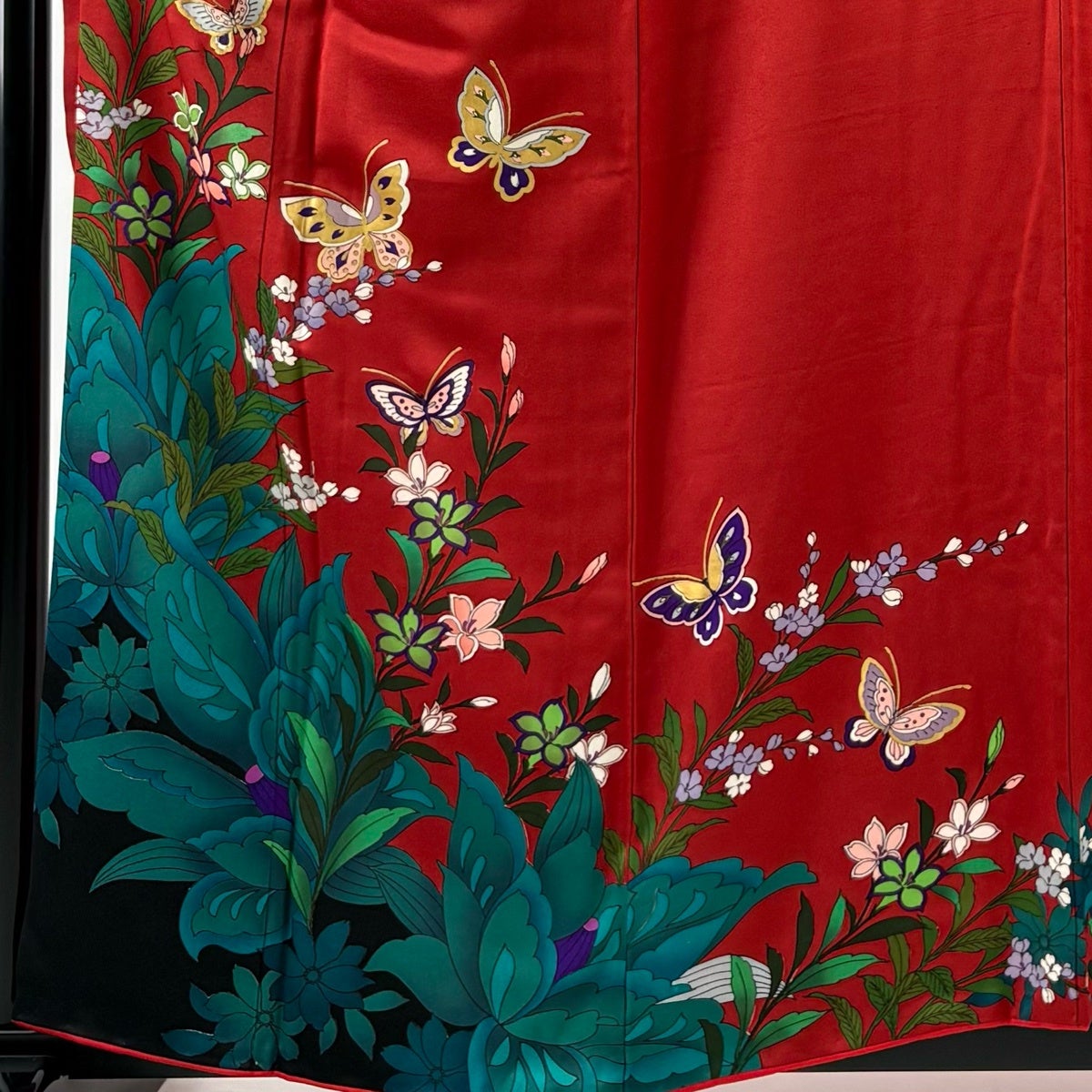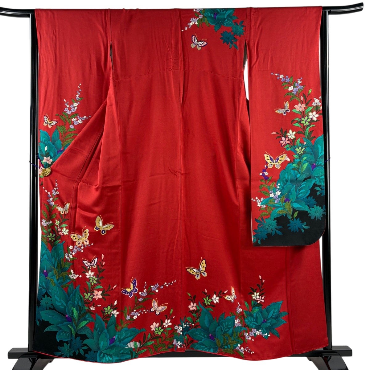 振袖 身丈165.5cm 裄丈65.5cm M 袷 袋帯フルセット 草花 シルエット 金銀彩 染め分け 赤 正絹 秀品