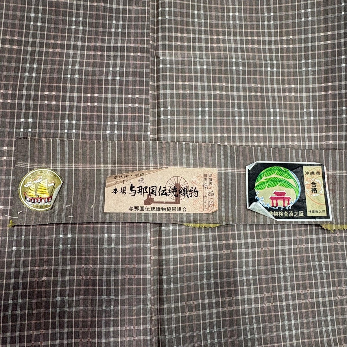 紬 身丈162cm 裄丈66cm M 単衣 草木染め 与那国伝統織物 証紙あり 格子 薄小豆 正絹 逸品