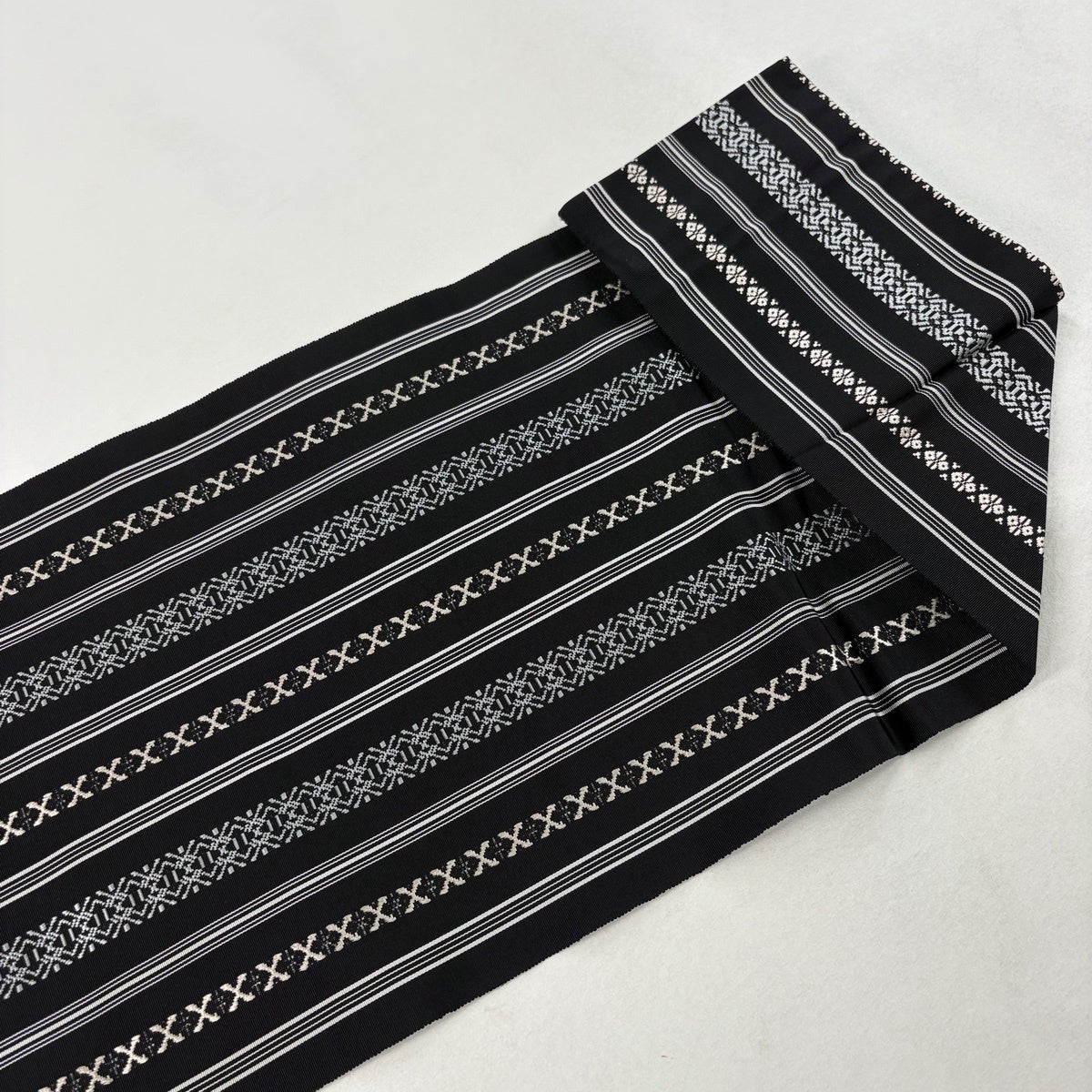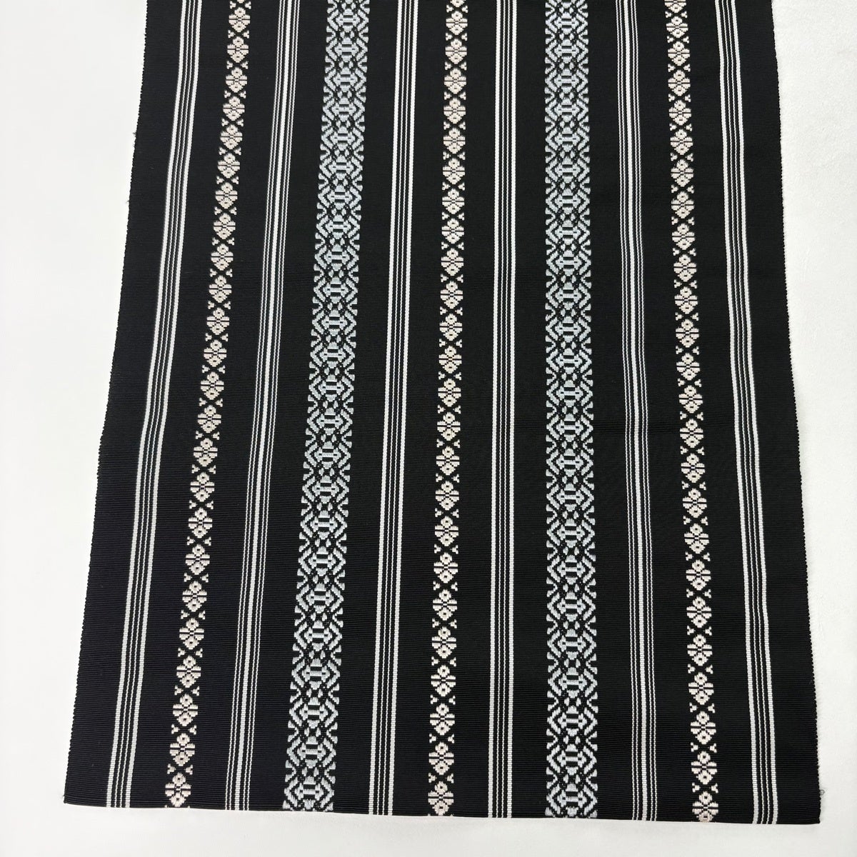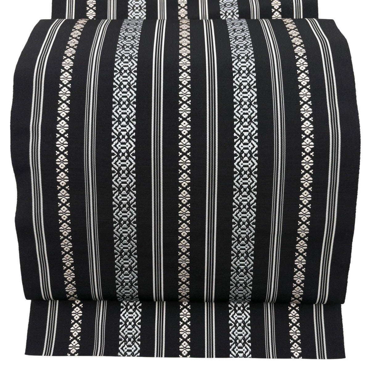 【美品】 名古屋帯 逸品 八寸名古屋帯 松葉仕立て やまと 縞 幾何学 黒 正絹