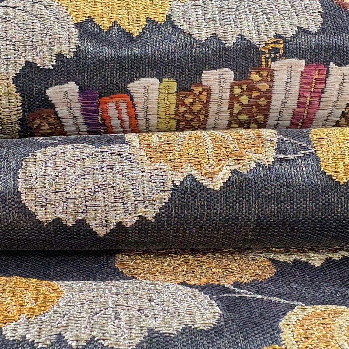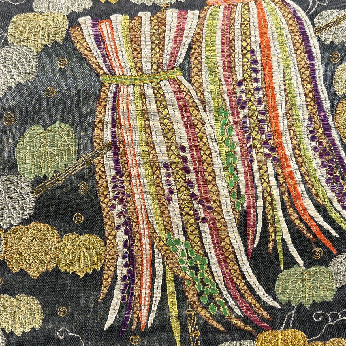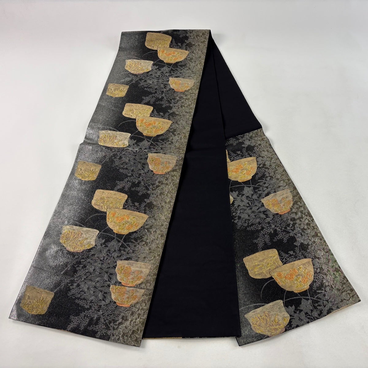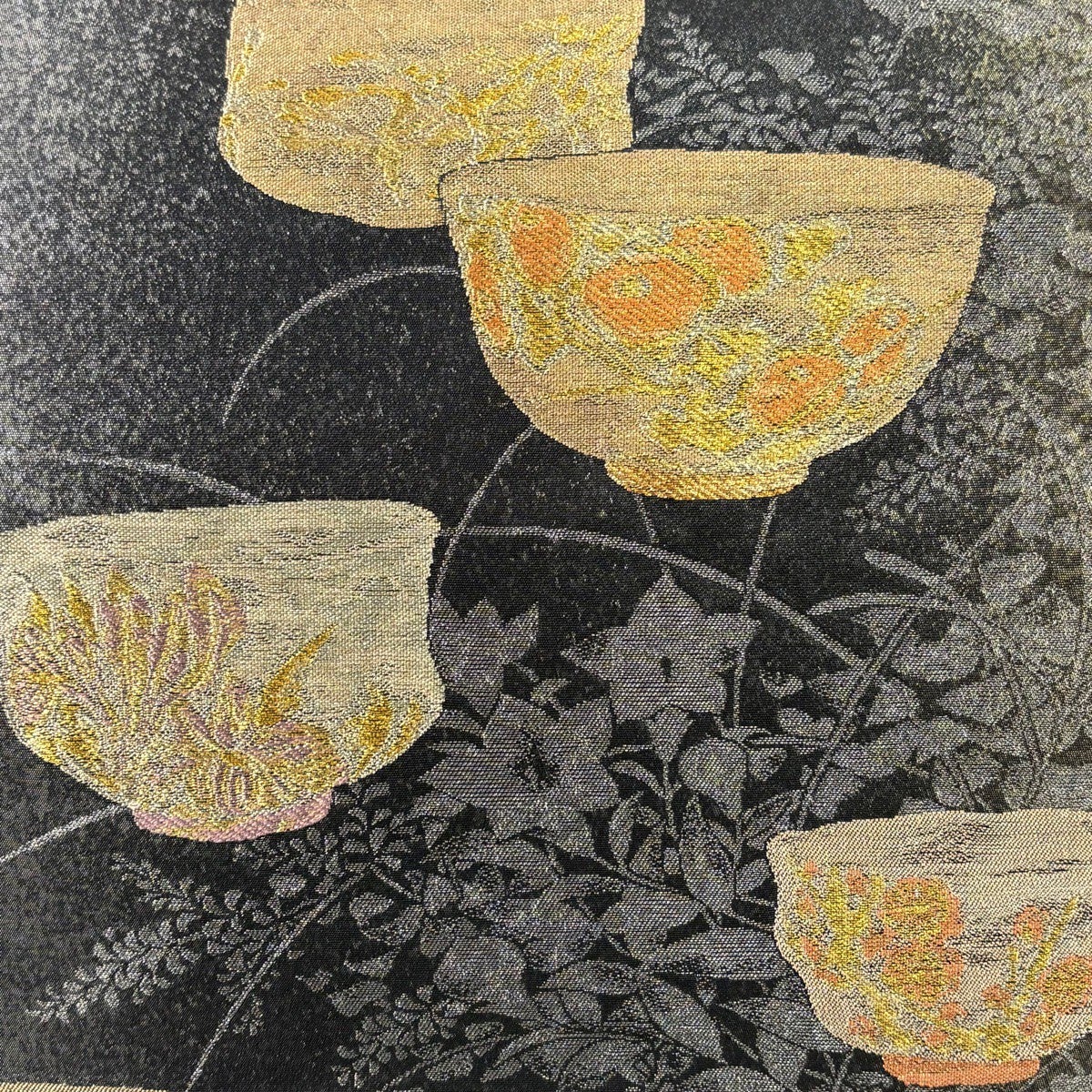 【美品】 袋帯 逸品 じゅらく 落款あり 茶碗 草花 金銀糸 箔 黒 六通 正絹