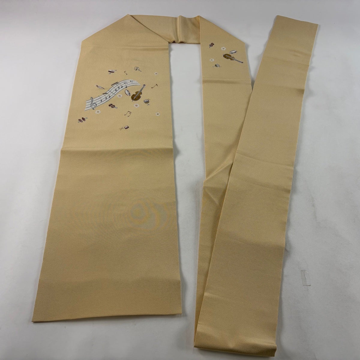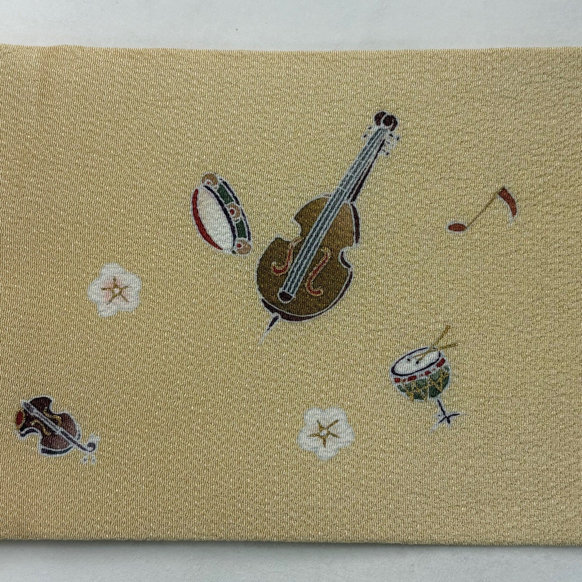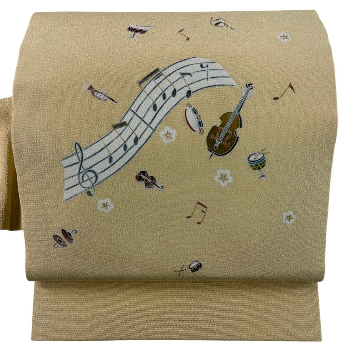 【美品】 名古屋帯 逸品 楽器 音符 金彩 縮緬 ベージュ 正絹