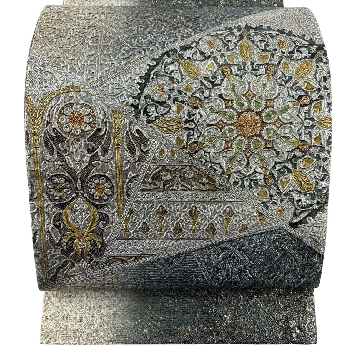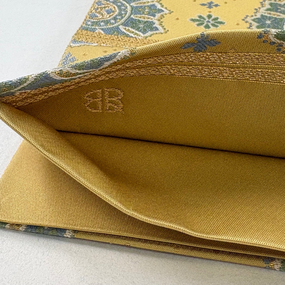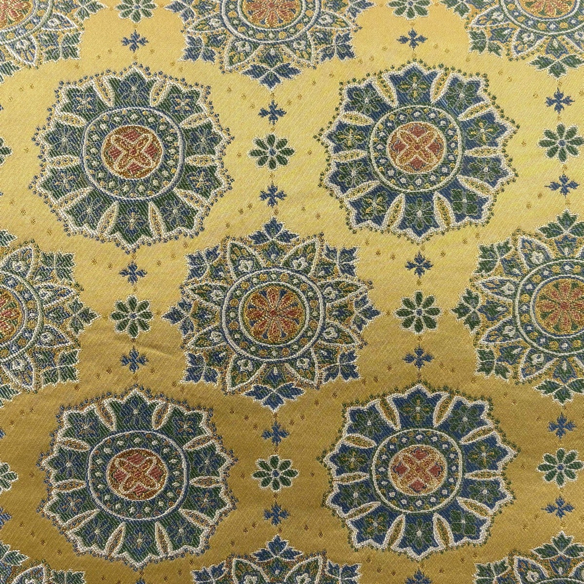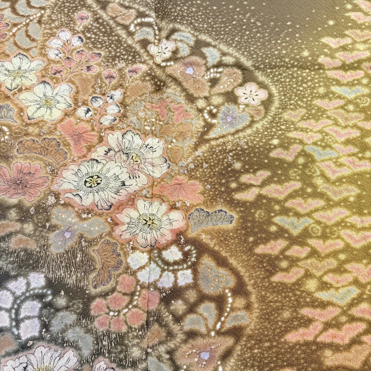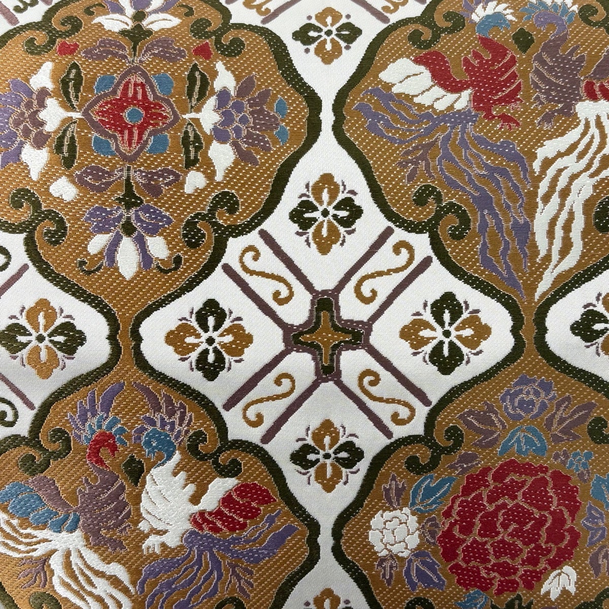 【美品】 袋帯 逸品 服部織物 落款あり 華文 花 箔 薄黄土色 六通 正絹