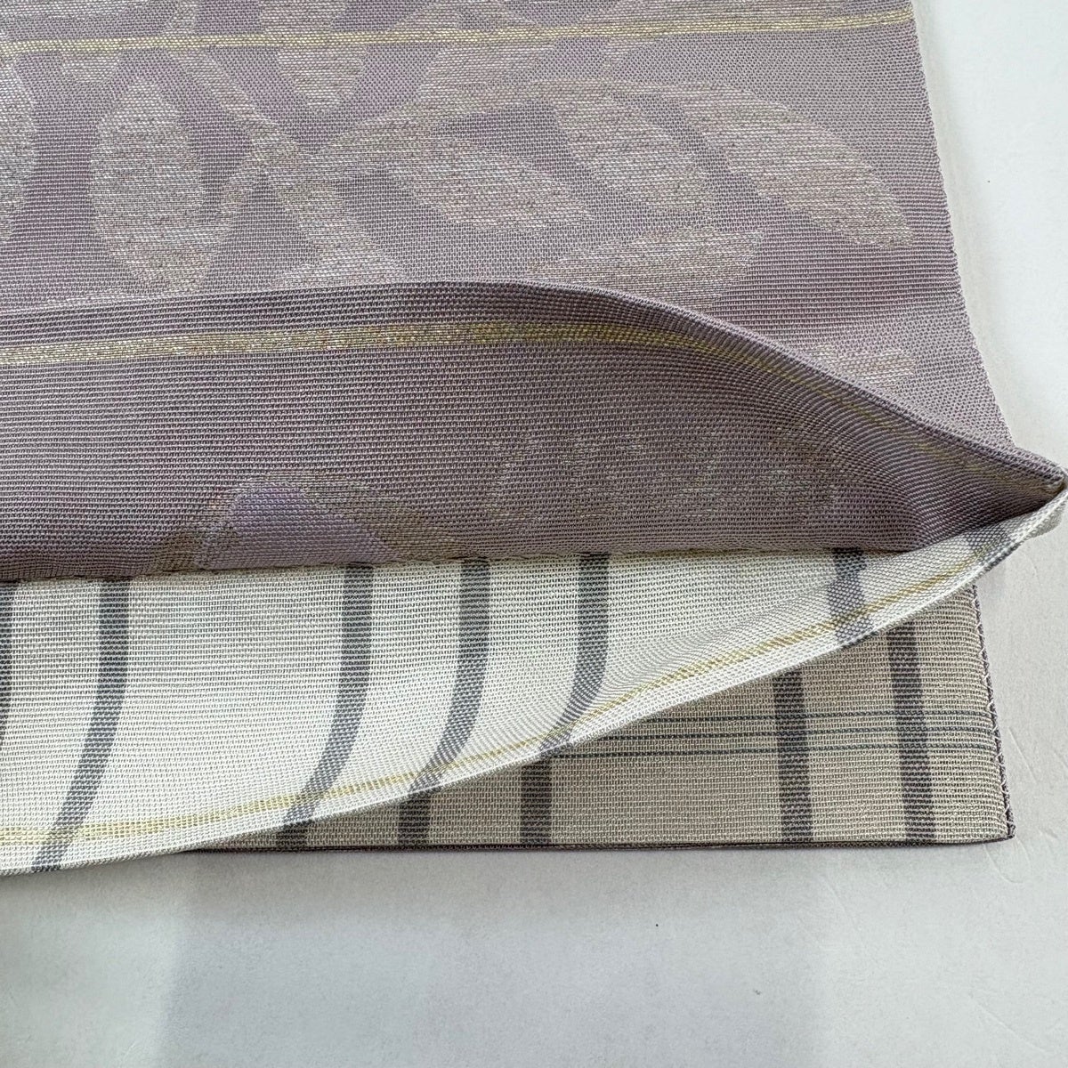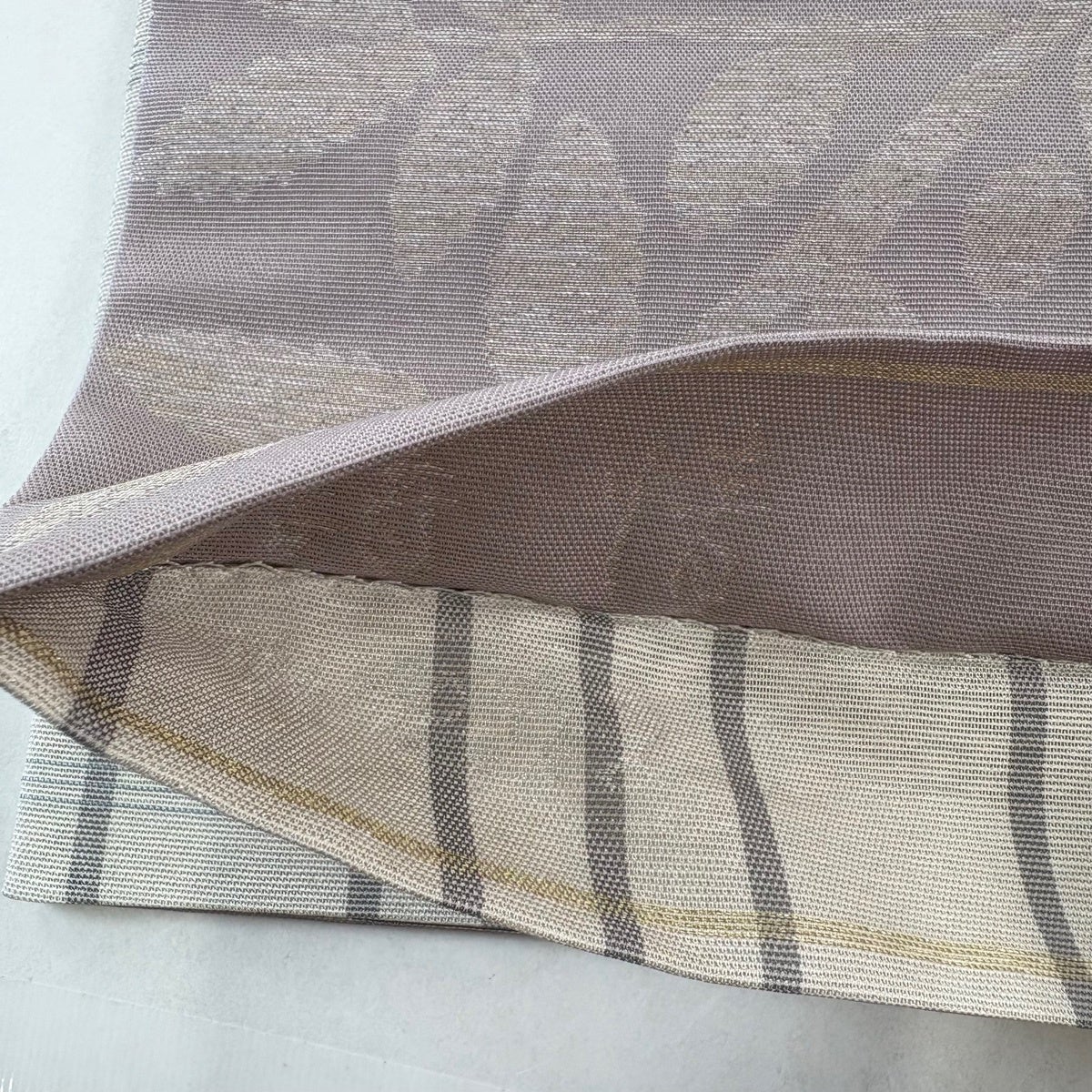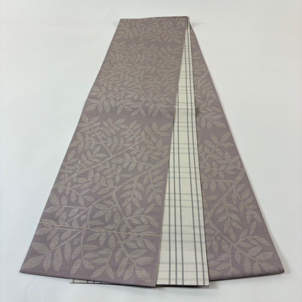 【美品】 袋帯 逸品 となみ織物 落款あり 詩情 リバーシブル 樹木 格子 箔 灰紫 全通 正絹