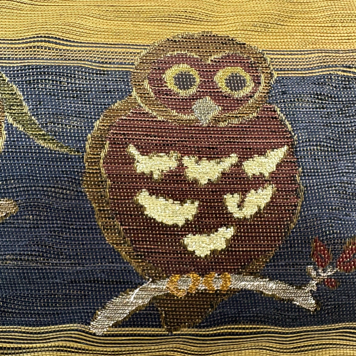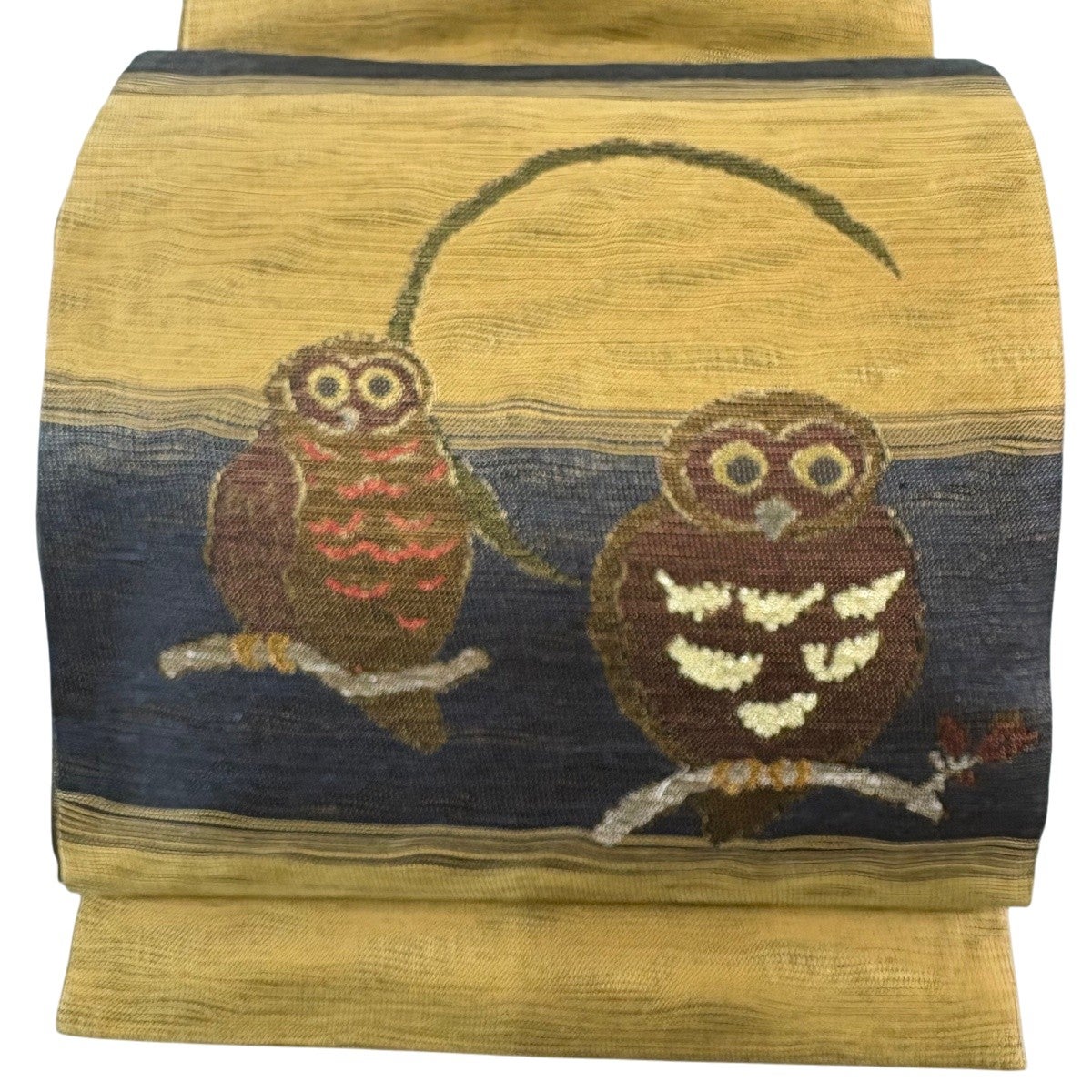 【美品】 袋帯 逸品 落款あり 織人七人衆 やまと リバーシブル ふくろう 鳥獣戯画 箔 金糸 黄土色 お太鼓柄 正絹