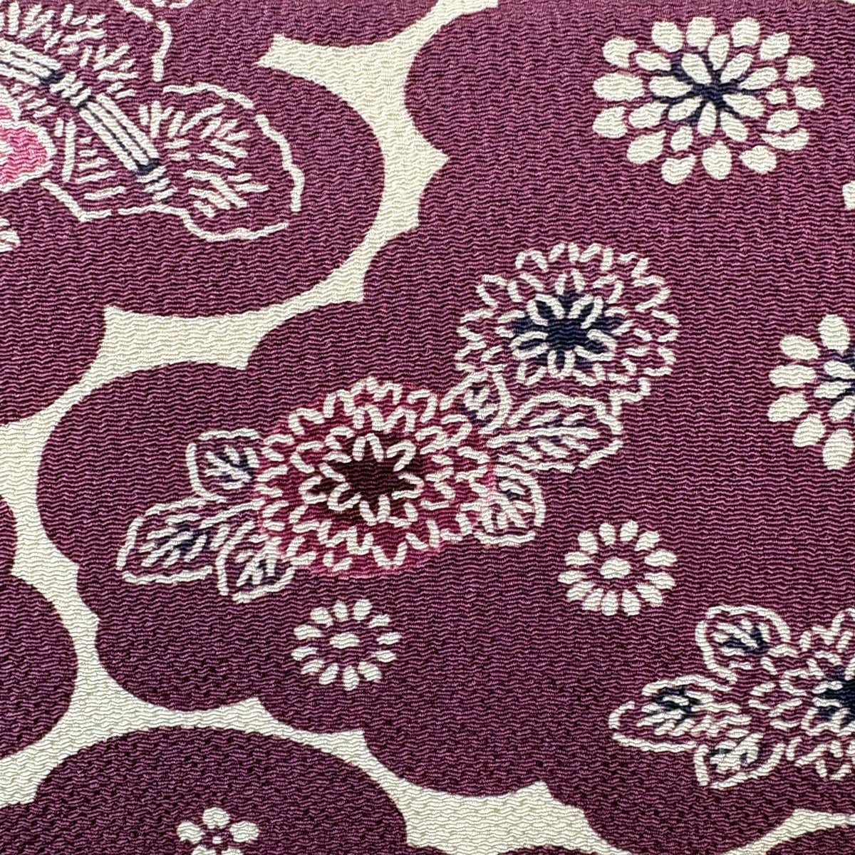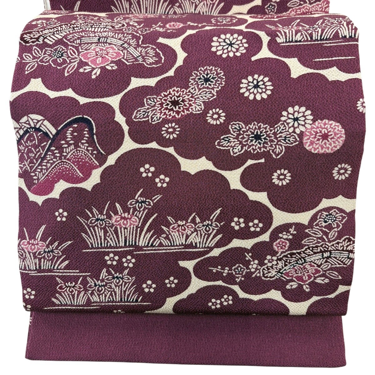 【美品】 開き名古屋帯 逸品 栗山吉三郎 落款あり 雲文 草花 縮緬 赤紫 正絹