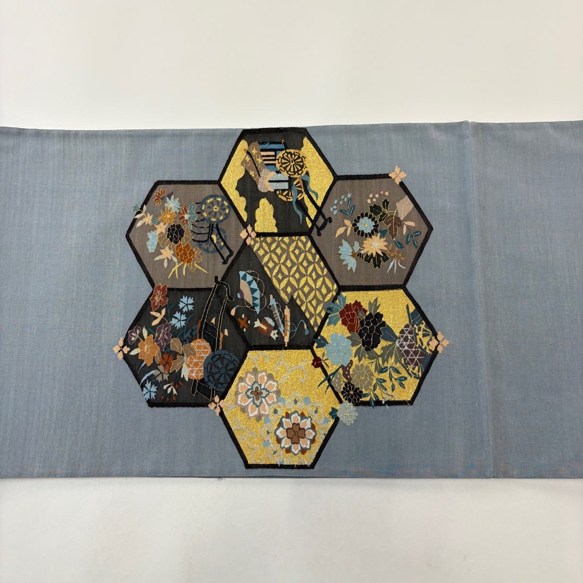 【美品】 袋帯 逸品 山口美術織物 落款あり 源氏香之図 笹梅 刺繍 箔 ベージュ 六通 正絹