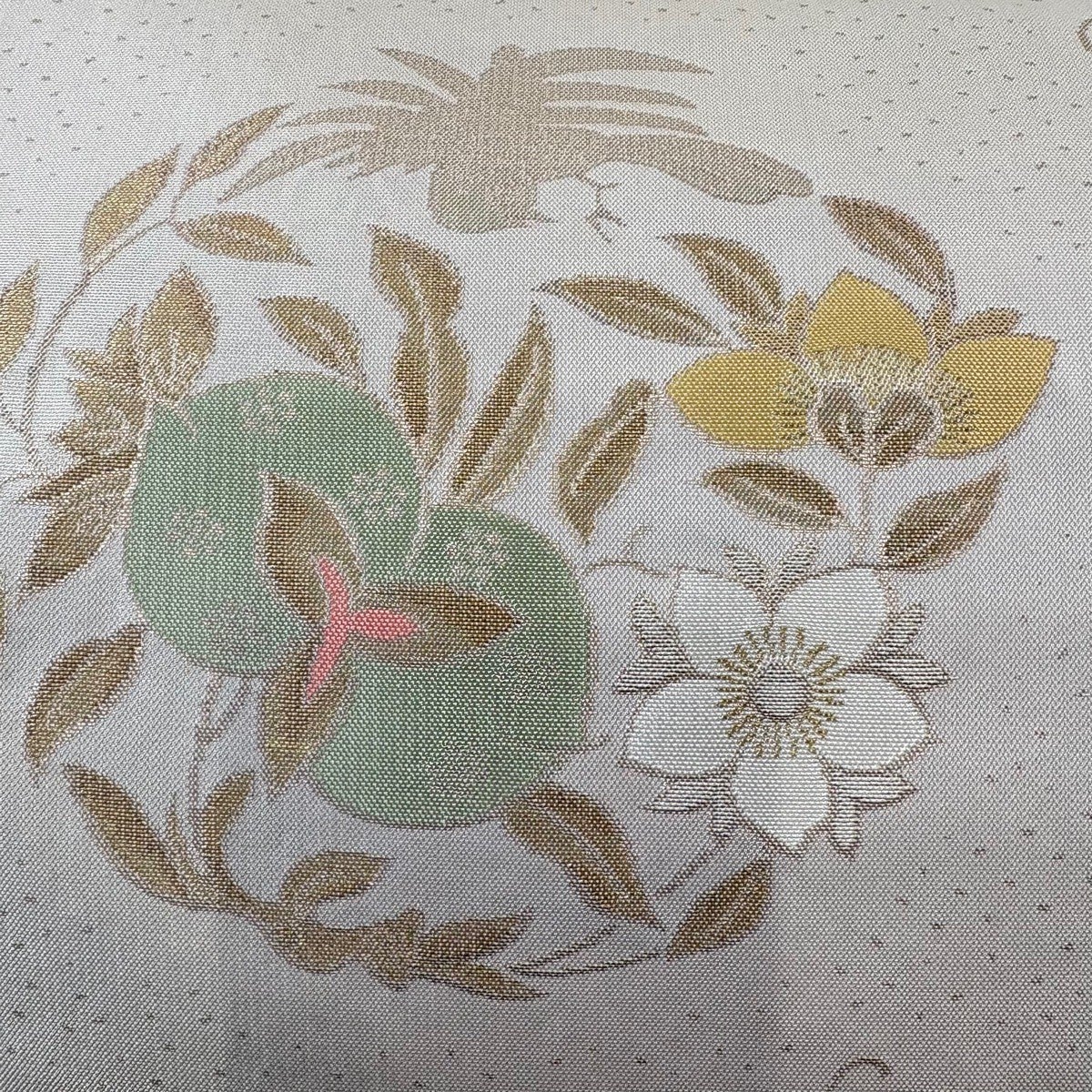 【美品】 袋帯 逸品 洛風林 落款あり 花丸文 蝶 金糸 灰白 お太鼓柄 正絹