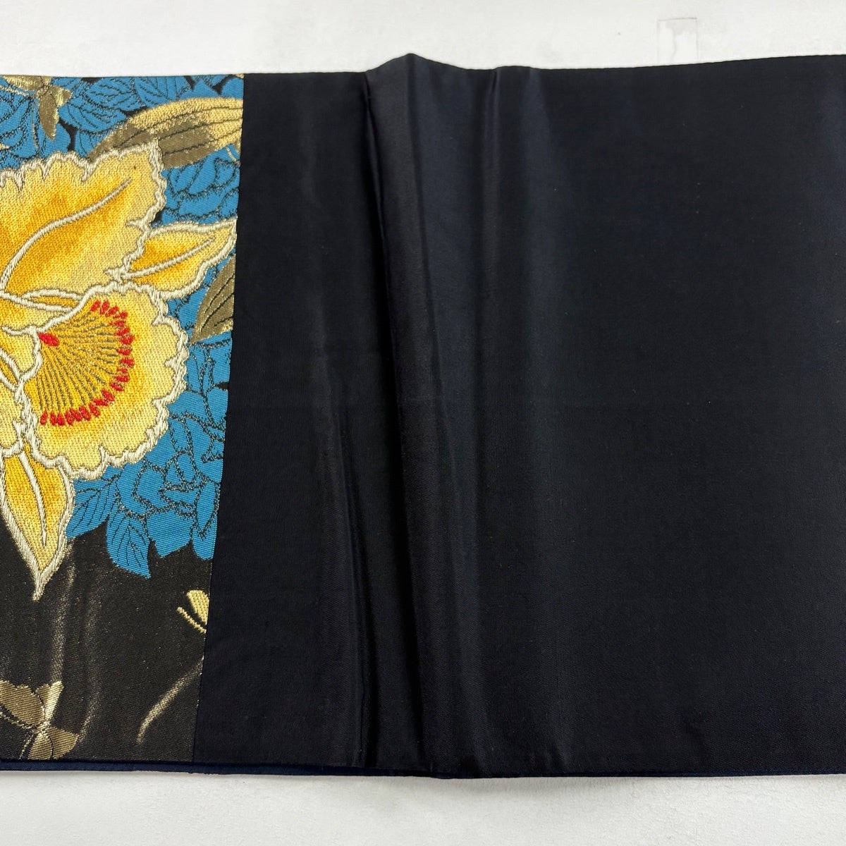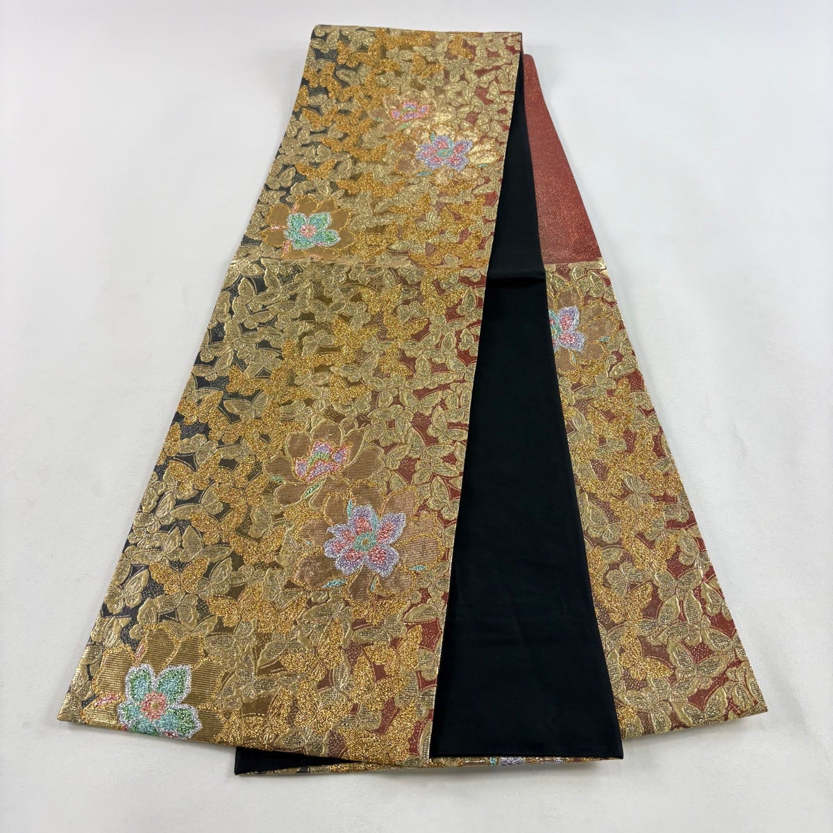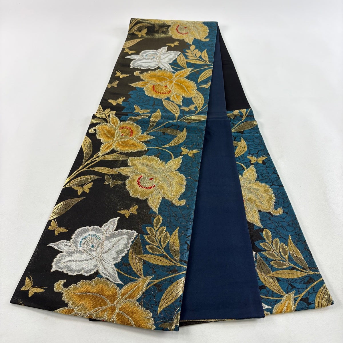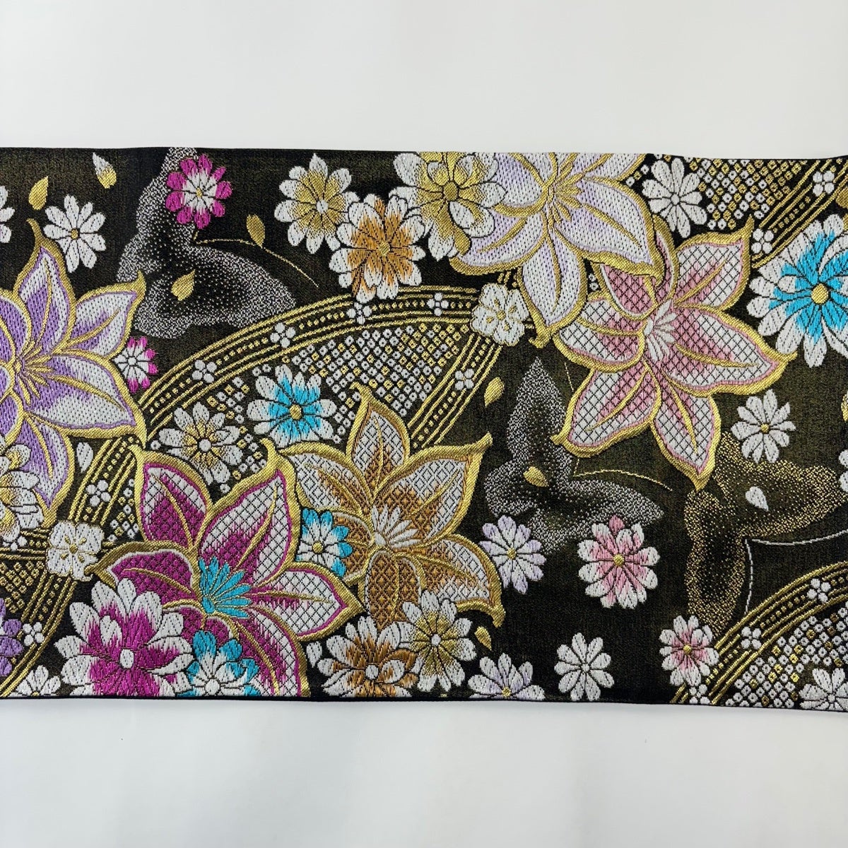 袋帯 秀品 草花 蝶 唐織 箔 黒 六通 正絹