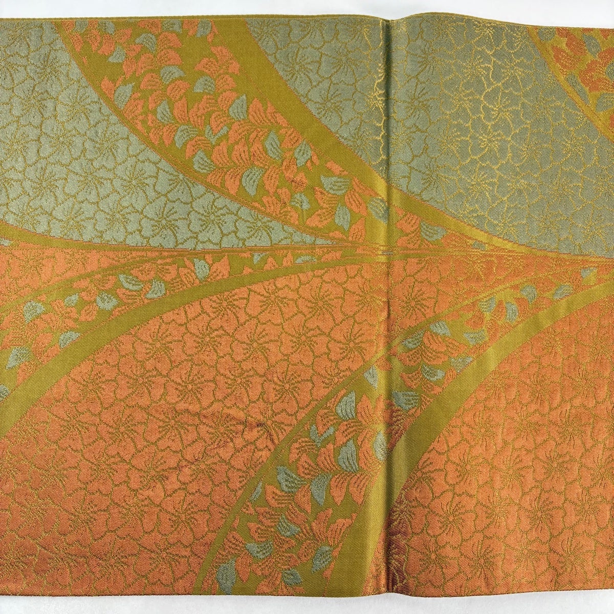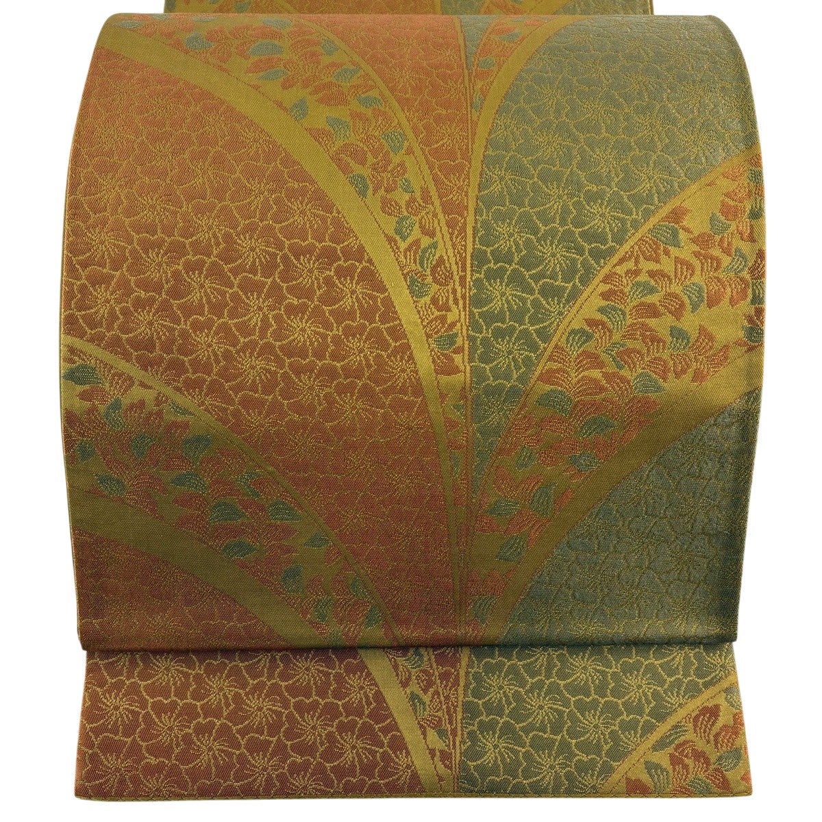 袋帯 秀品 桜 葉柄 茶緑色 六通 正絹